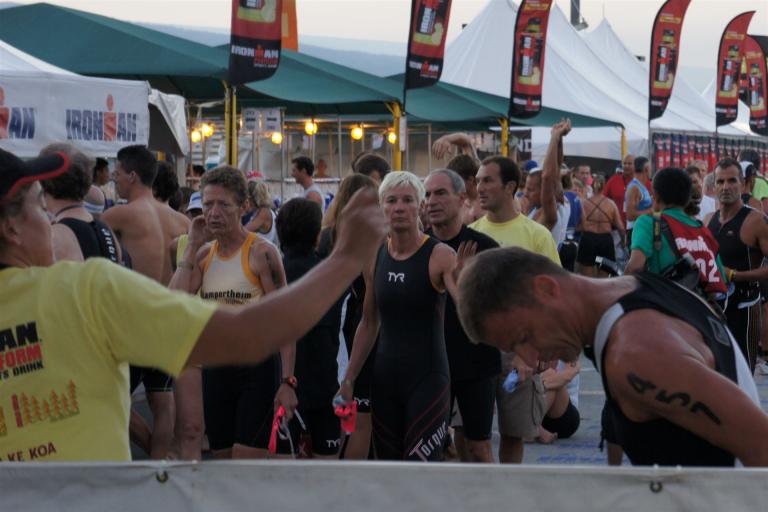 Gott sei Dank ist meine Erkältung inzwischen wieder abgeklungen. Trotz aller Vorsichtsmaßnahmen war ich etwas verschnupft. Aber jetzt ist alles wieder in Ordnung. Ich brauche mir keine Gedanken betreffend dem Wettkampf zu machen. Es gibt heute auch keinen Kaffee vom Kaffeeboot. Danach geht es zurück zum Hotel und wir frühstücken gemütlich. Mein Kreislauf hat sich noch nicht stabilisiert. Ich lege mich etwas hin. Um 11:30 Uhr nehme ich dann meine Beutel und fahre mit dem Rad zum Check-In. Um 12:00 Uhr beginnt das Einchecken. Es stehen ganz viele Kontrolleure da. Die Sache geht relativ zügig. Es werden die Bremen geprüft. Der Radhelm angeschaut und dann bekommt man einen Aufkleber aufs Rad. Anschließend bekommt man eine Person zugeteilt, die mit dem Athleten zusammen das Fahrrad und die Beutel verstaut. Ich habe eine ganz nette Triathletin zugeteilt bekommen, die ebenfalls Langdistanz macht. Sie erklärt mir, dass es für sie eine ganz tolle Erfahrung ist, so viele Triathleten zu treffen. Sie fragt mich woher ich kommen und wo ich mich qualifiziert habe. Sie startet nächstes Jahr in Kanada. Sie hat bereits mehrere Ironmans gemacht. Sie erklärt mir die Wege und wo was ist. Man kommt aus dem Wasser und rennt zuerst durch die Duschen. Danach gibt es den Beutel und dann kommen die Umkleidezelte. Danach geht es in die Radwechselzone. Die Wege, die man zu Fuß machen muss sind relativ lange. Der Helm muss am Rad bleiben, den Rest lasse ich im Beutel. Nach dem Rad kommt man wieder an der gleichen Stelle zur Wechselzone, man bekommt sein Rad abgenommen, dann geht es wieder zu den Beuteln, ins Umkleidezelt und durch die Wechselzone auf die Laufstrecke. Ich bekomme alles von der Dame erklärt. Danach begleitet sie mich wieder nach draußen. Man darf nicht alleine auf dem Gelände herumlaufen. Zum Abschied drückt mich die Dame noch einmal ganz herzlich und wünscht mir viel Glück. Das ist schon toll organisiert. Den Nachmittag verbringe ich dann ganz gemütlich im Apartment mit Mail schreiben, Tagebuch schreiben und lesen.