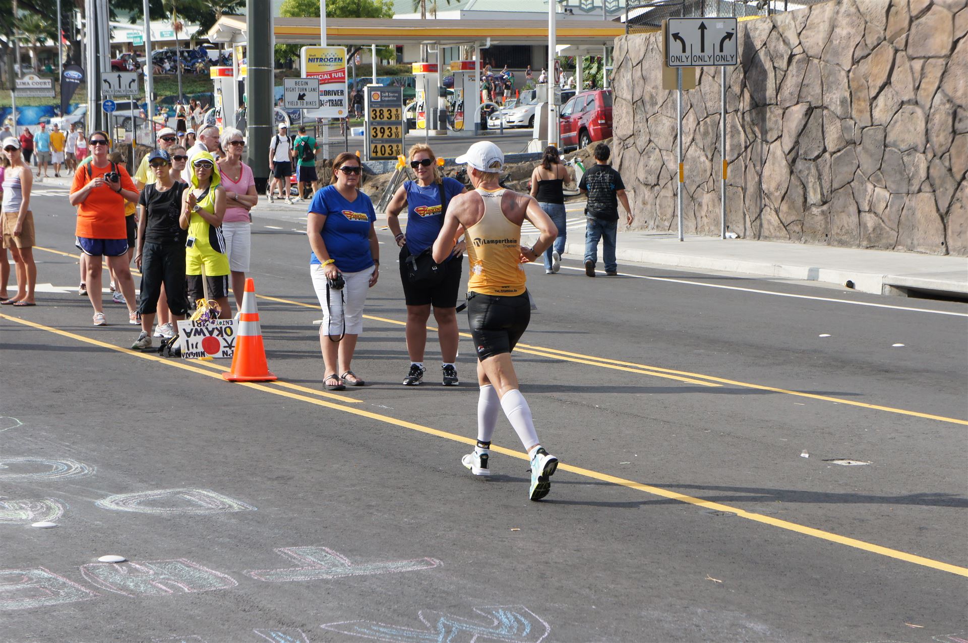 Oben angekommen denkt man, jetzt lass ich es laufen. Aber sobald man über der Kuppe ist wundert man sich, dass man kein Tempo auf den Tacho bekommt. Der Gegenwind macht einem einen Strich durch die Rechnung. Man muss auch abwärts reintreten um etwas Geschwindigkeit zu bekommen. Man hat keinerlei Ruhephase, da man ständig reintreten muss um vorwärts zu kommen. Die ganze Strecke ist mit Meilen und Kilometer ausgezeichnet. Das finde ich eine super Sache. Irgendwann erkenne ich, dass wir gleich wieder in Kona sind. Ratz fatz und wir sind wieder in der Wechselzone. Am Eingang der Wechselzone stehen Helfer und nehmen einem das Rad ab. Dieses Mal bin ich schlauer und ziehe gleich meine Schuhe aus. Ursprünglich wollte ich in der Wechselzone noch schnell auf die Toilette aber im Eifer des Gefechts habe ich das vergessen. An den Beuteln wird wieder meine Nummer ausgerufen und mir wird der Beutel gereicht. Im Zelt kommt sofort wieder eine Helferin und fragt ob ich ein feuchtes Tuch über die Schultern möchte. Ich denke, zu dieser Zeit hatte ich wahrscheinlich schon einen saftigen Sonnenbrand. Die Dame hilft mir beim anziehen der Schuhe und stopf das Gel in meine Tasche. Sie fragt ob ich Sonnencreme möchte und ruft sofort eine weitere Helferin. Eine ältere Dame schmiert mir den Rücken ein. Ich will bereits aufstehen, aber sie bittet mich noch einen Augenblick sitzen zu bleiben. Mein Nacken wäre schon total rot und sie möchte mir noch einmal den Nacken eincremen. Total nett die Leute. Endlich geschafft und ich kann loslaufen.