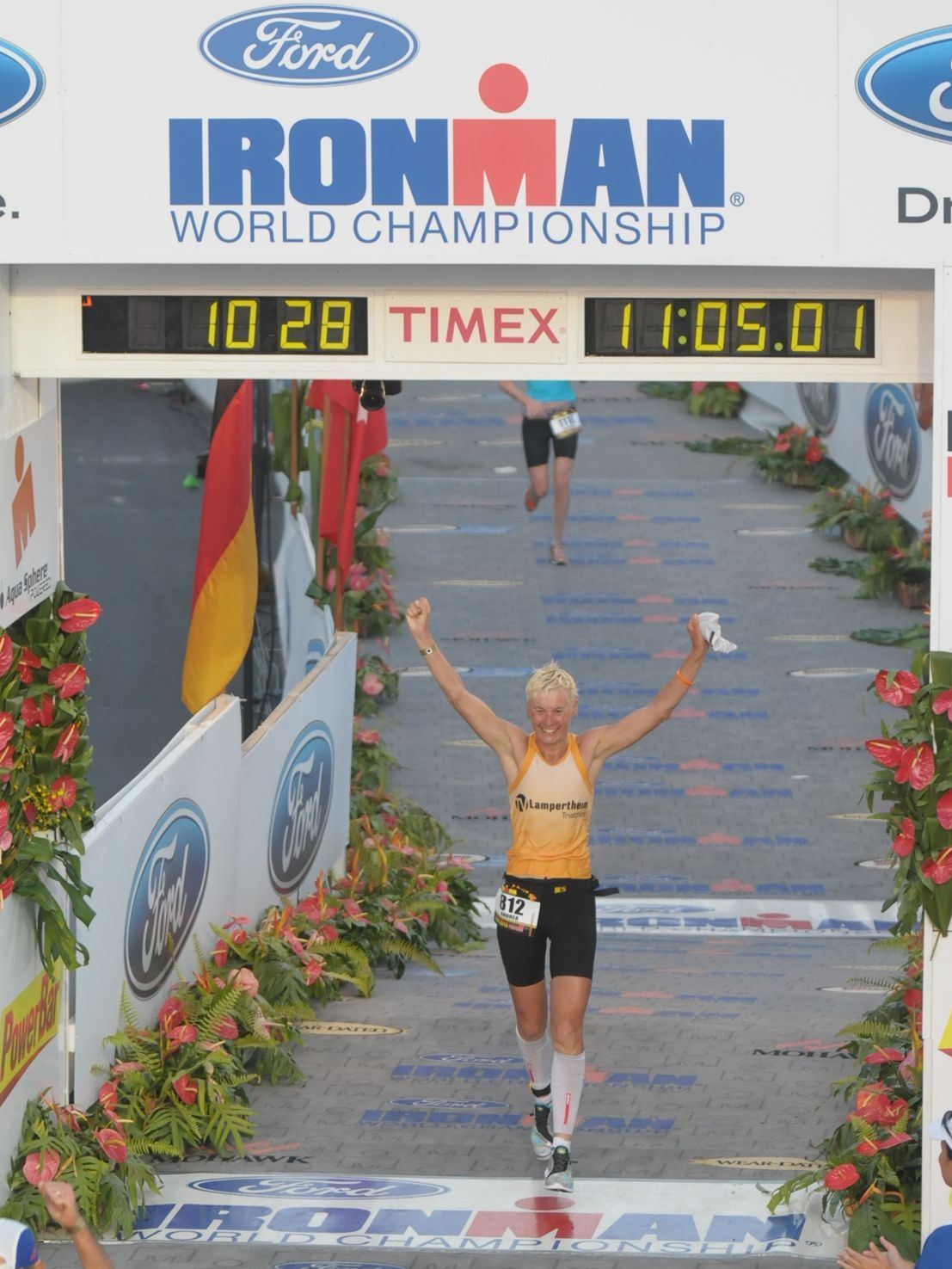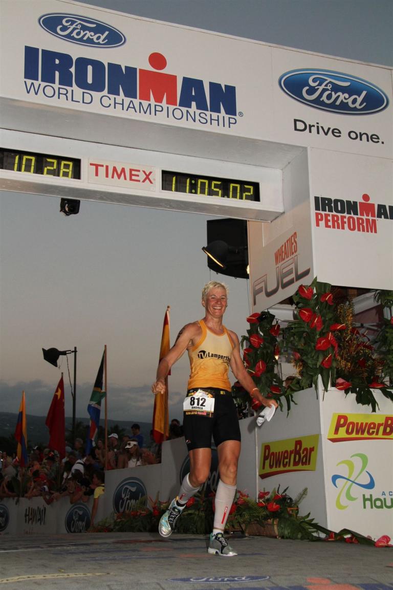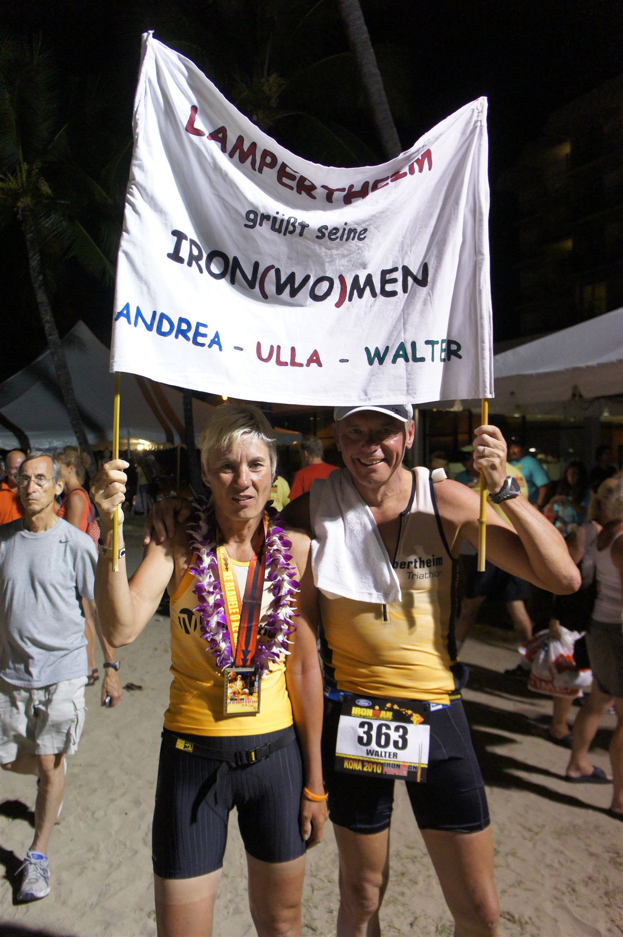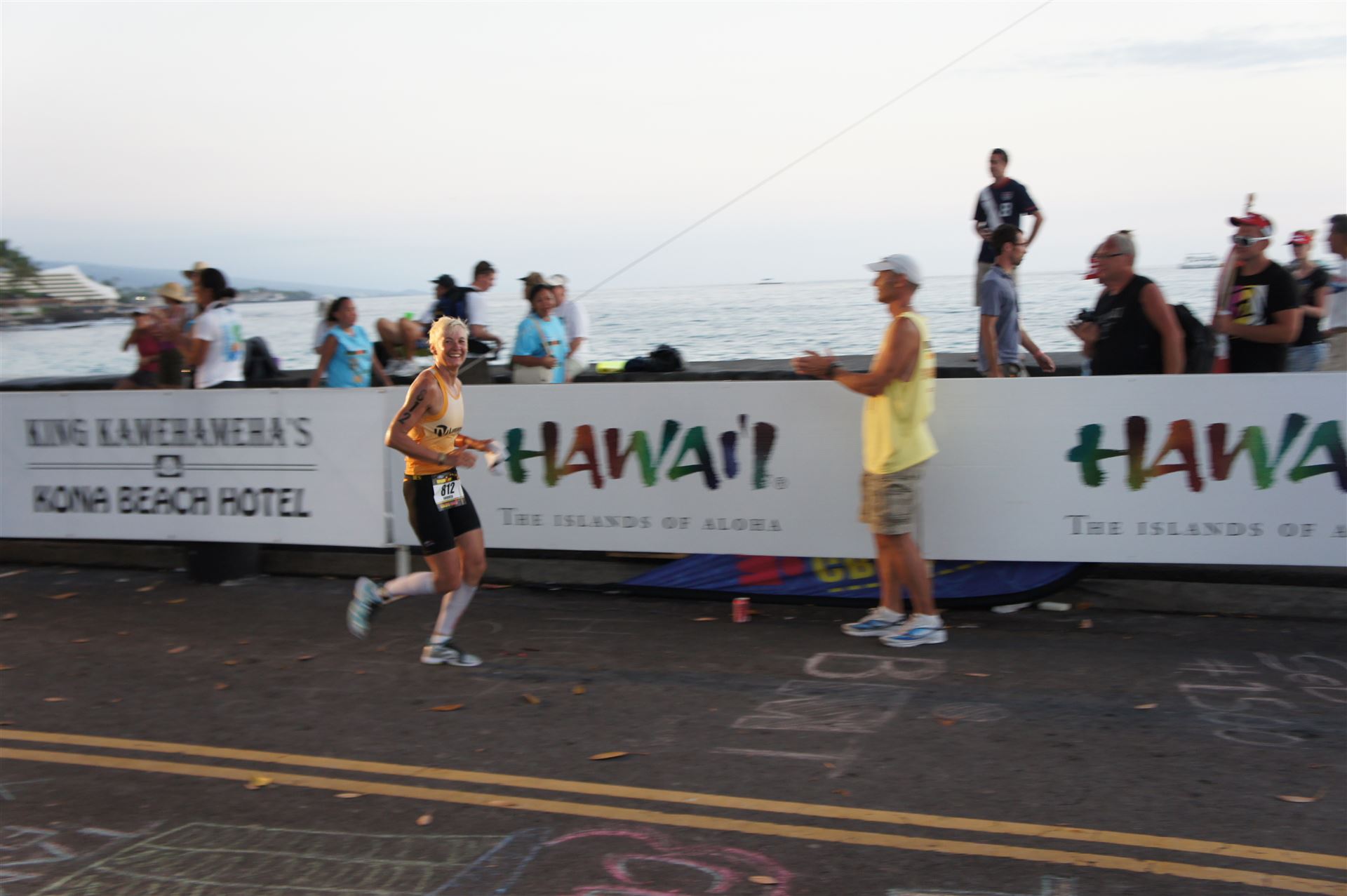 Aufgrund der Wärme, die Sonne strahlt unbarmherzig beschließe ich, nicht am Limit zu laufen. Da ich nicht weiß, wie mein Körper das Klima verkraftet, gehe ich lieber auf Nummer sicher. Ich wähle ein für mich angenehmes Tempo und laufe nun von Verpflegungsstelle zu Verpflegungsstelle. An jeder Verpflegung halte ich an und trinke etwas, ich denke das ist sehr wichtig für den Körper. Ansonsten nehme ich alle greifbaren Schwämme und fülle mir Eiswürfel unter die Mütze. Diese leichte Abkühlung ist eine Wohltat. Irgendwann komme ich auf die Idee und schütte die Eiswürfel ebenfalls in mein Trikot. Bei jedem Schritt macht das Eis lustige Geräusche. Auf der Laufstrecke in Kona sind relativ viele Leute am Straßenrand. Viele rufen die Startnummer und feuern mich an. Ich kann jeden Meter dieses Laufes genießen. Ich fühle mich vom ersten Meter an gut und bin auch zuversichtlich, dass ich ins Ziel komme. Dann geht es auf den Highway. Hier gibt es keinerlei Schatten mehr, der Asphalt strahlt die Hitze ab. Jetzt muss ich „nur“ noch bis zum Energy Lab und wieder zurücklaufen. Das sind nur noch ca. 17 Meilen. Aber es stört mich in keinster Weise. Ich freue mich, winke den Zuschauern zu und versuche möglichst viele Leute zu überholen. Mein Magen fängt leider an etwas zu rebellieren, daher trinke ist vorerst fast nichts und kühle nur von außen. Ich hoffe, das geht vorüber. Während ich raus laufe kommen mir auch viele Leute entgegen. Einige gehen, sie können nicht mehr laufen. Manche Athleten, die ich überhole, rufen mir zu „good job“ das finde ich super nett. Unterwegs steht auch Hannes mit seinen Leuten und machen Party. Da läuft man gleich wieder viel leichter. Dann kommt die Abbiegung zum Energy Lab. Hier ist auch eine tolle Stimmung. Es ist jedoch noch ein langes Stück zum Meer und dann geht es noch einmal rechts ab. Am Wendepunkt stehen 3-4 Männer und feuern die Leute an. Ich tanze etwas mit ihnen und jubel ihnen zu, die freuen sich total. So, jetzt heißt es nur noch zurücklaufen. Nur noch, es sind sicherlich noch 12-13 km. Aber was ist das schon. Mir geht es gut ich fühl mich sauwohl. Wieder auf dem Highway angelangt läuft mir Walter entgegen. Es geht ihm ebenfalls gut er winkt und ruft mir zu. Jetzt habe ich das Gefühl ich bin auf dem Heimweg. Bei den Verpflegungsstellen stehen sie inzwischen mit großen kalten Wasserflaschen da und fragen, ob sie einem Wasser über den Kopf schütten sollen. Ich bin dankbar für jede Abkühlung und sage nicht nein. Vor mir läuft ein junger Mann, auf einmal bleibt er stehen, die Beine ganz starr. Er hat einen furchtbaren Krampf. Ich frage ihn, ob ich ihm helfen kann, er winkt jedoch nur ab und sagt, ich soll weiterlaufen. Die Strecke zurück zieht sich dann doch noch. Ich halte noch immer an jeder Verpflegungsstelle an, ich gehe auf Nummer sicher. Unterwegs hatte mal mein rechter Oberschenkel etwas weh getan, aber das ging irgendwie wieder weg. Ein Radfahrer fährt ein Stück auf dem Highway neben mir her und ruft Lampertheim Go. Es ist ein Deutscher der mich anfeuert. Er meinte ich wäre sicherlich ein Daylight Finisher. Ich rufe ihm zu, dass ich keine Ahnung habe, da ich keine Uhr dabei habe. Er meinte nur, du bist sicherlich noch bei Tageslicht im Ziel. Auf dem letzten Stück habe ich eine Frau ca. in meinem Alter überholt. Sie hat mir zugerufen „good job“ und sich an mich drangehängt. Wir sind dann eine ganz Zeit zusammen gelaufen. Das fand ich sehr angenehm. Irgendwann hat sie abreißen lassen, ich hab dann etwas langsam gemacht und gesagt, sie solle doch mit weiterlaufen. Sie meinte dann, nein sie kann nicht mehr so schnell und dann bedankte sie sich noch, dass ich sie mitgezogen habe. Dann kommt lediglich noch ein Anstieg auf dem Highway, wobei man inzwischen jeden Höhenmeter in den Knochen merkt. Wieder in Kona angekommen geht es nur noch die Palani Road runter. Abwärts laufen ist inzwischen auch nicht mehr so angenehm. Jetzt noch ein Quadrat laufen. Hier überhole ich noch einige. Es sitzen noch immer viele Zuschauer am Straßenrand und rufen einem zu, dass man gleich im Ziel ist. Auf dem Ali Drive nehme ich Tempo raus und genieße jeden Meter. Ganz viele Leute jubeln mit zu, rufen meine Startnummer oder meinen Namen und klatschen mich ab. Das Gefühl ist unbeschreiblich. Inzwischen kann ich hören, wie der Sprecher bereits meinen Namen, Nation…..und ähnliches ruft. Jetzt sind es nur noch ein paar Meter und ich bin im Ziel. Es geht mir super gut und ich weiß schon jetzt, dass wenn ich die Möglichkeit habe, wieder nach Hawaii kommen werde. Im Ziel bekommt man Blumen und ein Handtuch umgehängt. Eine Betreuerin kümmert sich um mich und führt mich nach hinten. Ich sage ihr, dass es mir gut geht und ich nach meinem Mann suche. Sie fragt mich noch mehrmals ob alles in Ordnung ist bevor sie mich alleine lässt. In der Menge erkenne ich dann auch schon Werner. Er ist super stolz auf mich. Erstaunlicherweise habe ich sofort Lust auf Cola und Pizza. Was ich dann auch in mich rein stopfe. Ich hole noch mein Finisher Shirt und meine Urkunde ab. Zum Nachtisch esse ich noch Vanille-Eis. Das einzige was mir weh tut sind die Füße. Durch die nassen Schuhe und Strümpfe (es war ja alles klatsch nass, da ich ja ständig Wasser über mich geschüttet habe) habe ich mir einige Blasen sogar auf den Fußsohlen gelaufen. Ich lasse noch ein Foto mit der Medaille machen und ein Foto noch zusammen mit Werner. Nach und nach kommen Walter und Ulla ins Ziel. Es geht beiden auch sehr gut. Wir lassen noch ein Foto von uns dreien machen. Dann holen wir unsere Sachen und fahren mit den Rädern zurück ins Hotel. Es war ein unvergesslicher Tag.