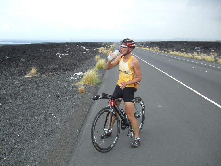 Jetzt heißt es tapfer weitertreten und den Lenker festhalten. Teilweise sind die Böen so stark, dass das Rad um einen Meter versetzt. Für mich geht es jedoch einigermaßen, da ich bereits Sonntags meine Erfahrung mit dem Wind gemacht habe. Ich kann relativ gut mit diesen Böen umgehen. Problematisch ist lediglich ab und an das Trinken bzw. Schalten. Je nach dem, wie stark die Böen gerade sind lasse ich beides ausfallen. Es ist jedoch beruhigend, dass Männer wie Frauen mit dem Wind kämpfen. Dann kommt der Wendepunkt und man weiß genau, dass dieser besch… Wind wieder kommt. Man fährt jetzt mehr abwärts und daher auch schneller, der Wind ist jedoch derselbe. Ich motiviere mich indem ich mir sage weitertreten und Lenker festhalten. Und siehe da, es funktioniert. Nach dem wir wieder rechts in Richtung Kona abbiegen ist der furchtbare Seitenwind vorüber. Jetzt bläst er lediglich von vorne. Ich schaue ab und an auf meinen Tacho und bin bestürzt, dass ich keine Geschwindigkeit bekommen. Aber es ist beruhigend, dass es den anderen ebenso geht. Man soll es nicht glauben, aber dieser Gegenwind bleibt die ganze Strecke über. Teilweise gibt es noch ein paar Anstiege, die man sich hoch kämpft.