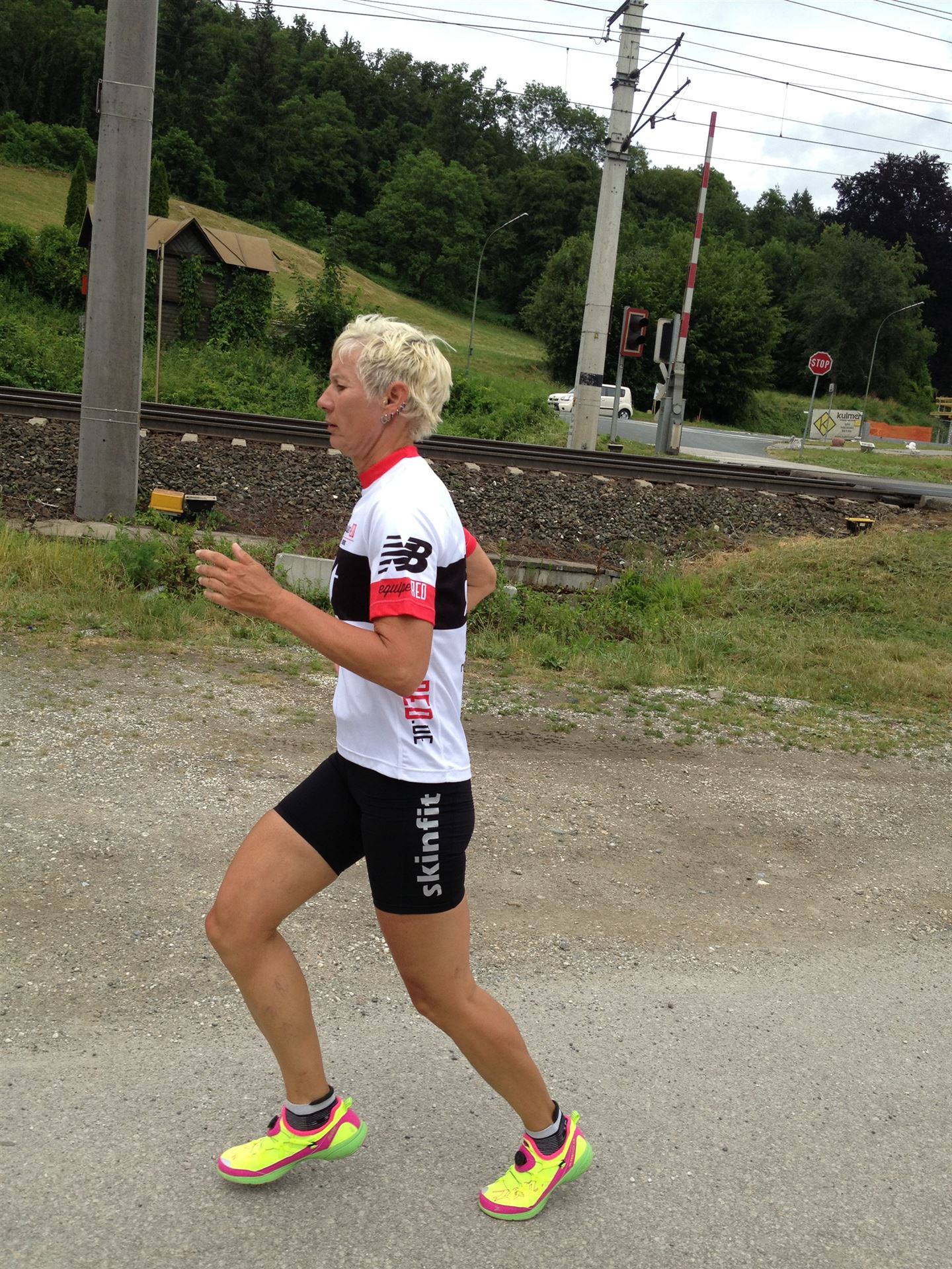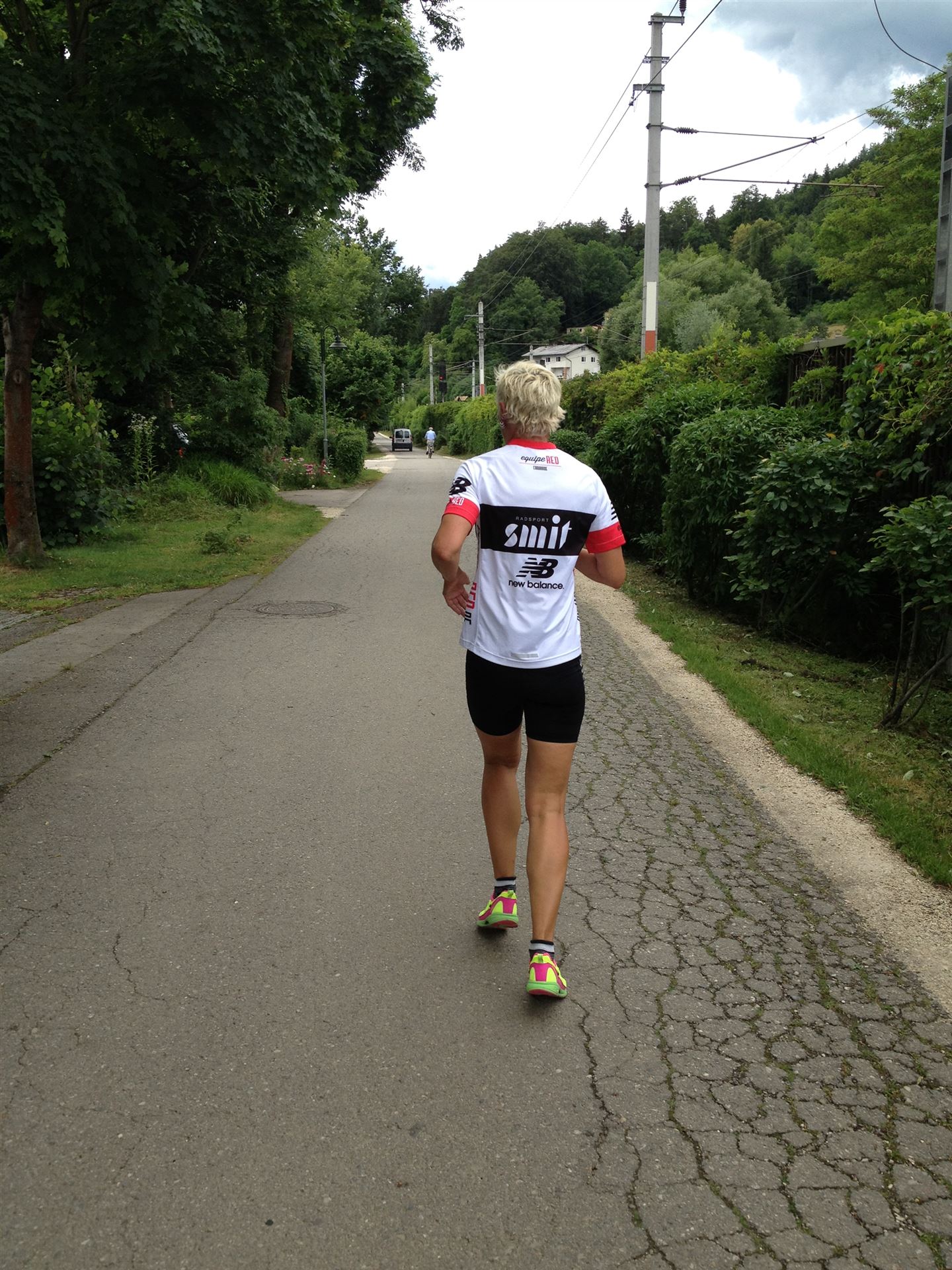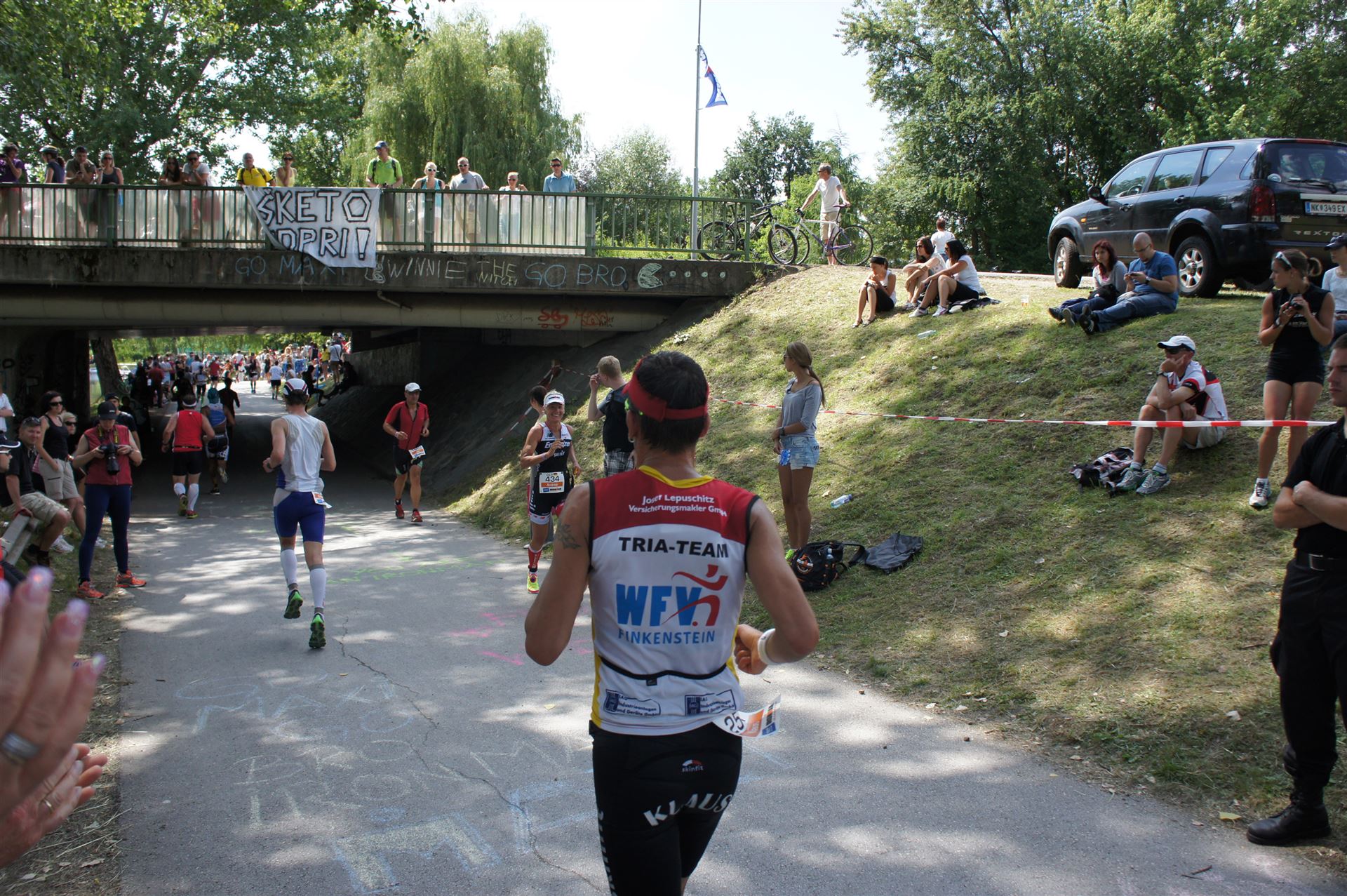Das Wetter ist prima, die Temperatur liegt bei ca. 26 Grad im Schatten. Es werden 2 Runde á 21 km gelaufen. Von der Wechselzone geht es am Anfang entlang der Lende in Richtung Krumpendorf. In Krumpendorf läuft man eine kurze Strecke durchs Schwimmbad. Es ist schon etwas ungewöhnlich die Badegäste auf den Grünanlagen liegen zu sehen. Danach geht es entlang der Lende nach Klagenfurt Stadtmitte. Einmal um das Wahrzeichen, den Lindwurm herum und wieder zurück in Richtung Ziel. Die Strecke ist sehr abwechslungsreich, es stehen viele Freunde, Familie und Zuschauer an der Strecke. Aufgrund des Gegenverkehrs der anderen Läufer hat man immer etwas zu schauen. Das Anfeuern durch die Zuschauer puscht jeden Athleten. Die Schmerzen sind alle vergessen, man genießt die tolle Stimmung. Auf der 2. Runde habe ich leichte Probleme mit den Oberschenkeln und den Waden. Ich lasse mich davon jedoch nicht beirren, einfach nur weiterlaufen. Die Unterführung nach Klagenfurt sowie die Bordsteinkanten in der Stadtmitte bereiten mir etwas Probleme, aber egal, da macht man einfach etwas langsam.