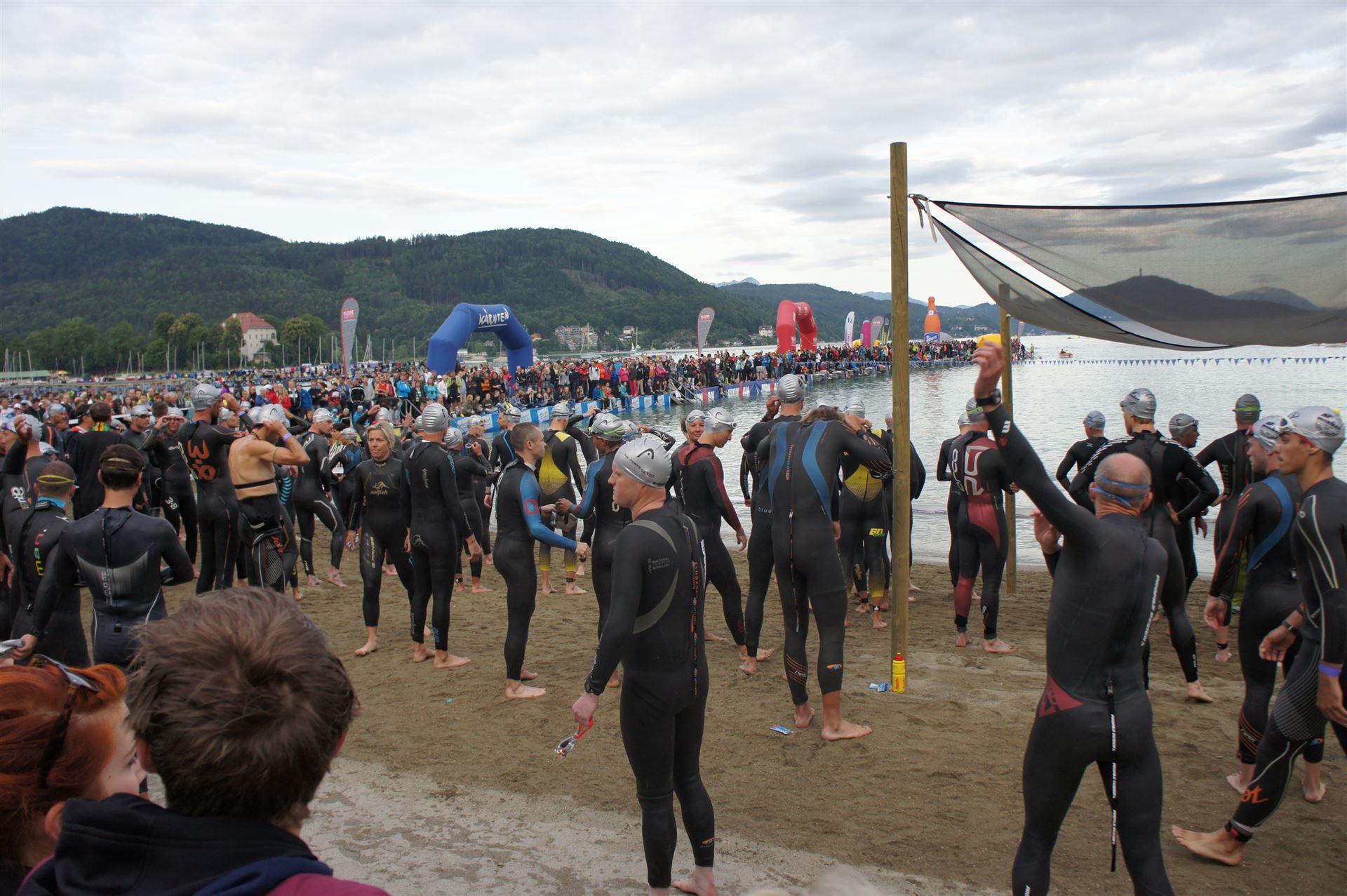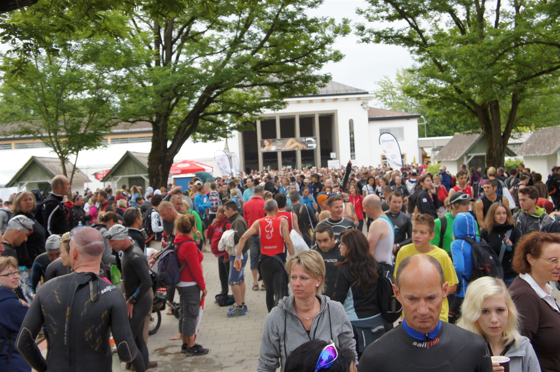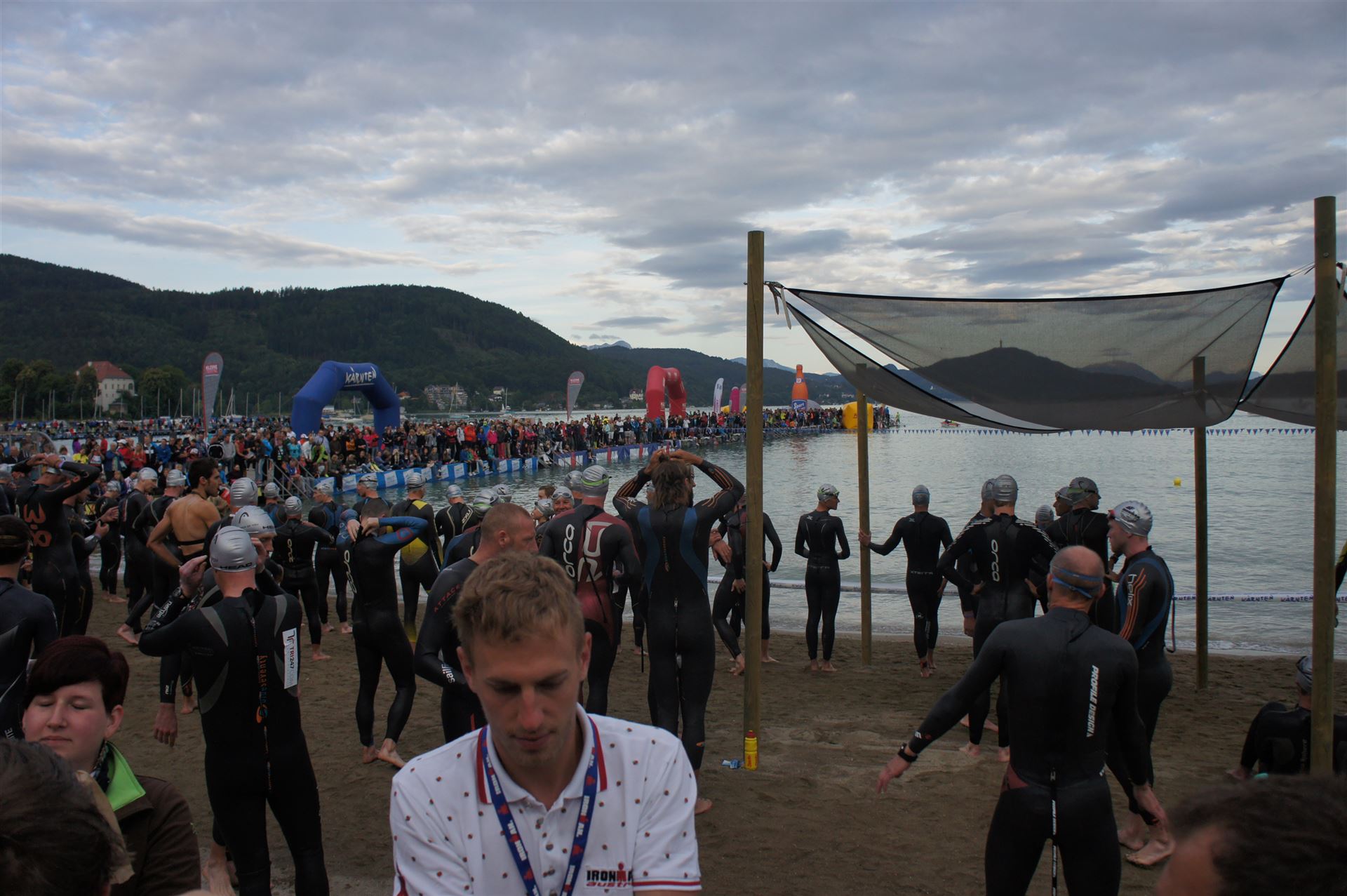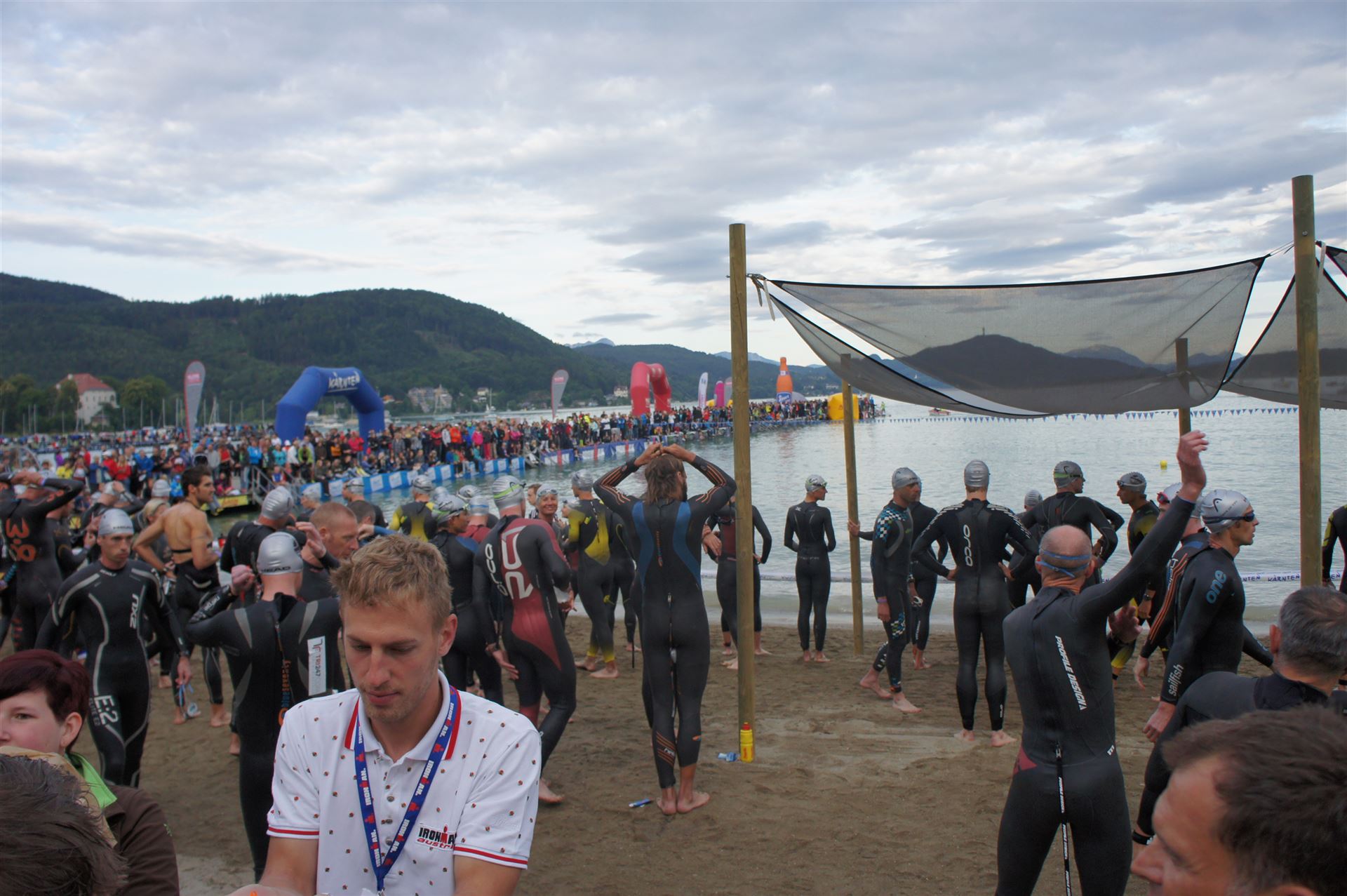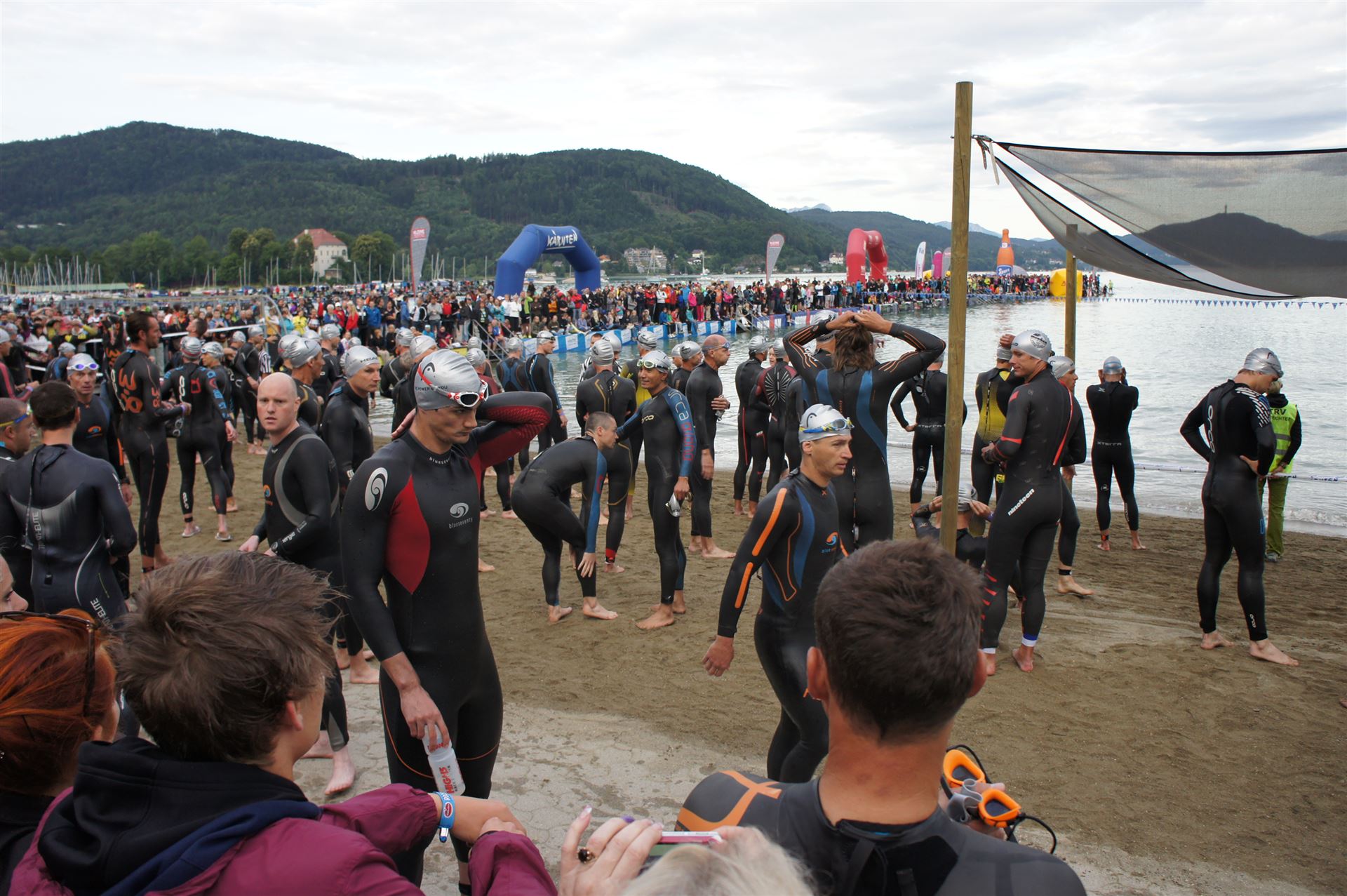 Wir gehen langsam zum Start in das Strandbad, es sind bereits viele Athleten und Zuschauer versammelt.