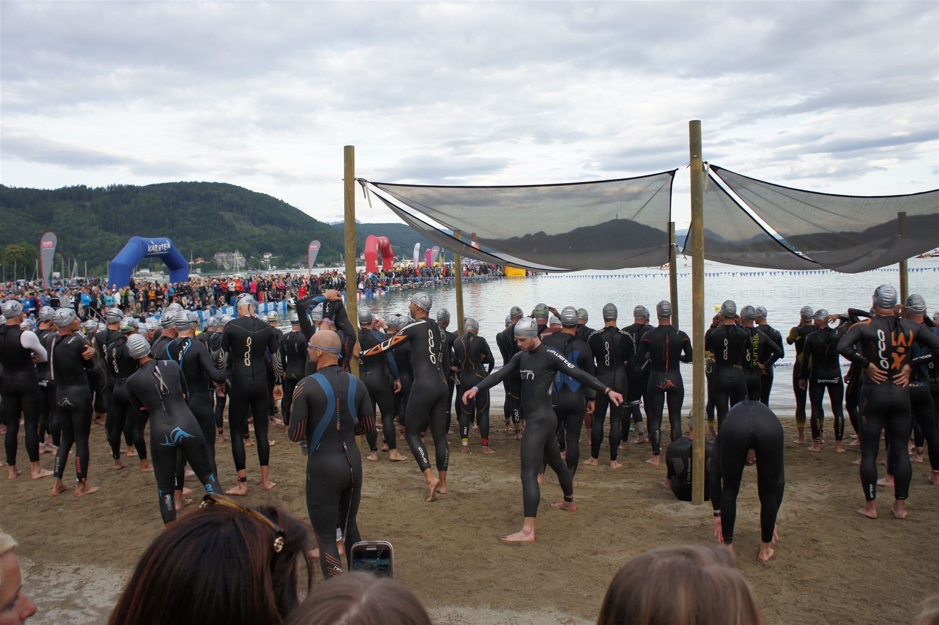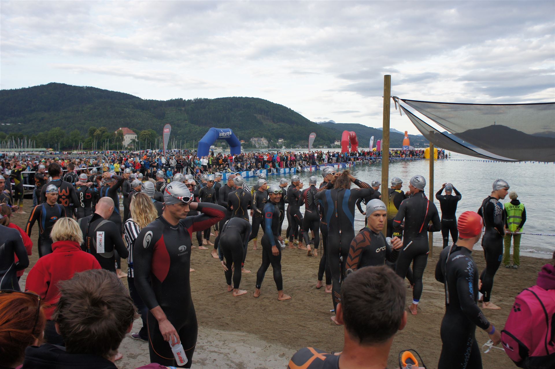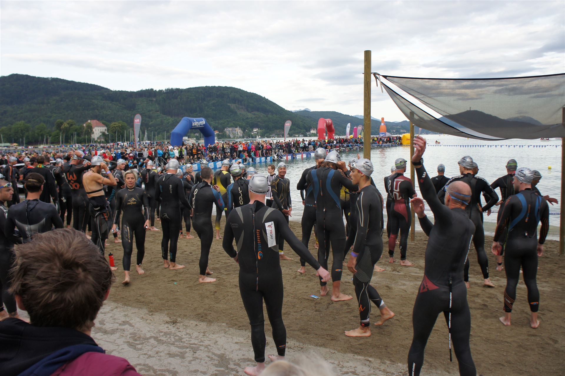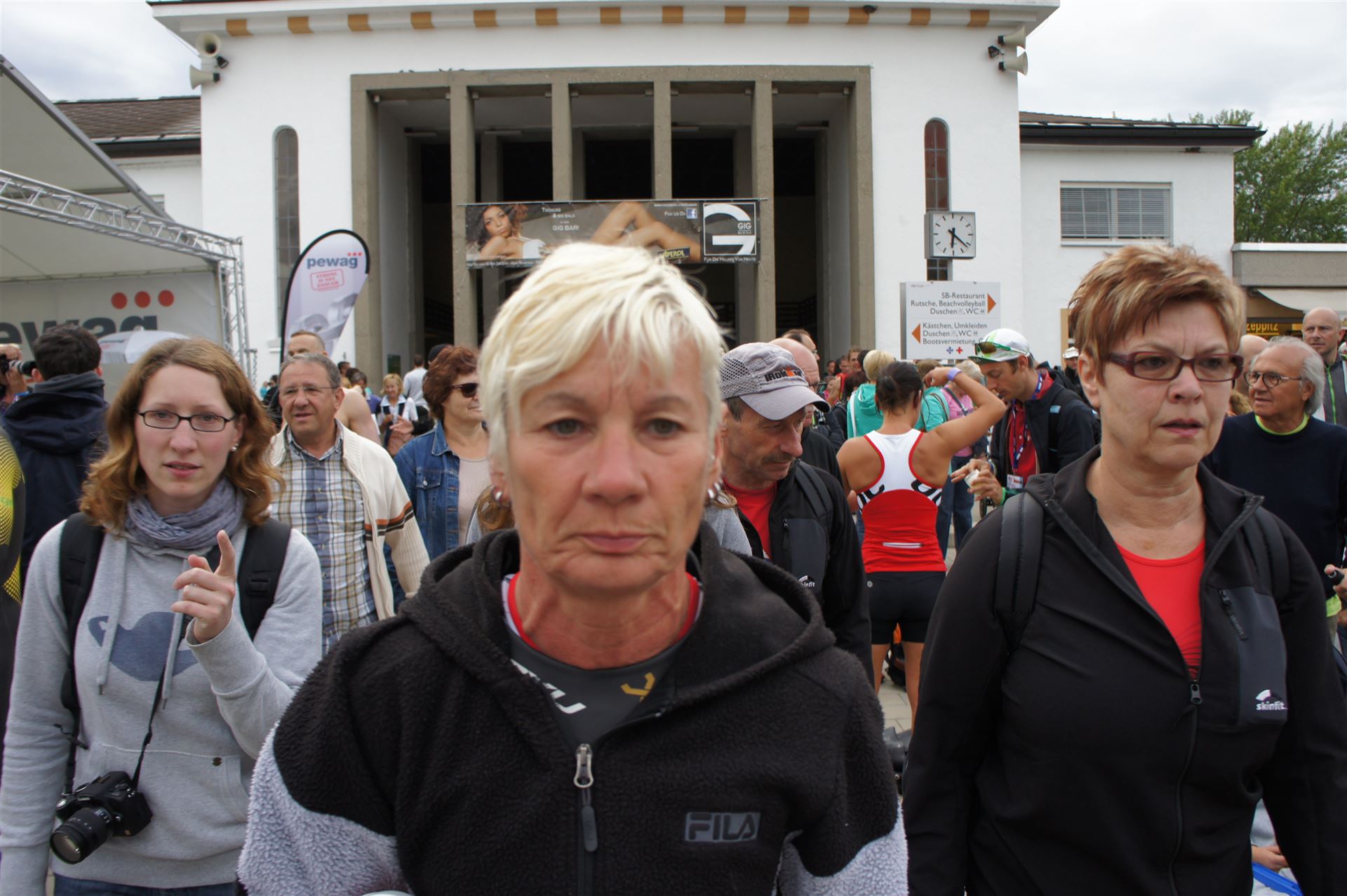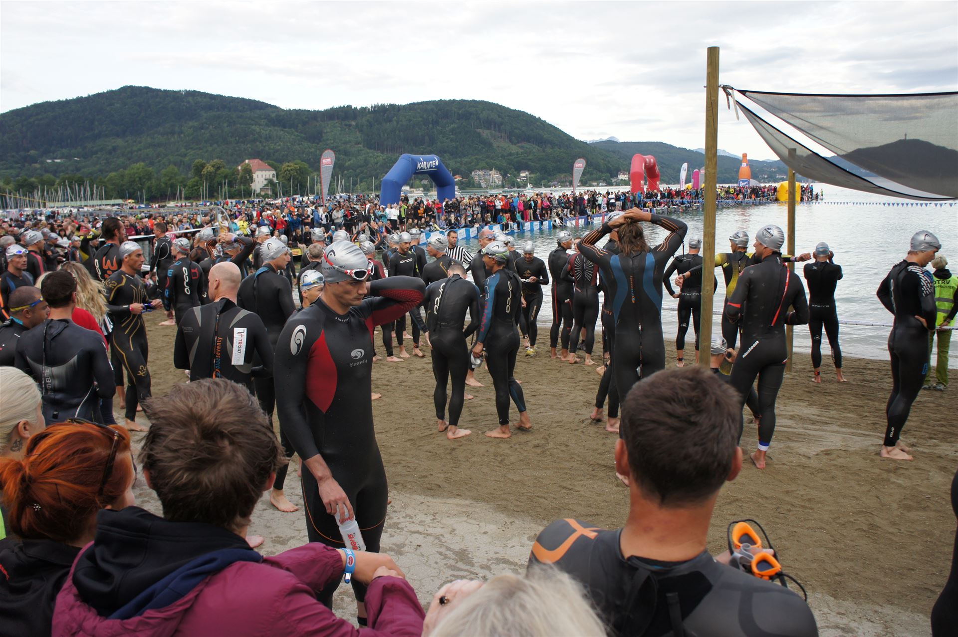 Wir gehen langsam zum Start in das Strandbad, es sind bereits viele Athleten und Zuschauer versammelt.