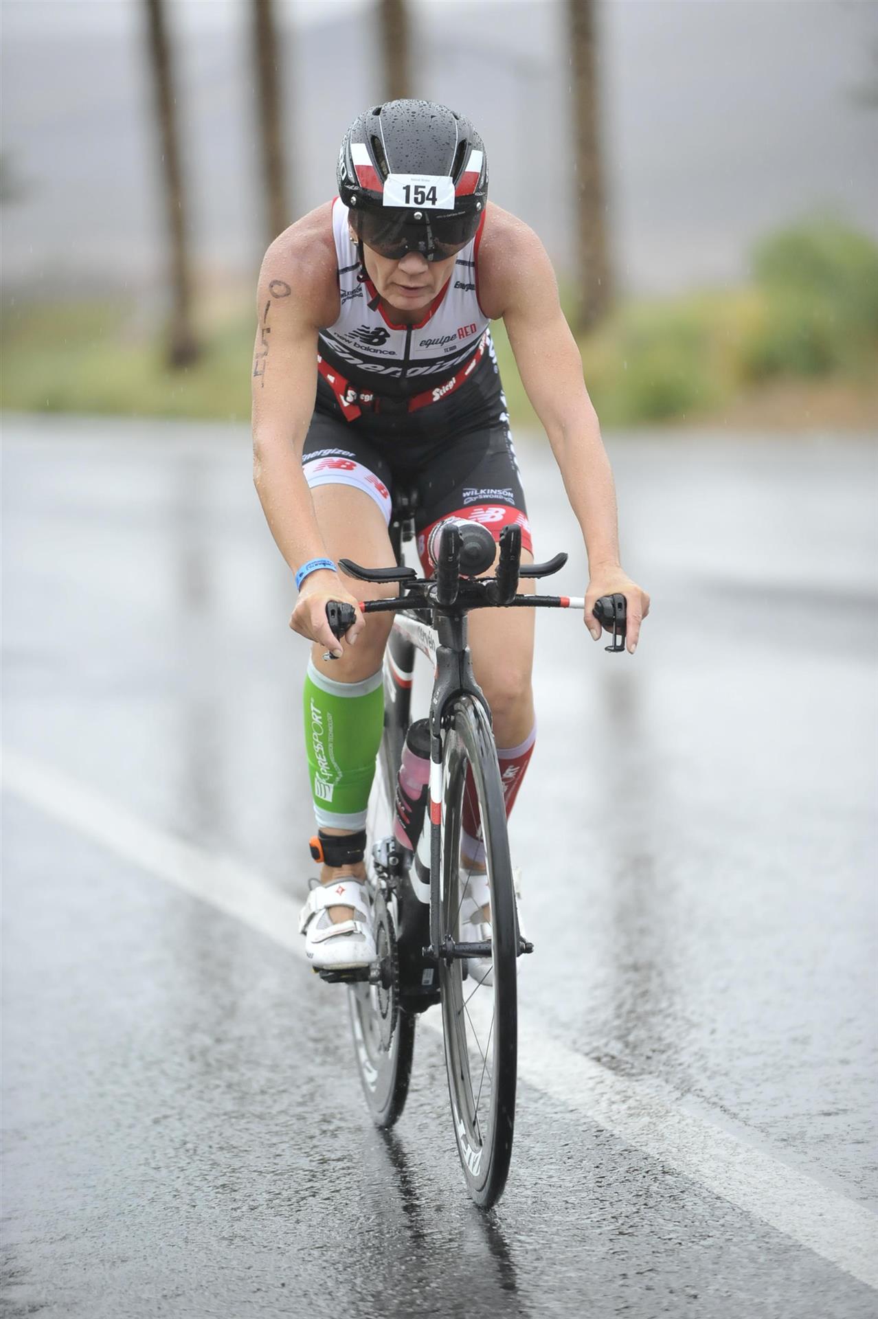 Heute ist Renntag. Um 3.30 Uhr klingelt der Wecker, mörderische Zeit zum aufstehen. Nachdem ich einigermaßen wach bin gibt es eine Tasse Kaffee sowie Weißbrot mit Honig. Normalerweise kann ich um diese Zeit noch nichts essen, aber das muss nun mal sein. Um 4:30 Uhr öffnet die Wechselzone. Draußen regnet es in strömen, das darf doch nicht wahr sein. Da reist man viele Kilometer nach Las Vegas mit einer Durchschnittstemperatur von über 30 Grad Celsius und 10 Regentagen im Jahr und was ist am Wettkampftag - es regnet in strömen. Glücklicherweise liegt unser Hotel direkt am Start, der Weg bis zur Wechselzone dauert circa 2 Minuten. Luft geprüft, Getränke ausgefüllt sowie Verpflegung gepackt. Gott sei Dank habe ich eine Taschenlampe dabei, um diese Zeit ist es noch sehr dunkel. Bis alles erledigt ist bin ich klatsch nass. Da ich noch etwas Zeit habe gehe ich noch einmal ins Apartment. Da der See sehr warm ist, ca. 30 Grad, ist Neoprenverbot.