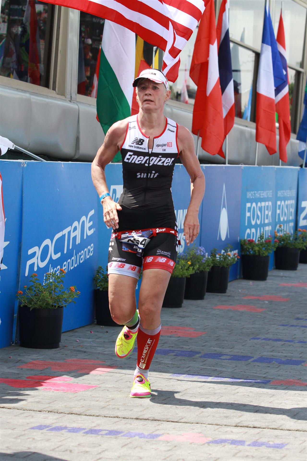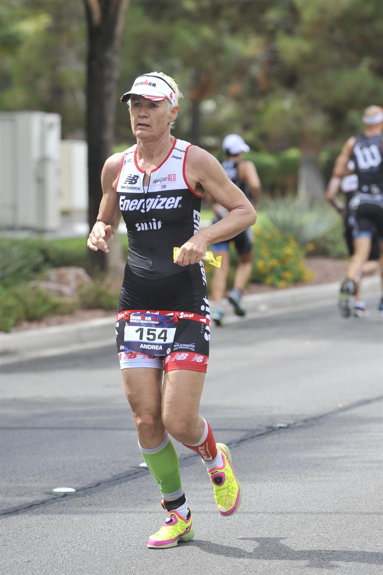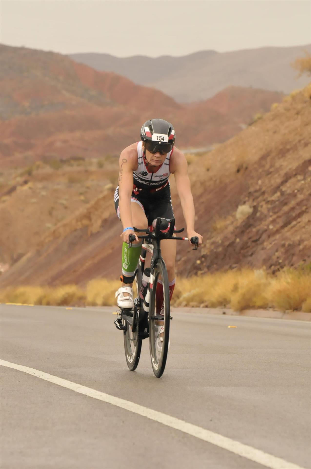 Um 6.30 Uhr gehen dann die männlichen Pros an den Start. 4 Minuten später die Profi-Frauen. Die nächste Startgruppe sind die Frauen 50+, also meine Startgruppe. Pünktlich um 6.38 Uhr fällt der Startschuss. Das Wasser ist total braun von Sand und Schlamm, man kann die Hand nicht vor den Augen sehen. Die Schwimmstrecke ist relativ einfach. Einfach einmal in eine Richtung und wieder zurück. Vom Schwimmausstieg bis zur Radwechselzone ist ein langer Weg. Das Schwimmen war okay für mich, wobei ich etwas erstaunt über meine relativ schlechte Zeit bin. Nach einigen Gesprächen mit anderen Athleten zeigt sich, dass viele auch länger geschwommen sind. Evtl. war die Strecke etwas länger, aber egal, jeder musste ja die gleiche Strecke zurücklegen. In der Wechselzone schnell die Radbekleidung an und in Richtung Ausgang. Der Weg auf die Radstrecke ist auch etwas anders. Es geht ein kleiner schmaler Weg steil nach oben. Da ich bereits meine Radschuhe anhabe ist das relativ mühsam. Meine Waden "explodieren" fast. Auf dem Rad habe ich teilweise Probleme mit den Waden. Es schüttet weiterhin furchtbar, man kann froh sein, dass es wenigstens warm ist. Zuerst fahren wir ein Quadrat und danach geht es in Richtung Wüste in den Nationalpark. Teilweise sind riesige Pfützen auf der Strasse. Es regnet weiterhin Bindfäden, ich bin etwas vorsichtig bei diesem Wetter. Die Radstrecke ist nicht komplett gesperrt, teilweise fahren Autos, für eine Weltmeisterschaft doch sehr ungewöhnlich. Die Strecke ist wellig, es sind lediglich kleine Hügel, keine richtigen Berge. Diese kurzen Steigungen sind jedoch nicht ohne. Ich fahre mein Tempo und mache mich nicht verrückt. Inzwischen hat man sich an den Regen gewöhnt, die Füße sind etwas kalt, bei den Abfahrten ist es teilweise etwas frisch. Nach ca. 70 Kilometern klart es auf, der Regen hört endlich auf. Die letzten 20 Kilometer gehen in Richtung Las Vegas nach Henderson. In der 2. Wechselzone bekommt man das Rad abgenommen und den Runbeutel gereicht. Schnell ins Wechselzelt umziehen und auf die Laufstrecke. Insgesamt müssen 3 Runden mit jeweils 50 Höhenmeter gelaufen werden, also insgesamt 150 Höhenmeter. Am Anfang geht es ca. 1 bis 1,5 km leicht nach unten, diese Strecke muss man auch wieder hoch laufen. Anschließend geht es an der Wechselzone vorbei und dann kommt ein langer Anstieg. Auf der ersten Runde habe ich ganz schön Probleme mit dieser Steigung. Es fällt mir sehr schwer und ich denke schon darüber nach, wie ich diese Strecke 3 Runden überlebe. Zurück geht es dann angenehm nach unten und meinen Beinen geht es etwas besser. Inzwischen ist auch die Sonne raus gekommen, es ist jetzt deutlich wärmer. Die Versorgung auf der Laufstrecke ist sehr gut. Es gibt ausreichend Wasser zur Kühlung sowie Iso und Cola. Ich bin froh als ich die letzte Runde vor mir habe. Es ist immer wieder erstaunlich, dass man dann doch alles schafft. Auf der ersten Runde hatte ich noch meine Zweifel, aber irgendwie funktioniert das doch. Ich bin froh als ich endlich das Ziel durchlaufen kann. Es geht mir sehr gut, meine Zeit und Platzierung sind mir in diesem Moment völlig egal. Ich habe gefinisht und bin glücklich und zufrieden.