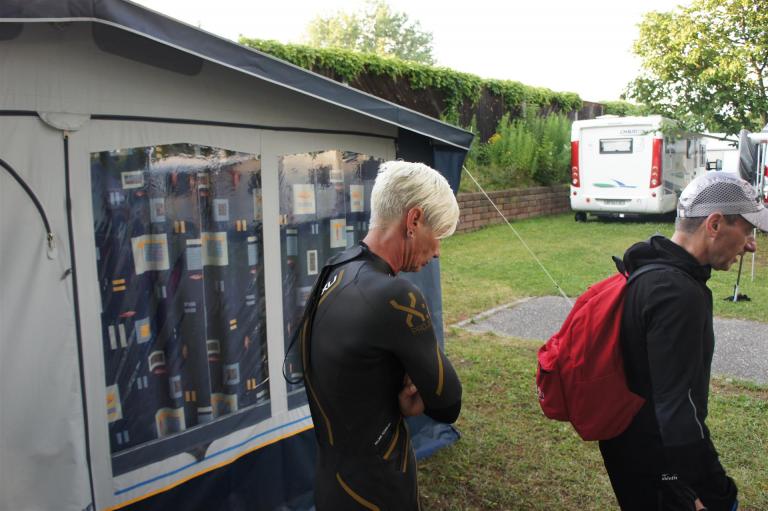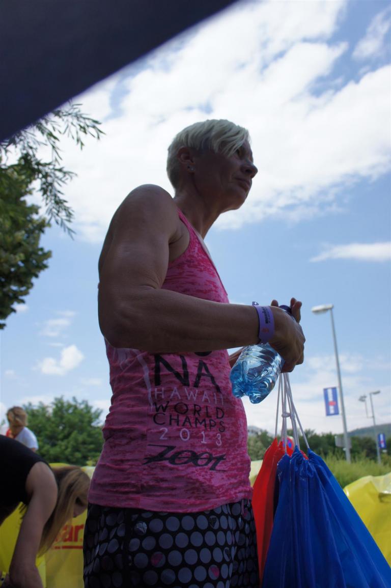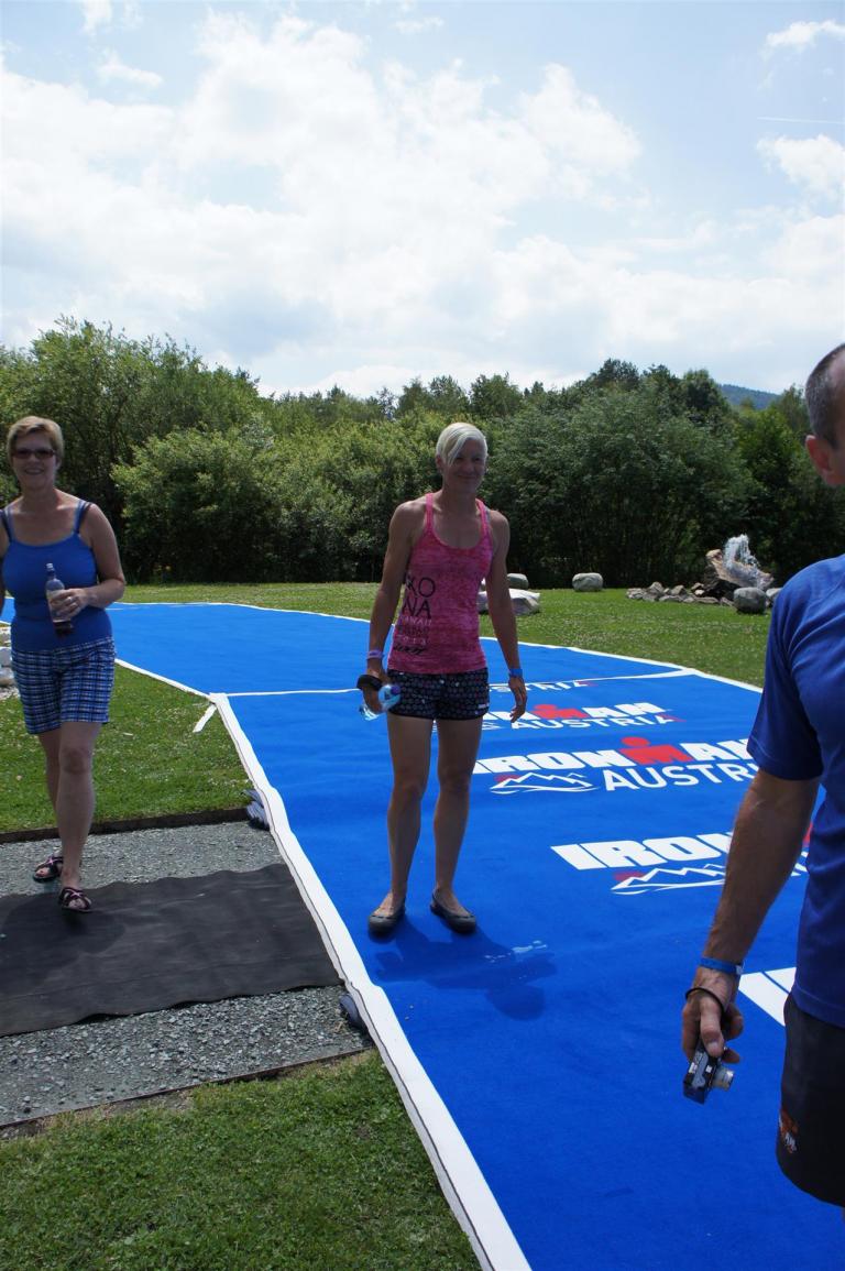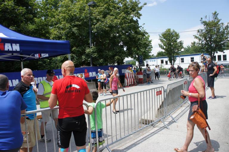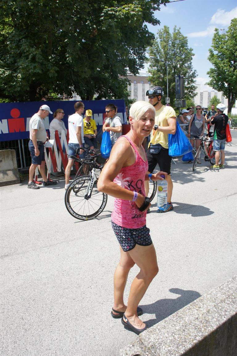 Nach einer Schwimmzeit von 1 Stunde und 11 Minuten verlasse ich das Wasser. Ich bin zufrieden mit meiner Zeit. Der Weg vom Schwimmausstieg bis in die Wechselzone ist relativ lange. Man hat ausreichend Zeit den Neoprenanzug etwas auszuziehen.