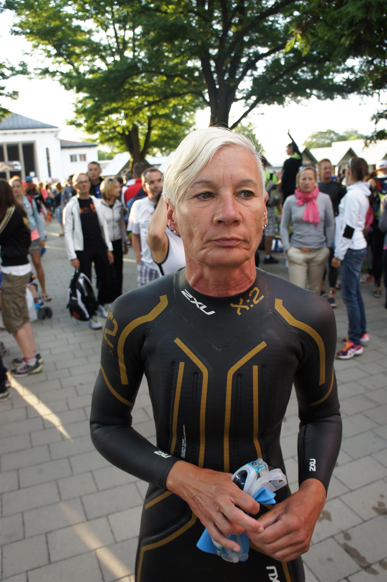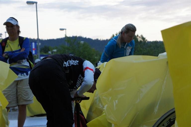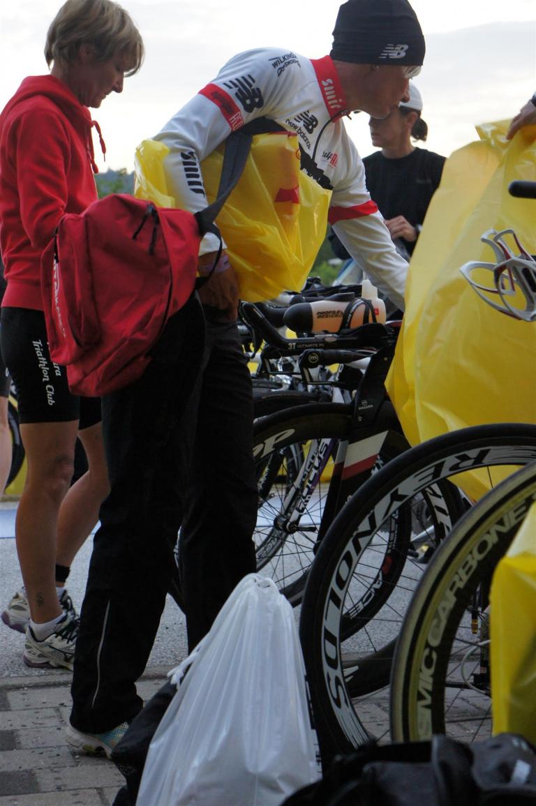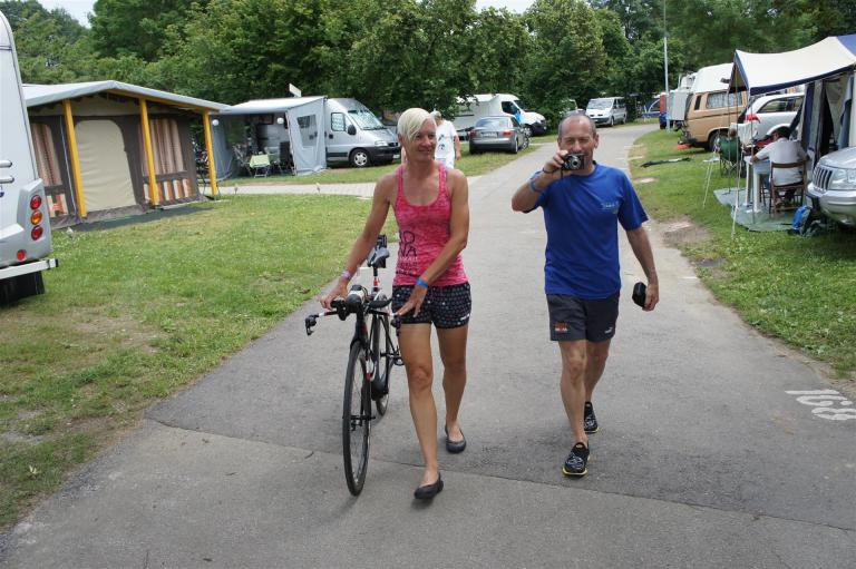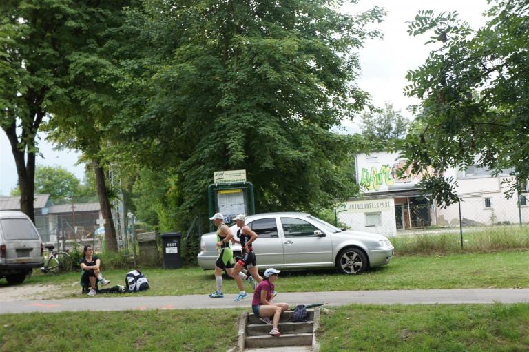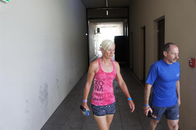 Nach einer Schwimmzeit von 1 Stunde und 11 Minuten verlasse ich das Wasser. Ich bin zufrieden mit meiner Zeit. Der Weg vom Schwimmausstieg bis in die Wechselzone ist relativ lange. Man hat ausreichend Zeit den Neoprenanzug etwas auszuziehen.