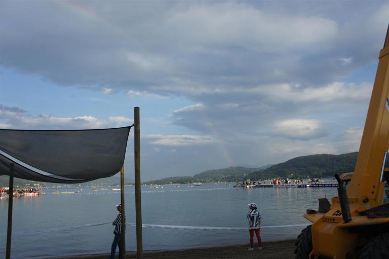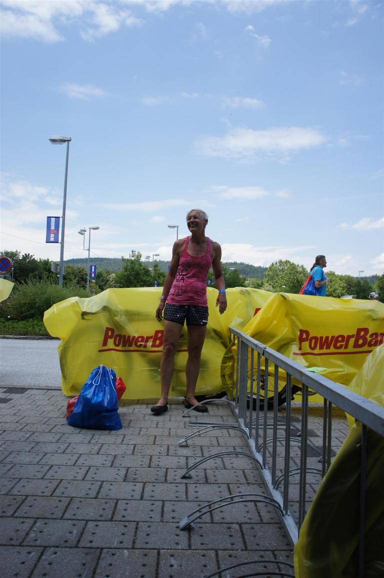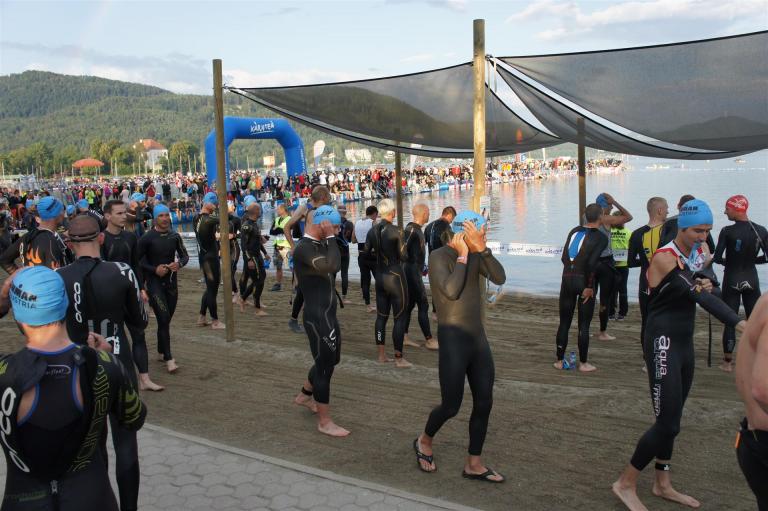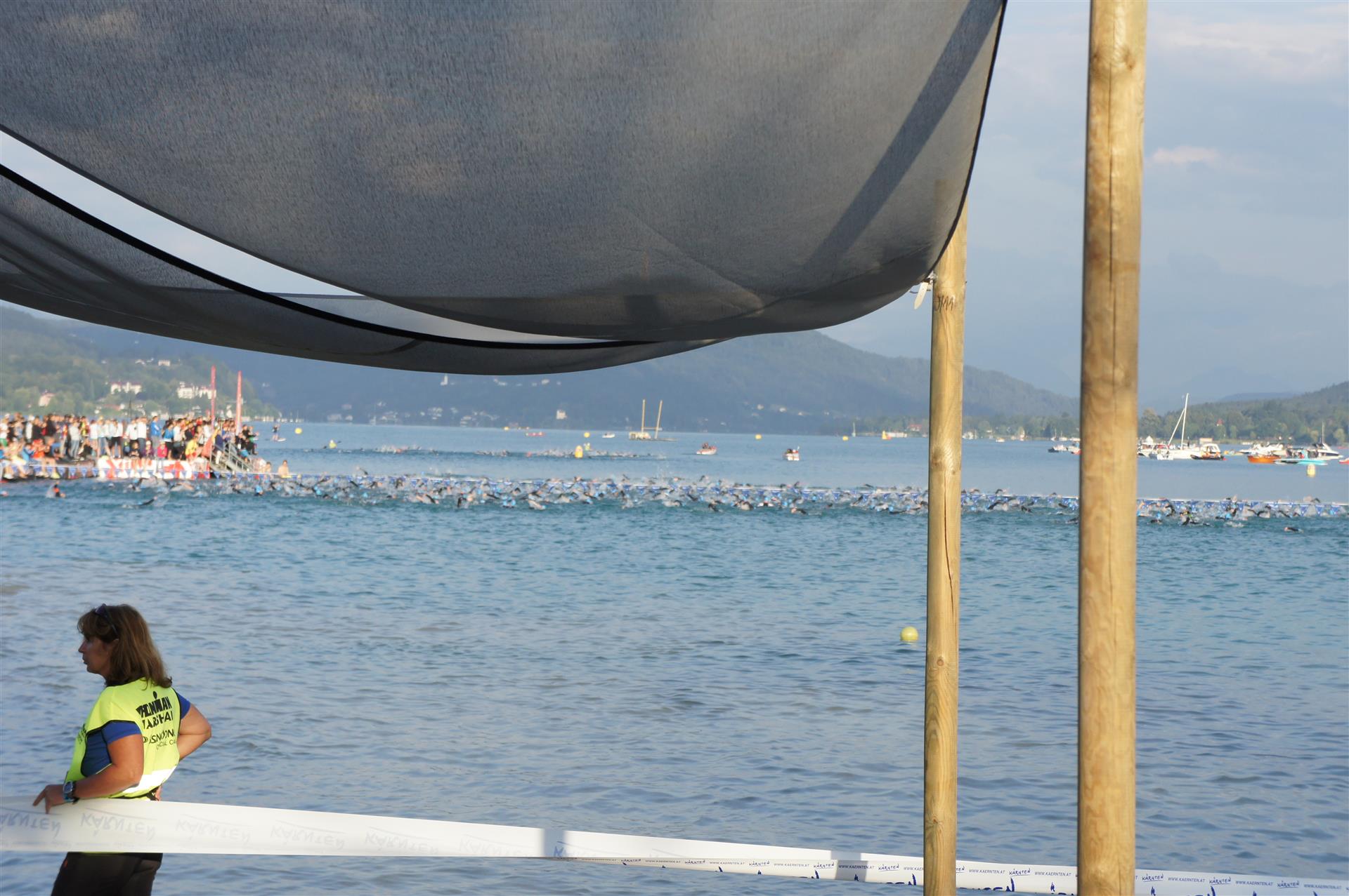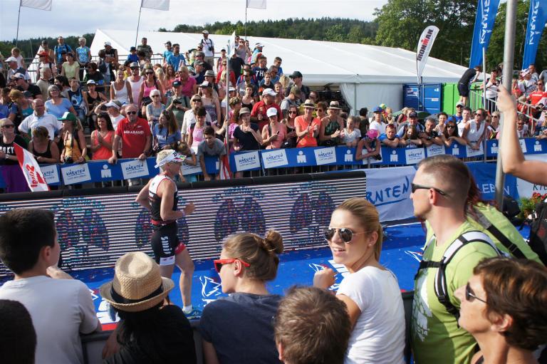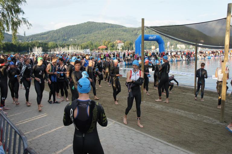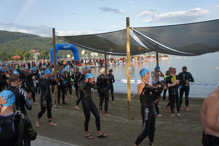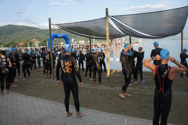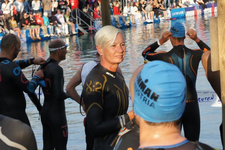 Obwohl ich lediglich eine mittelmäßige Schwimmerin bin macht mir das Schwimmen Spaß. Ich versuche meinen Rhythmus zu finden und gehe möglichst allen Konfrontationen aus dem Weg. Das Schwimmen im Wörthersee ist schon eine tolle Sache. Das Wasser ist super klar, die Strecke gut gekennzeichnet. Lediglich die letzten 1.000 Meter im Lendkanal sind etwas stressig. Wenn sich der ganze Pulk in den lediglich 10-12 Meter breiten Kanal zwängt. Da gibt es auf den ersten Metern ein ganz schönes Gedränge. Man wird jedoch durch die vielen Zuschauer am Rande des Kanals entschädigt. Die Stimmung ist gewaltig, der Krach ohrenbetäubend.