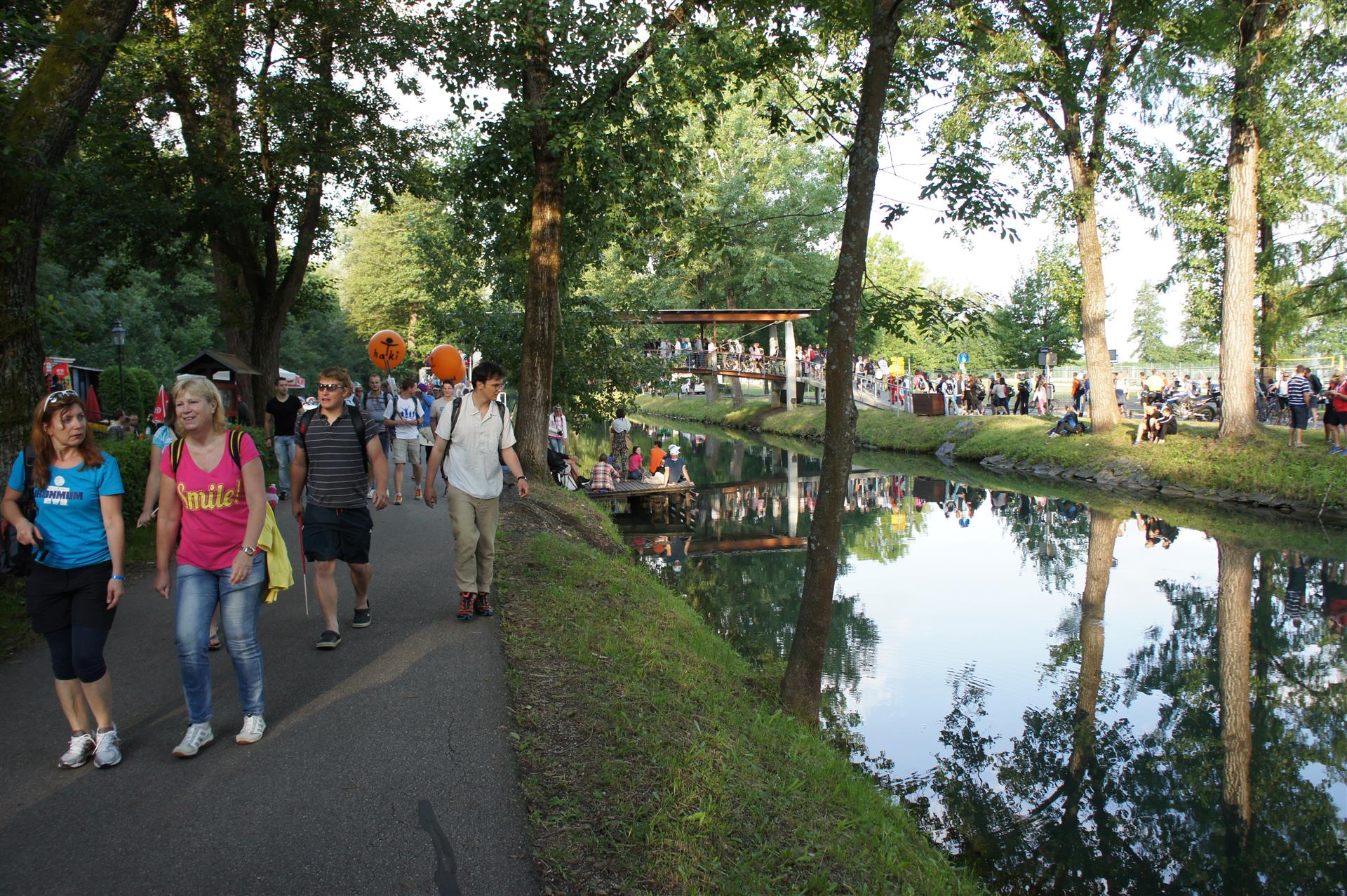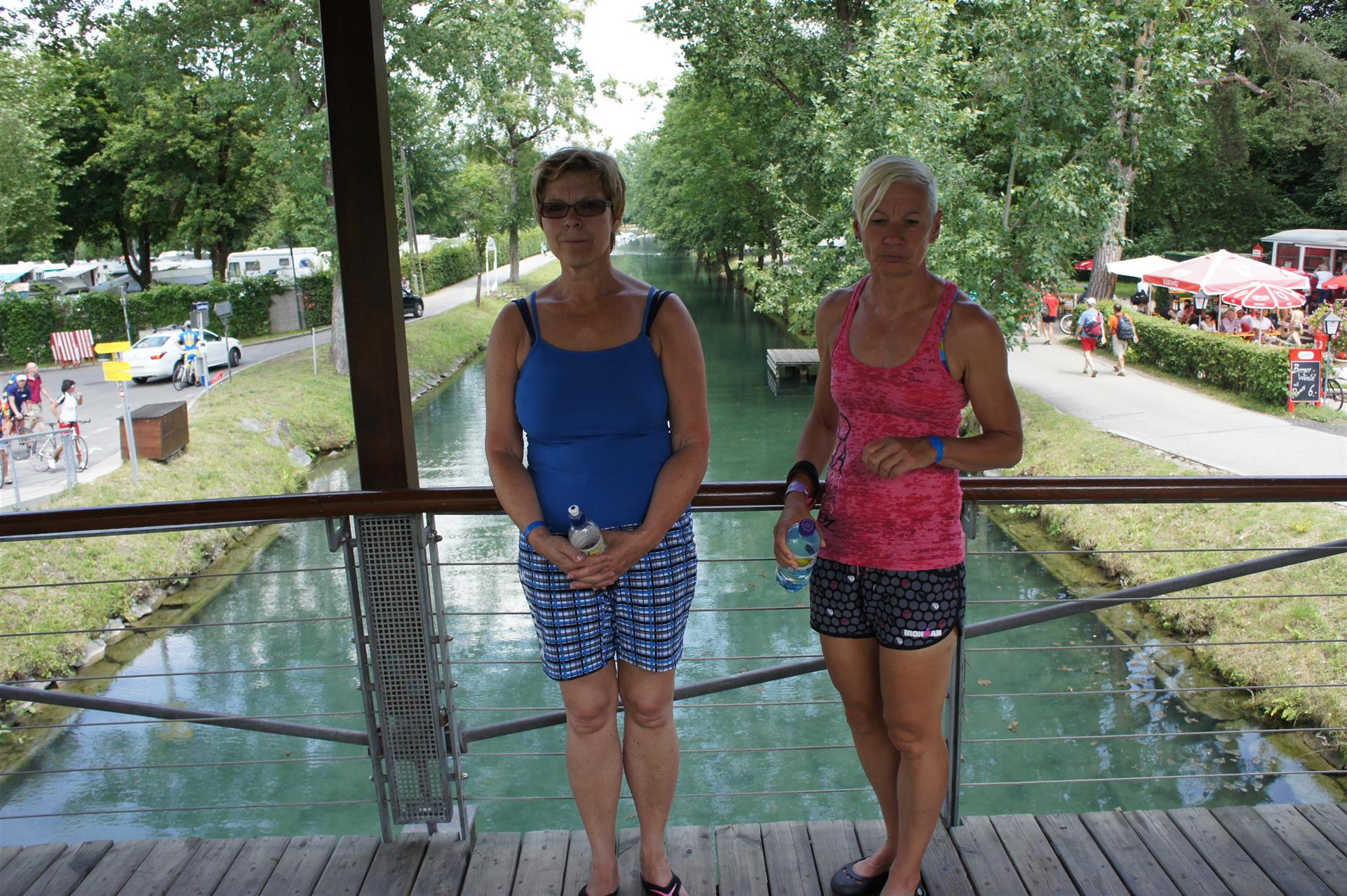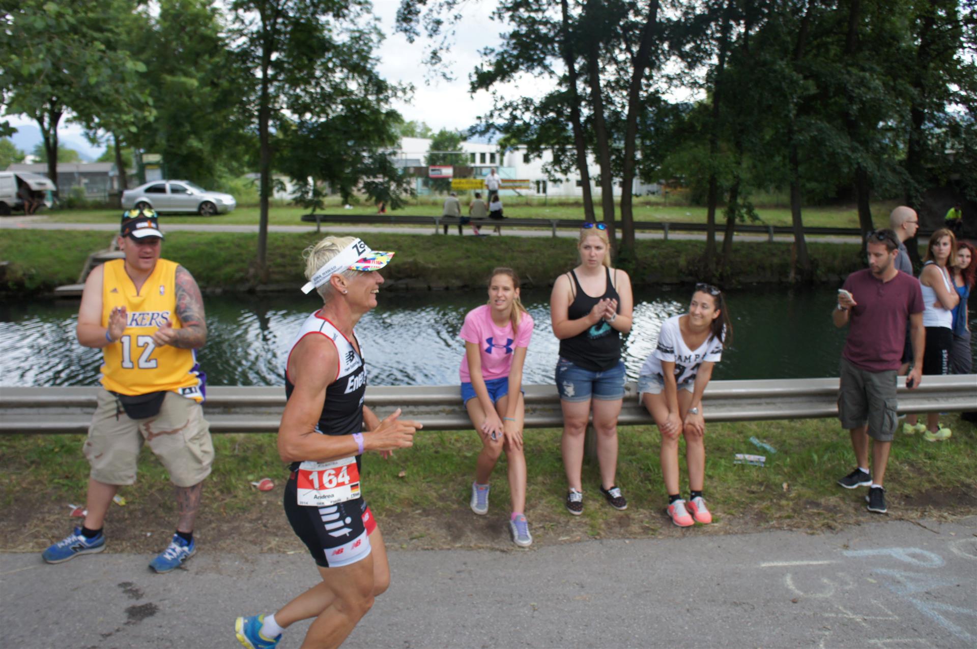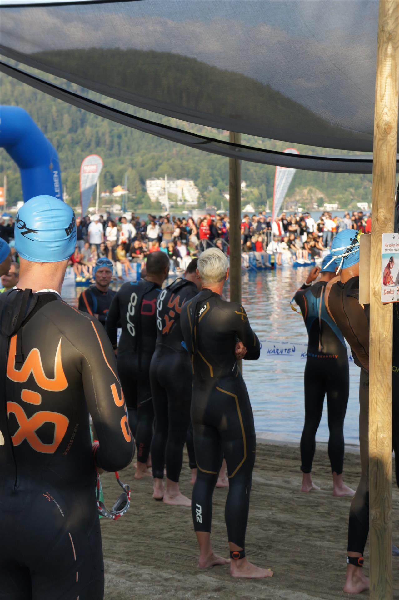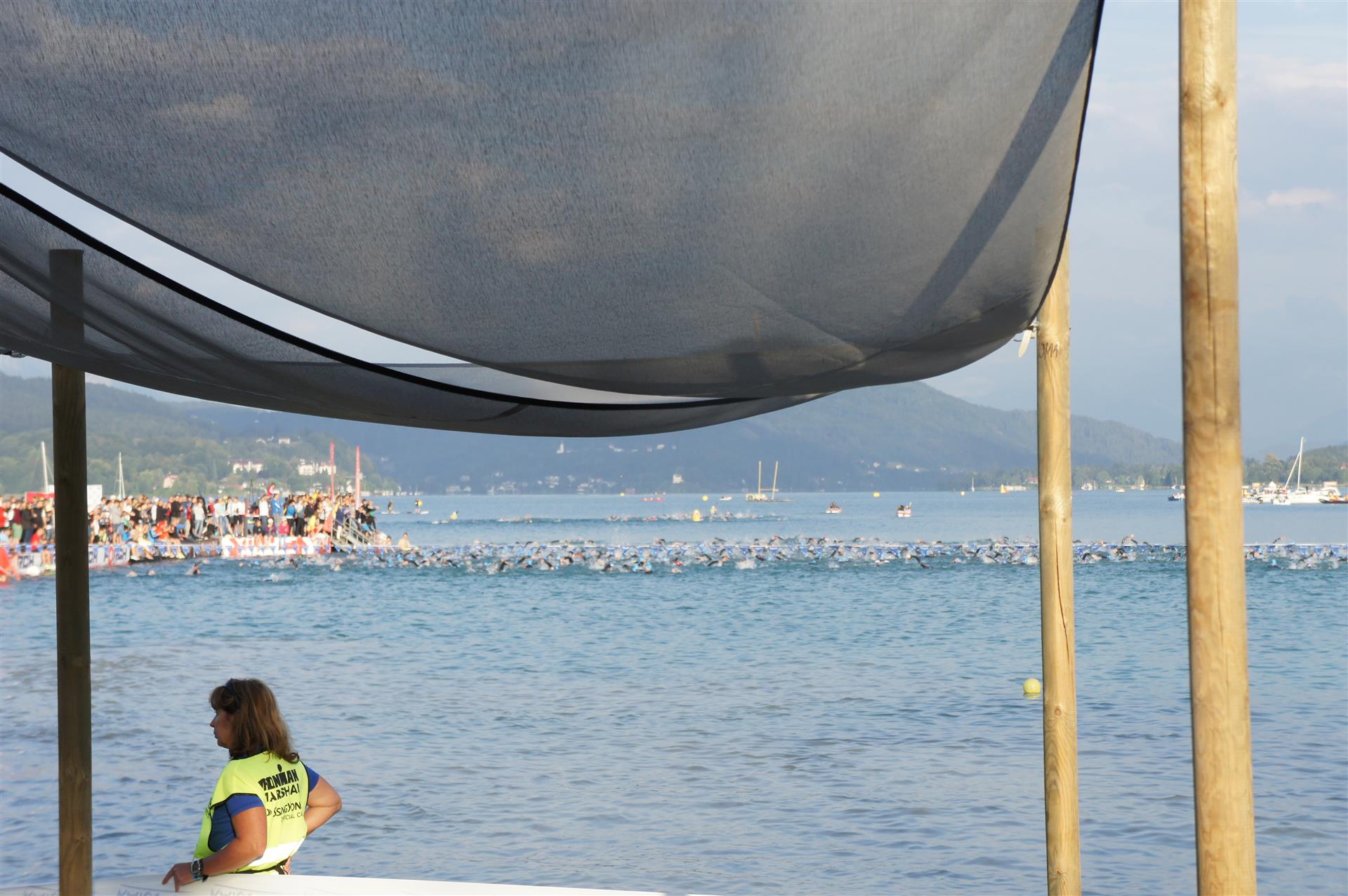 Obwohl ich lediglich eine mittelmäßige Schwimmerin bin macht mir das Schwimmen Spaß. Ich versuche meinen Rhythmus zu finden und gehe möglichst allen Konfrontationen aus dem Weg. Das Schwimmen im Wörthersee ist schon eine tolle Sache. Das Wasser ist super klar, die Strecke gut gekennzeichnet. Lediglich die letzten 1.000 Meter im Lendkanal sind etwas stressig. Wenn sich der ganze Pulk in den lediglich 10-12 Meter breiten Kanal zwängt. Da gibt es auf den ersten Metern ein ganz schönes Gedränge. Man wird jedoch durch die vielen Zuschauer am Rande des Kanals entschädigt. Die Stimmung ist gewaltig, der Krach ohrenbetäubend.