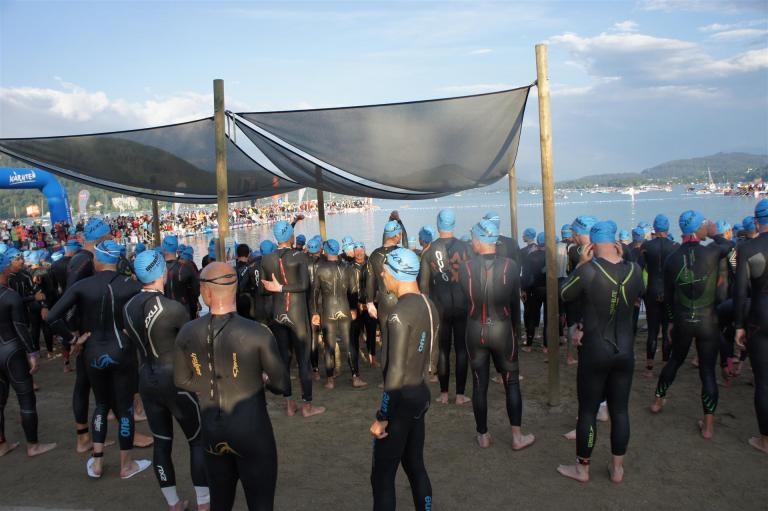 Wie bereits im Vorjahr gab es wieder eine frühere Startgruppe, die bereits um 6:45 Uhr zeitgleich mit den Profis startete. Glücklicherweise war ich in dieser Gruppe, was den Schwimmstart und das Schwimmen doch etwas angenehmer machte. Es ist schon ein Unterschied ob man mit ca. 2.600 Athleten an den Start geht oder nur mit einigen 100.