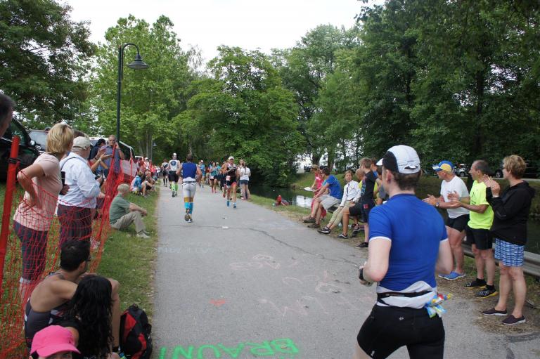 Als nächste Etappe steht dann der Anstieg zum Rupertiberg an. Der Anstieg ist etwas 2.400 Meter lang bei einer Steigung von bis zu 16 %. Auch hier haben sich sehr viele Zuschauer versammelt, das Anfeuern spornt die Athleten zu Höchstleistung an. Die letzten Kilometer der ersten Runde geht es dann überwiegend nur noch nach unten. Auf der zweiten Radrunde regnet es leider etwas, aber egal, da fährt man einfach etwas vorsichtiger. Nach 5:50 Stunden steige ich vom Rad und ziehe meine Laufschuhe an.