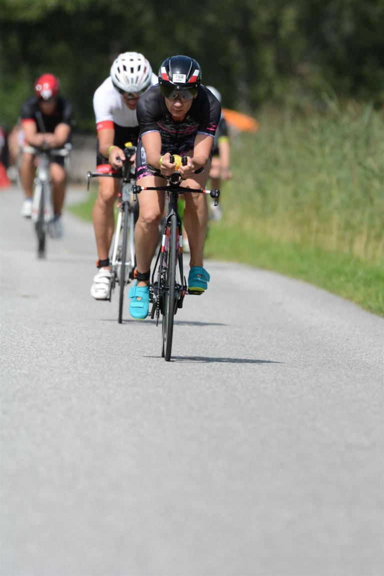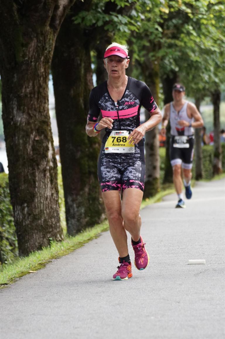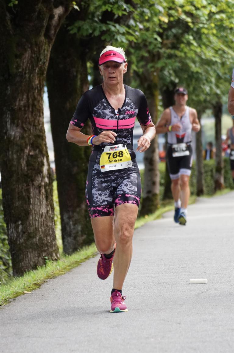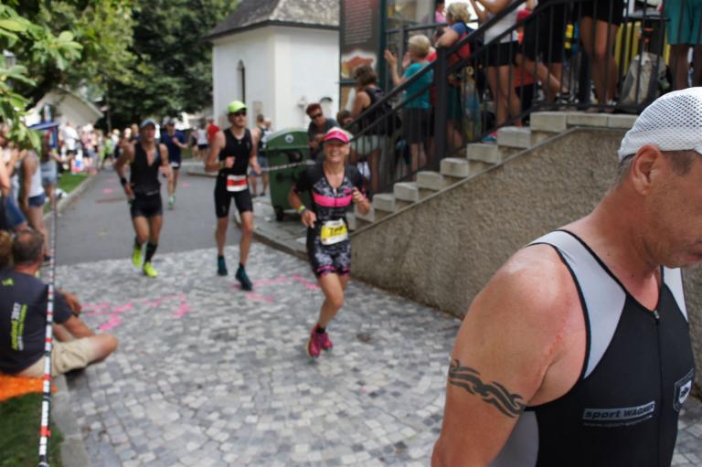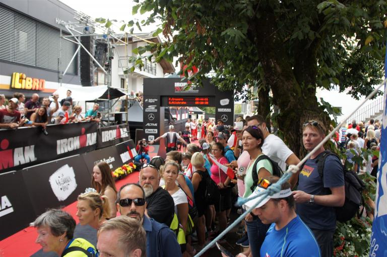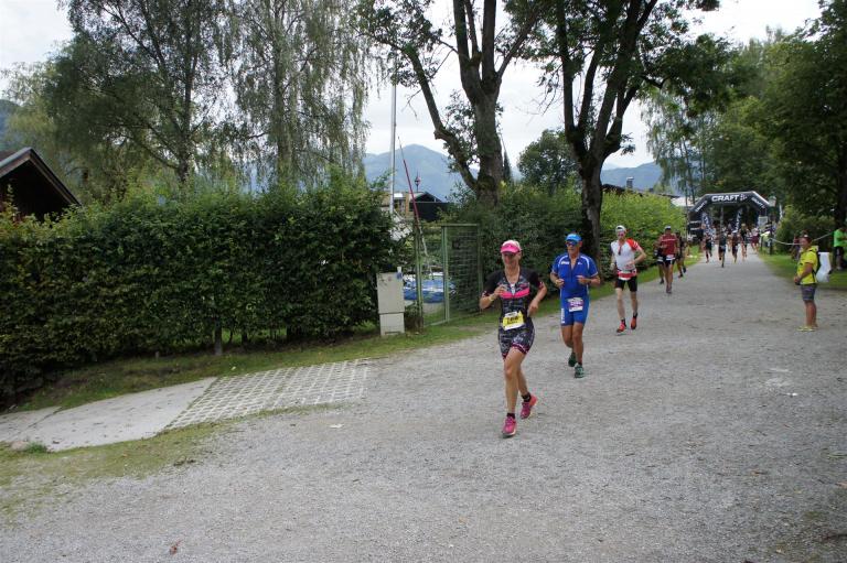 Die ersten 2-3 Kilometer fallen mir sehr schwer. Die Beine sind müde und ich kann mein Tempo nicht finden, was sehr ungewöhnlich für mich ist. Normalerweise habe ich keine Anlaufprobleme nach dem Rad. Meinem Rücken geht es sehr gut, daran kann es nicht liegen. Nachdem ich eine Runde durch die Stadt gelaufen bin und die Zuschauer mich angefeuert und motiviert haben geht es mir langsam besser. Mein Kopf ist positiv und die nächsten 18 Kilometer können kommen. Die Strecke führt am See entlang, ein tolles Panorama. Die Strecke ist teilweise Asphalt aber auch viel Schotter. Man gewöhnt sich irgendwann an den Schotter, die Zuschauer und die tolle Strecken helfen dabei. Gesamt werden 2 Runden mit einigen hoch-tief Passagen gelaufen. Das Ziel ist direkt in der Stadt. Die Finisherline ist voll, man wird angefeuert, es wird gejubelt, eine ganz tolle Stimmung. Für den Halbmarathon habe ich eine Zeit von 1:53:04 benötigt.