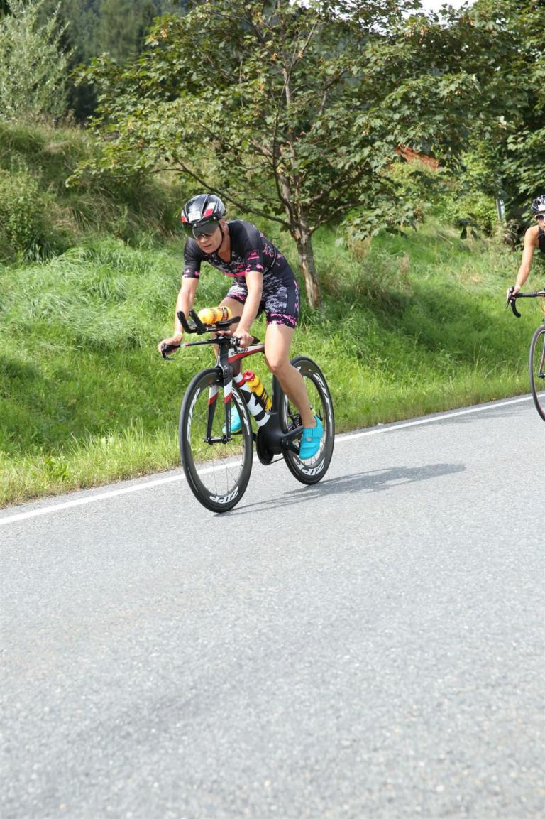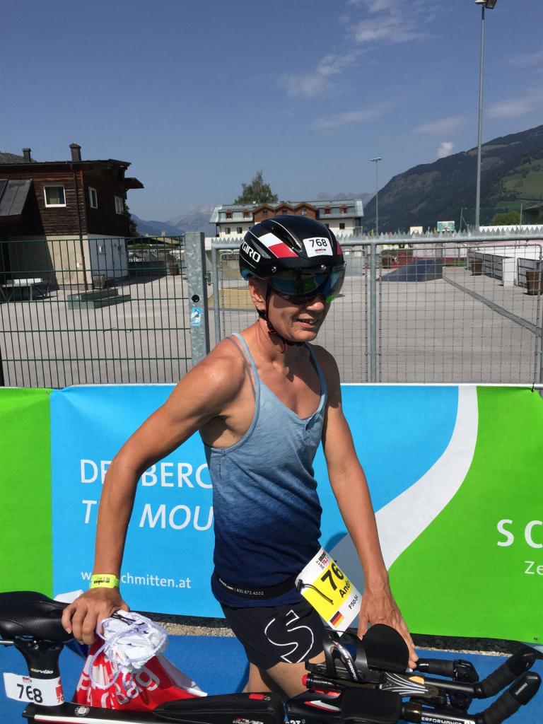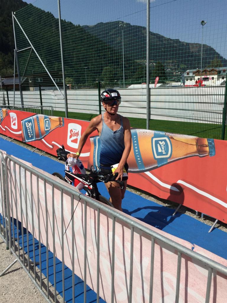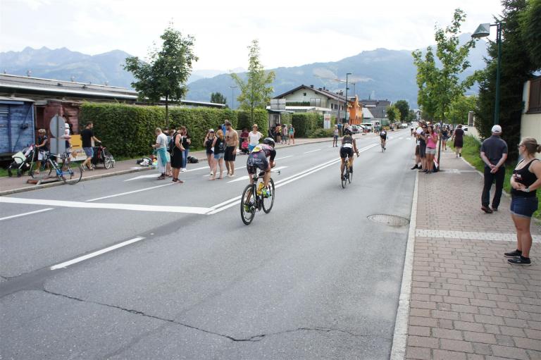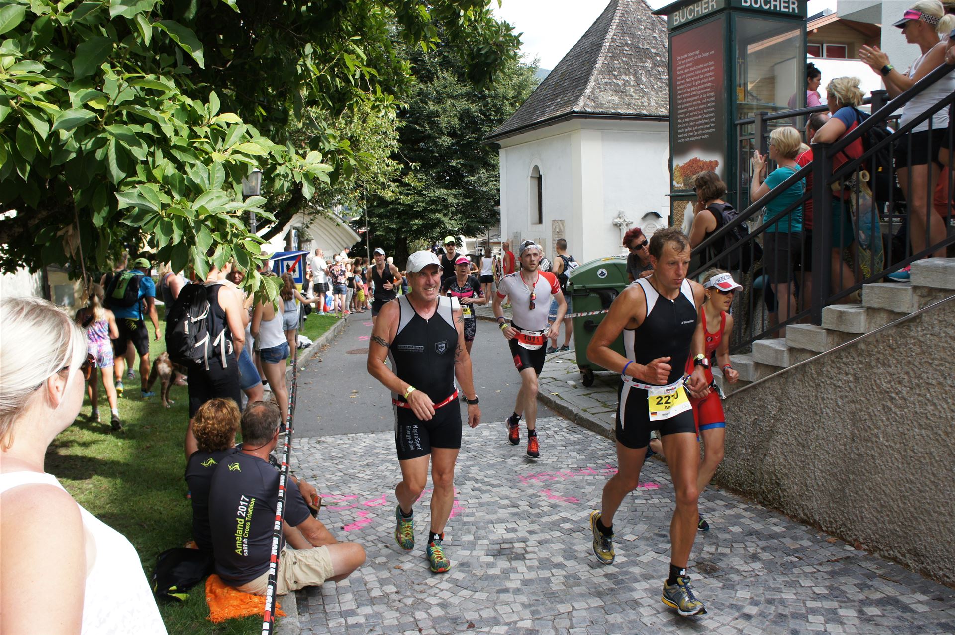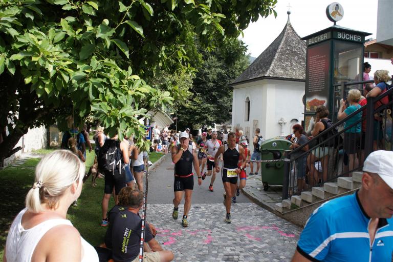 Schnell in die Wechselzone umziehen und dann aufs Rad. Es wird eine Runde mit insgesamt 870 Höhenmetern gefahren. Die ersten Kilometer sind meist flach, es läuft wunderbar. Ein 13 Kilometer langer Anstieg nach Dienten ist eines der Highlights der Radstrecke. Die ersten sechs Kilometer steigt die Strecke mit etwa 5,5 Prozent Steigung gemächlich an. Wer hier das Tempo zu hoch wählt, dem stellt sich auf den letzten zwei Kilometer mit bis zu 14 % Steigung eine Mauer auf. Leider habe ich, wie bereits in Klagenfurt, Probleme mit dem unteren Rücken. Ich versuche die Schmerzen zu verdrängen und mein Tempo zu fahren. Ich teile mir mein Tempo richtig ein und kurble den Berg hoch. Gefühlt werde ich von vielen überholt, ich behalte jedoch mein Tempo bei. Die Aussicht ist einfach phantastisch, ich versuche trotz Wettkampf die Strecke zu genießen. Am Filzensattel ist der höchste Punkt der Strecke erreicht, von 1.285 Metern Seehöhe geht es wieder bergab. Da ich die Strecke zum ersten Mal fahre bin ich etwas vorsichtig. Die Abfahrt ist am Anfang technisch sehr anspruchsvoll. Starkes Gefälle (15 %) und enge Kurven wechseln sich ab. Die Strecke ist jedoch hervorragend ausgezeichnet. Alle Kurven sind mit Schriftzeichen auf der Straße und Schildern markiert. Es wurde versucht alle Unebenheiten, Kanaldeckeln, Schlaglöcher … farblich zu markieren. Beeindruckend wieviel Mühe sich das Team hier gegeben hat. Im Zentrum von Kaprun ist eine ganz tolle Stimmung. Generell sind sehr viele Zuschauer auf der Strecke um die Athleten anzufeuern. Nach 3:08:14 Stunden steige ich vom Rad und es folgt die letzte Disziplin, das Laufen.