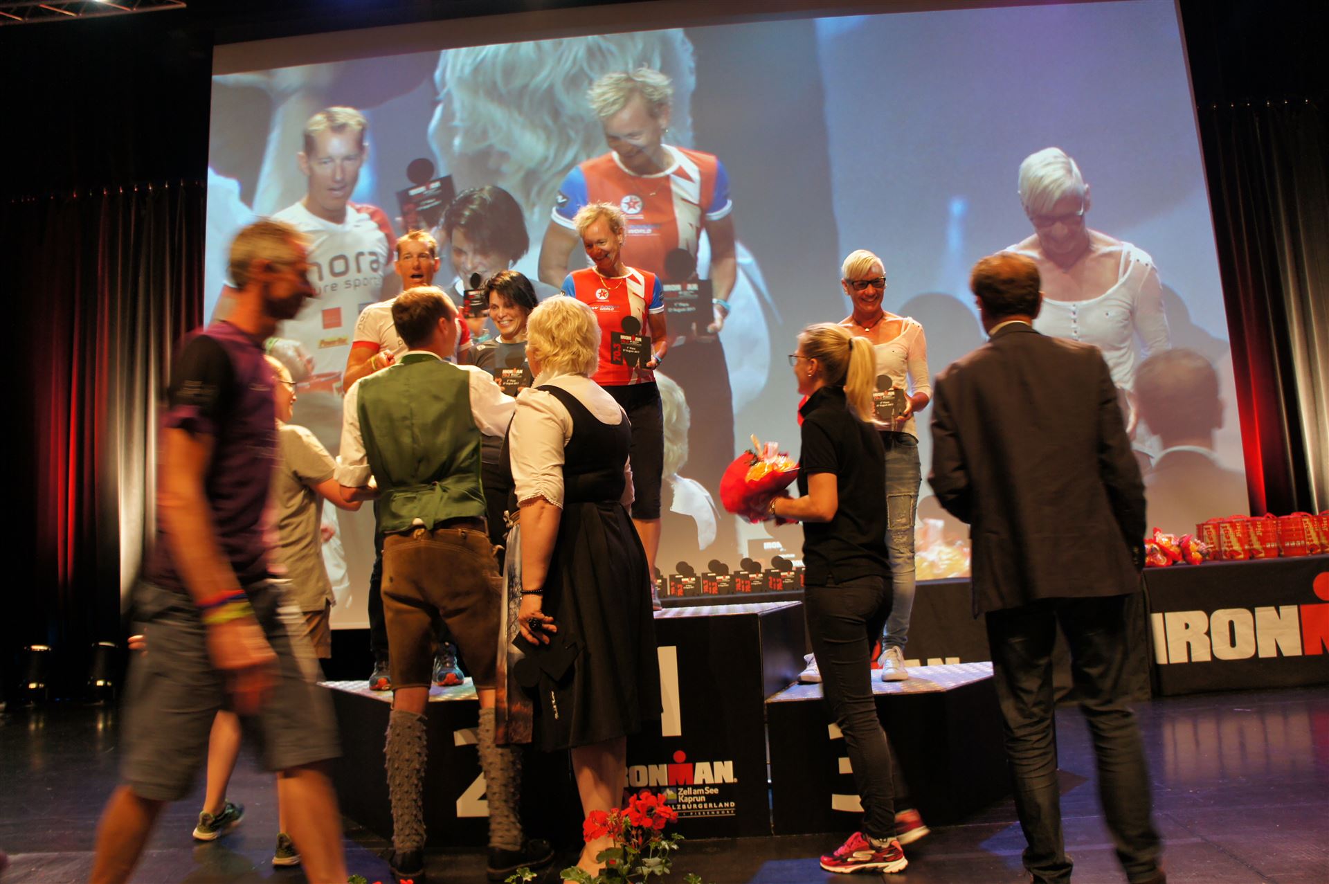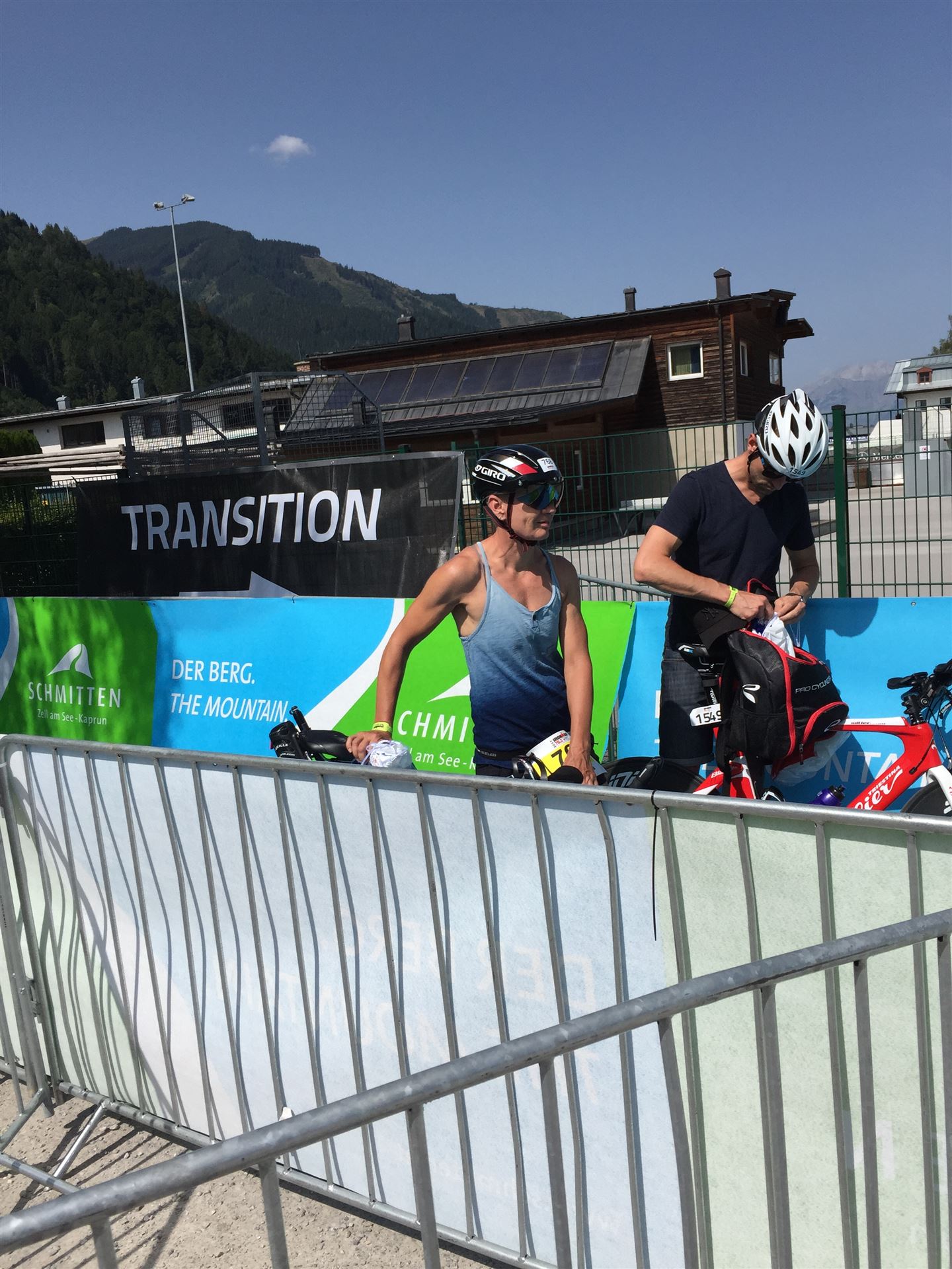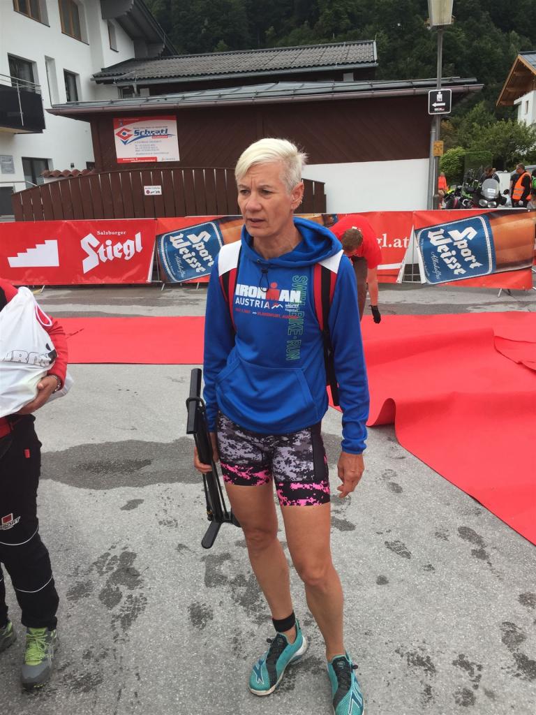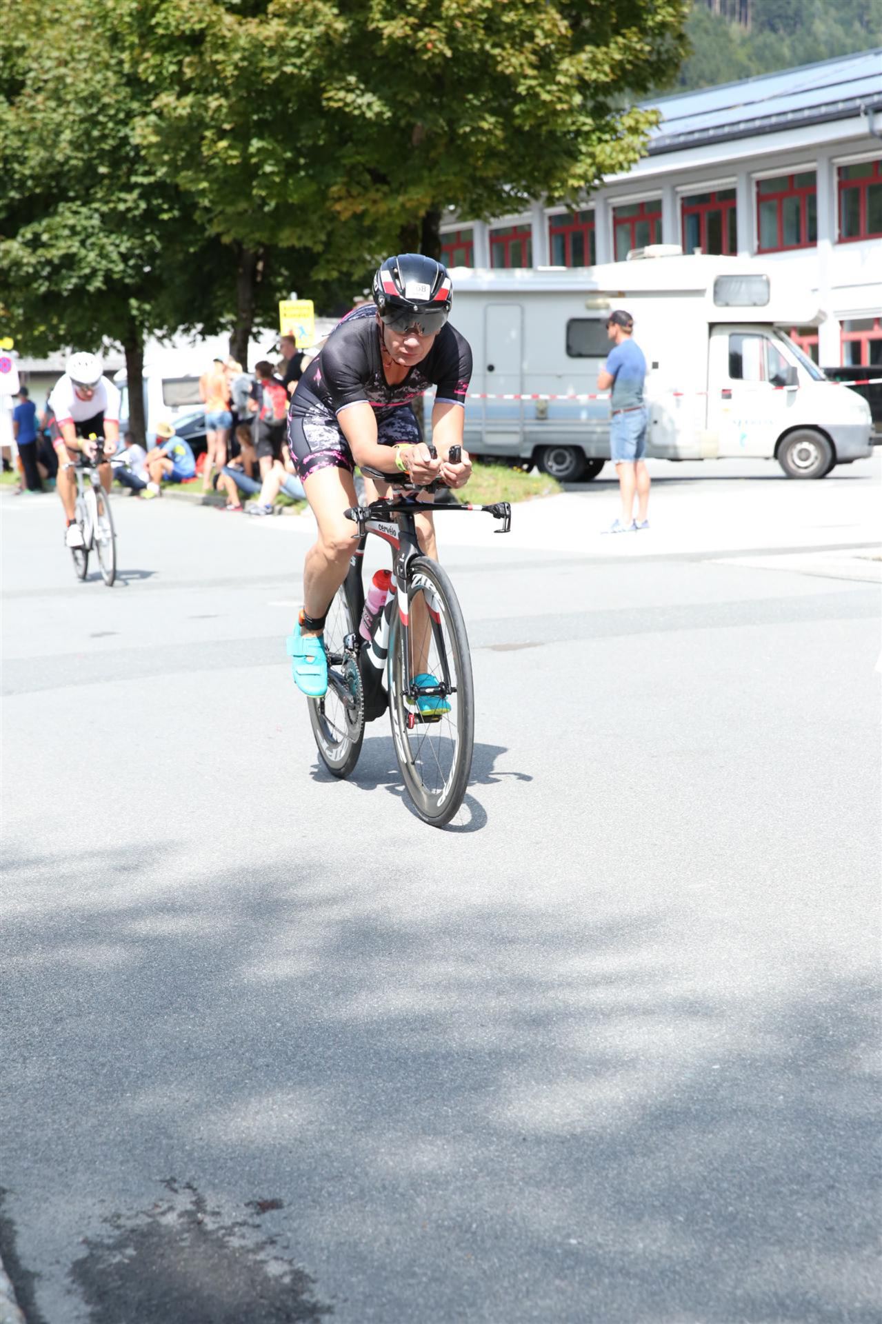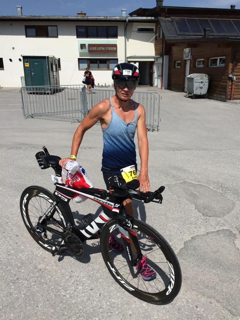 Schnell in die Wechselzone umziehen und dann aufs Rad. Es wird eine Runde mit insgesamt 870 Höhenmetern gefahren. Die ersten Kilometer sind meist flach, es läuft wunderbar. Ein 13 Kilometer langer Anstieg nach Dienten ist eines der Highlights der Radstrecke. Die ersten sechs Kilometer steigt die Strecke mit etwa 5,5 Prozent Steigung gemächlich an. Wer hier das Tempo zu hoch wählt, dem stellt sich auf den letzten zwei Kilometer mit bis zu 14 % Steigung eine Mauer auf. Leider habe ich, wie bereits in Klagenfurt, Probleme mit dem unteren Rücken. Ich versuche die Schmerzen zu verdrängen und mein Tempo zu fahren. Ich teile mir mein Tempo richtig ein und kurble den Berg hoch. Gefühlt werde ich von vielen überholt, ich behalte jedoch mein Tempo bei. Die Aussicht ist einfach phantastisch, ich versuche trotz Wettkampf die Strecke zu genießen. Am Filzensattel ist der höchste Punkt der Strecke erreicht, von 1.285 Metern Seehöhe geht es wieder bergab. Da ich die Strecke zum ersten Mal fahre bin ich etwas vorsichtig. Die Abfahrt ist am Anfang technisch sehr anspruchsvoll. Starkes Gefälle (15 %) und enge Kurven wechseln sich ab. Die Strecke ist jedoch hervorragend ausgezeichnet. Alle Kurven sind mit Schriftzeichen auf der Straße und Schildern markiert. Es wurde versucht alle Unebenheiten, Kanaldeckeln, Schlaglöcher … farblich zu markieren. Beeindruckend wieviel Mühe sich das Team hier gegeben hat. Im Zentrum von Kaprun ist eine ganz tolle Stimmung. Generell sind sehr viele Zuschauer auf der Strecke um die Athleten anzufeuern. Nach 3:08:14 Stunden steige ich vom Rad und es folgt die letzte Disziplin, das Laufen.