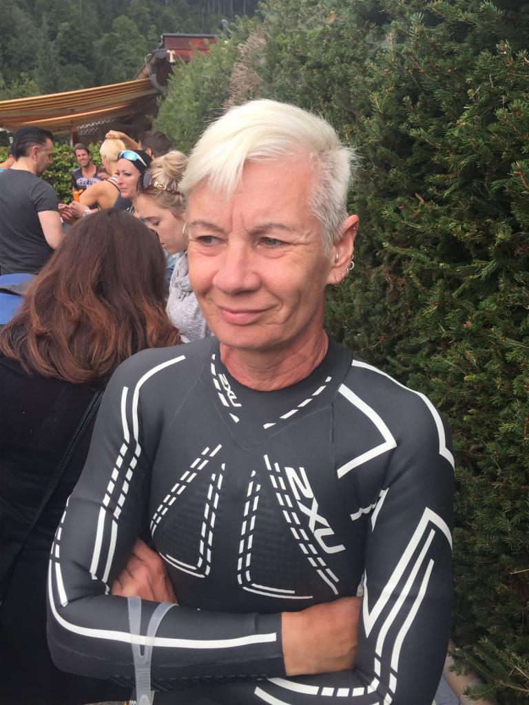 Um 11:00 Uhr fällt der Startschuss für die Profis Männer (eine sehr humane Zeit, man muss nicht so früh aufstehen). Die Sonne kommt langsam aus den Wolken hervor, die umliegenden Berge ergeben ein tolles Panorama. Bei diesem Anblick kann es nur ein toller Wettkampf werden. Direkt nach den Männern gehen die Profi–Frauen an den Start. Einige Minuten später beginnt für die Agegrouper der Rollingstart. Alle Sekunden gehen einige Athleten ins Wasser. Ich habe mich entsprechend meiner Schwimmzeit im Block 30-35 Minuten eingeordnet. Es wird eine Runde geschwommen. Der Kurs geht gerade aus bis zur großen Boje und wieder zurück. Das Schwimmen ist komplett Stressfrei. Durch das rollierende System gibt es kein Gehaue und Gedränge. Jeder kann seinen Rhythmus schwimmen. Nach 0:35:32 Minuten komme ich entspannt aus dem Wasser. Inzwischen scheint die Sonne, es wird ein wunderbarer Tag.