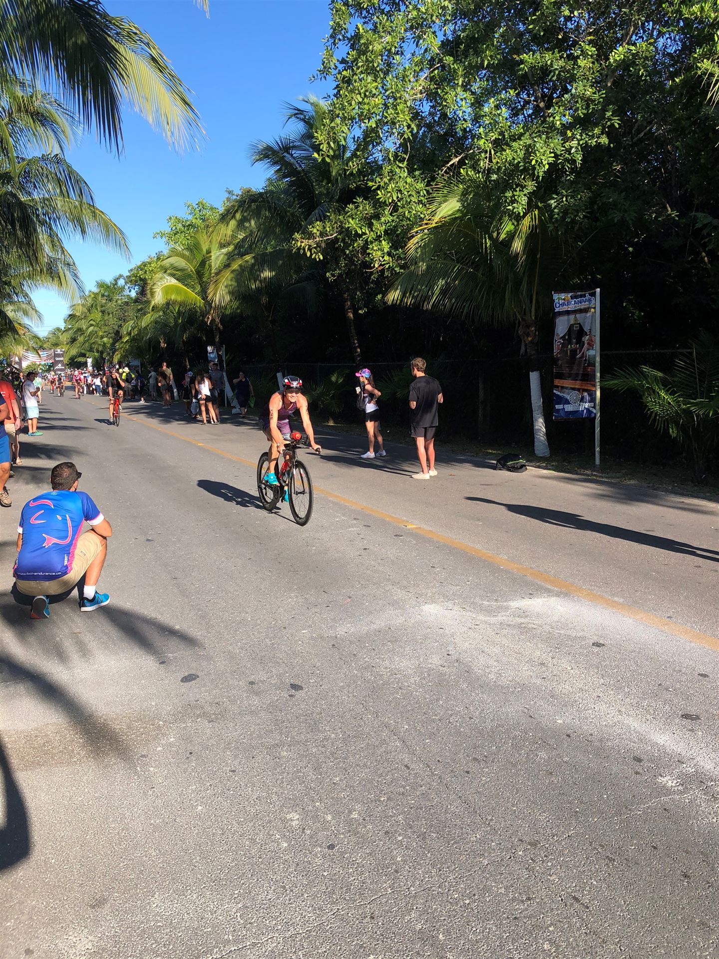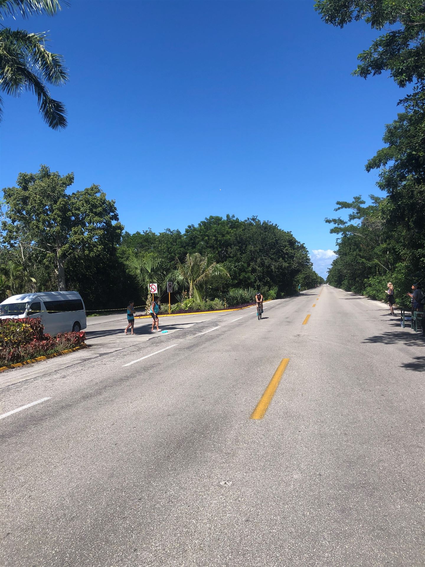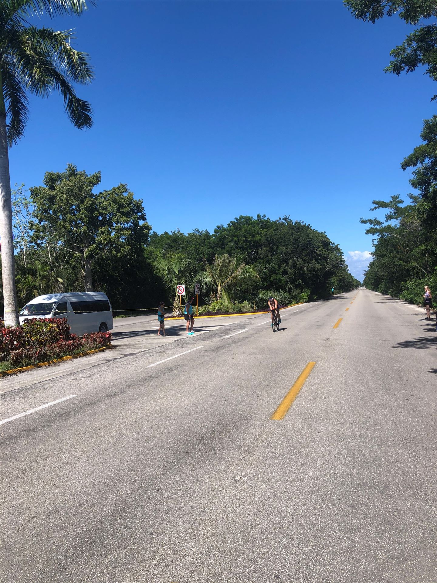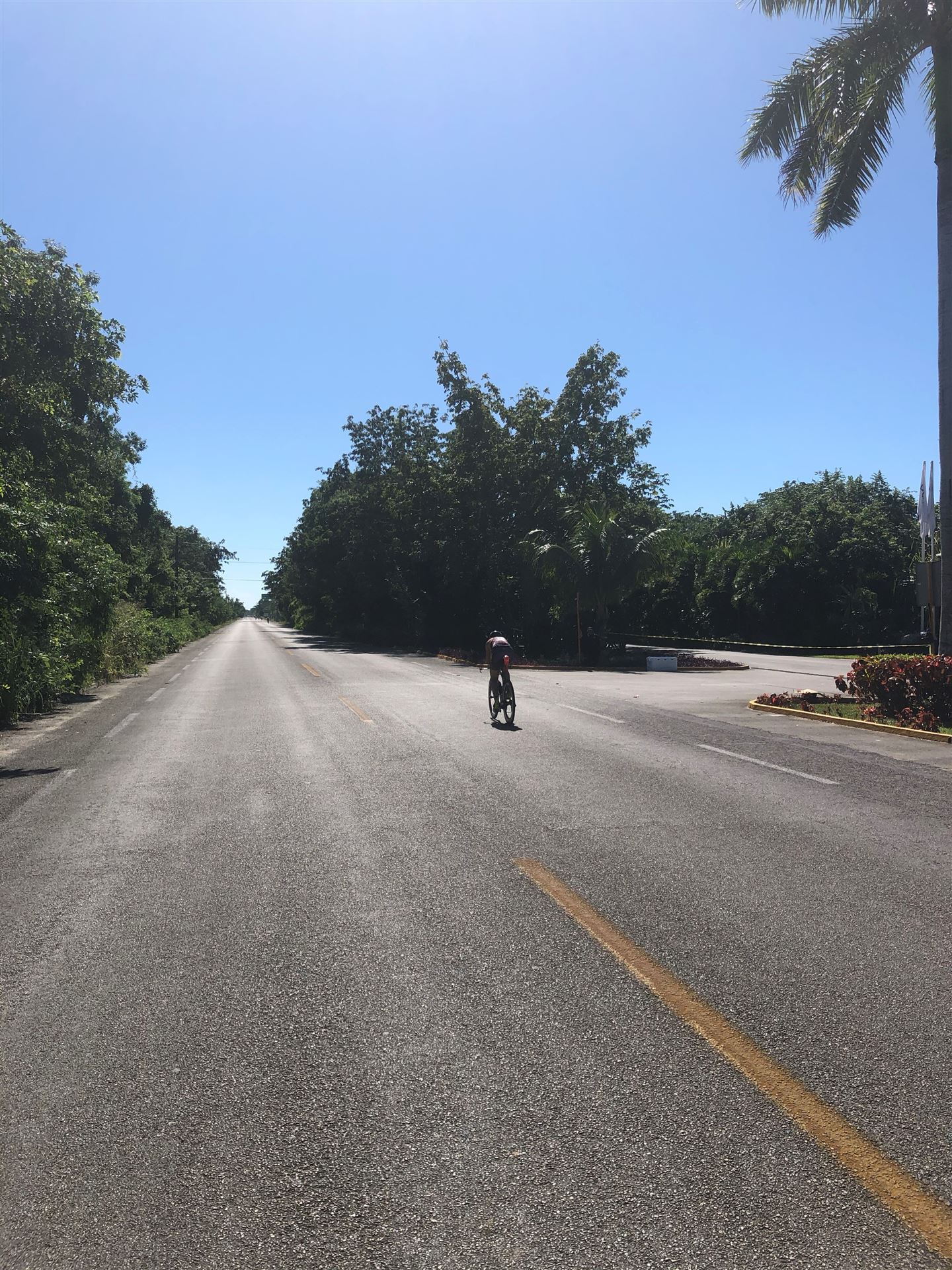 Um kurz vor 7:00 Uhr ist die Nacht vorbei. Da es relativ früh dunkel wird, steht man auch entsprechend früh auf. Nach dem Frühstück geht es mit dem Rad los. Einmal die Wettkampfstrecke abfahren, sprich einmal um die Insel. Inzwischen sind einige Athleten unterwegs. Es gibt einen tollen Radweg, der fast komplett parallel zur Straße geht. Es gibt kaum Verkehr, der Wind ist okay, die Wettkampfstrecke ohne Überraschungen. Unterwegs gibt es sogar Schilder mit dem Hinweis Athleten im Training. Eine Runde sind circa 63 Kilometer, fast alles mit Radweg. Nur das Stück durch die Stadt ist etwas blöd, der Rest jedoch perfekt. Im Anschluss an das Rad fahren stehen noch 30 Minuten lockere Grundlage Laufen auf dem Plan. Danach liegen wir etwas im Schatten am Pool. Inzwischen sind noch einige Athleten im Club angekommen. Zum Abendessen gibt es heute mal Buffet, danach noch etwas chillen und dann ab ins Bett.