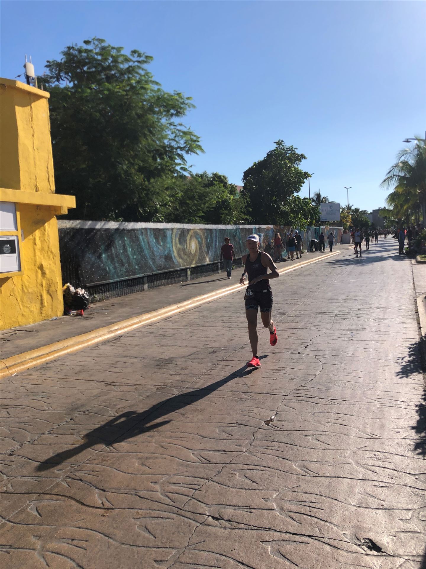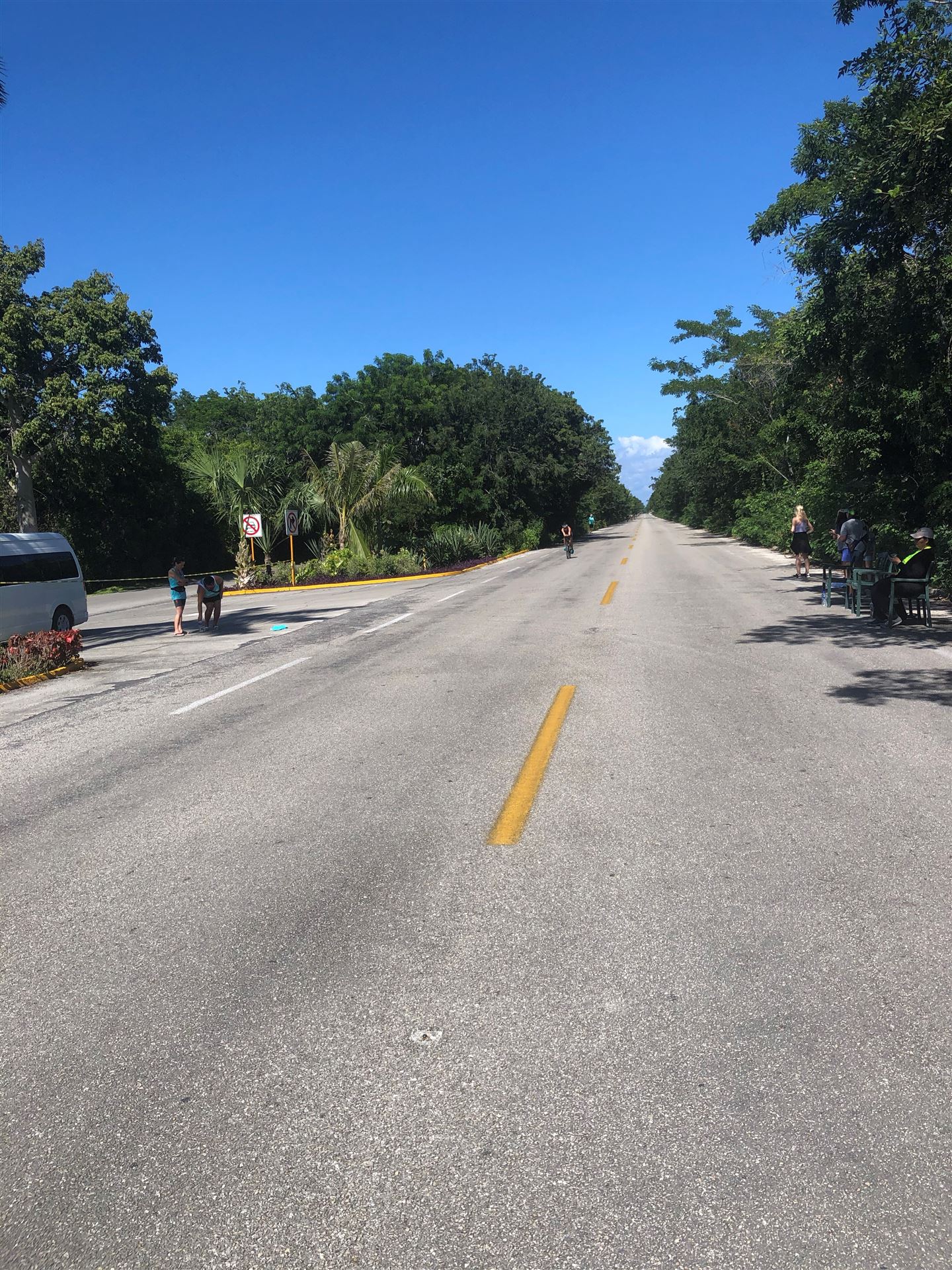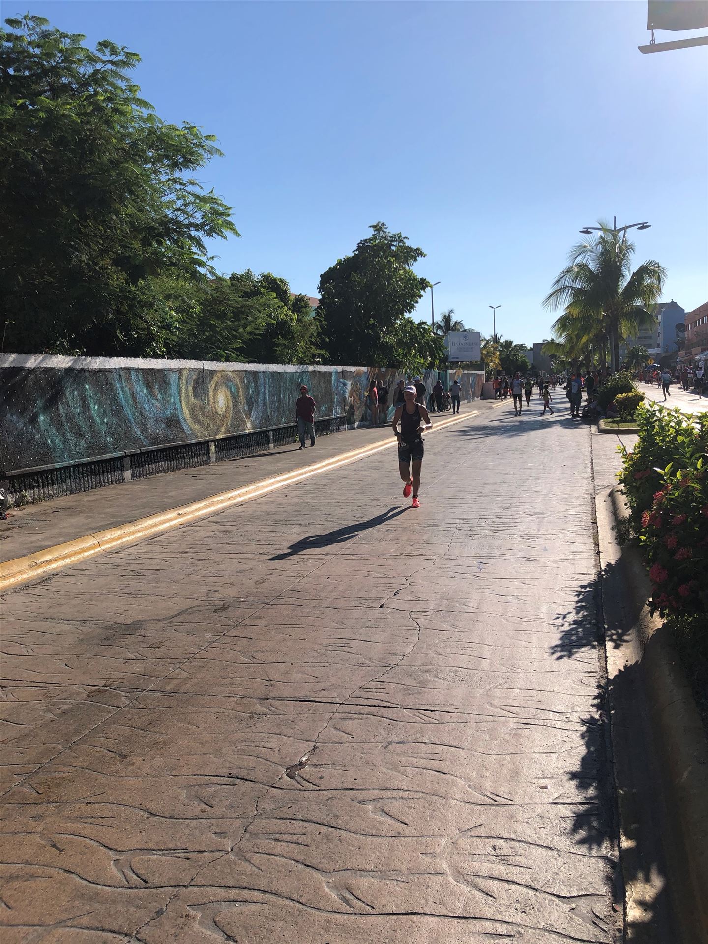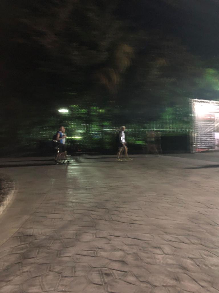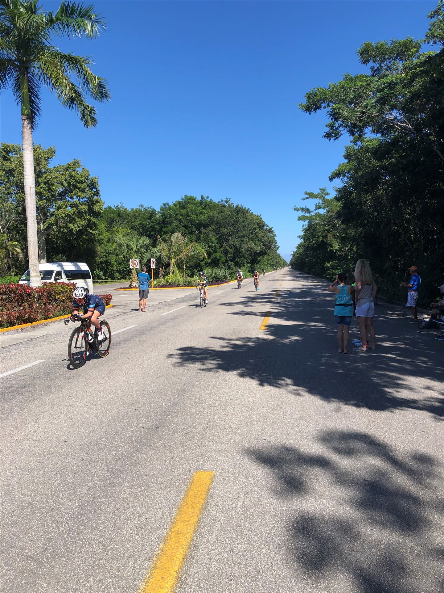Um kurz vor 7:00 Uhr ist die Nacht vorbei. Da es relativ früh dunkel wird, steht man auch entsprechend früh auf. Nach dem Frühstück geht es mit dem Rad los. Einmal die Wettkampfstrecke abfahren, sprich einmal um die Insel. Inzwischen sind einige Athleten unterwegs. Es gibt einen tollen Radweg, der fast komplett parallel zur Straße geht. Es gibt kaum Verkehr, der Wind ist okay, die Wettkampfstrecke ohne Überraschungen. Unterwegs gibt es sogar Schilder mit dem Hinweis Athleten im Training. Eine Runde sind circa 63 Kilometer, fast alles mit Radweg. Nur das Stück durch die Stadt ist etwas blöd, der Rest jedoch perfekt. Im Anschluss an das Rad fahren stehen noch 30 Minuten lockere Grundlage Laufen auf dem Plan. Danach liegen wir etwas im Schatten am Pool. Inzwischen sind noch einige Athleten im Club angekommen. Zum Abendessen gibt es heute mal Buffet, danach noch etwas chillen und dann ab ins Bett.