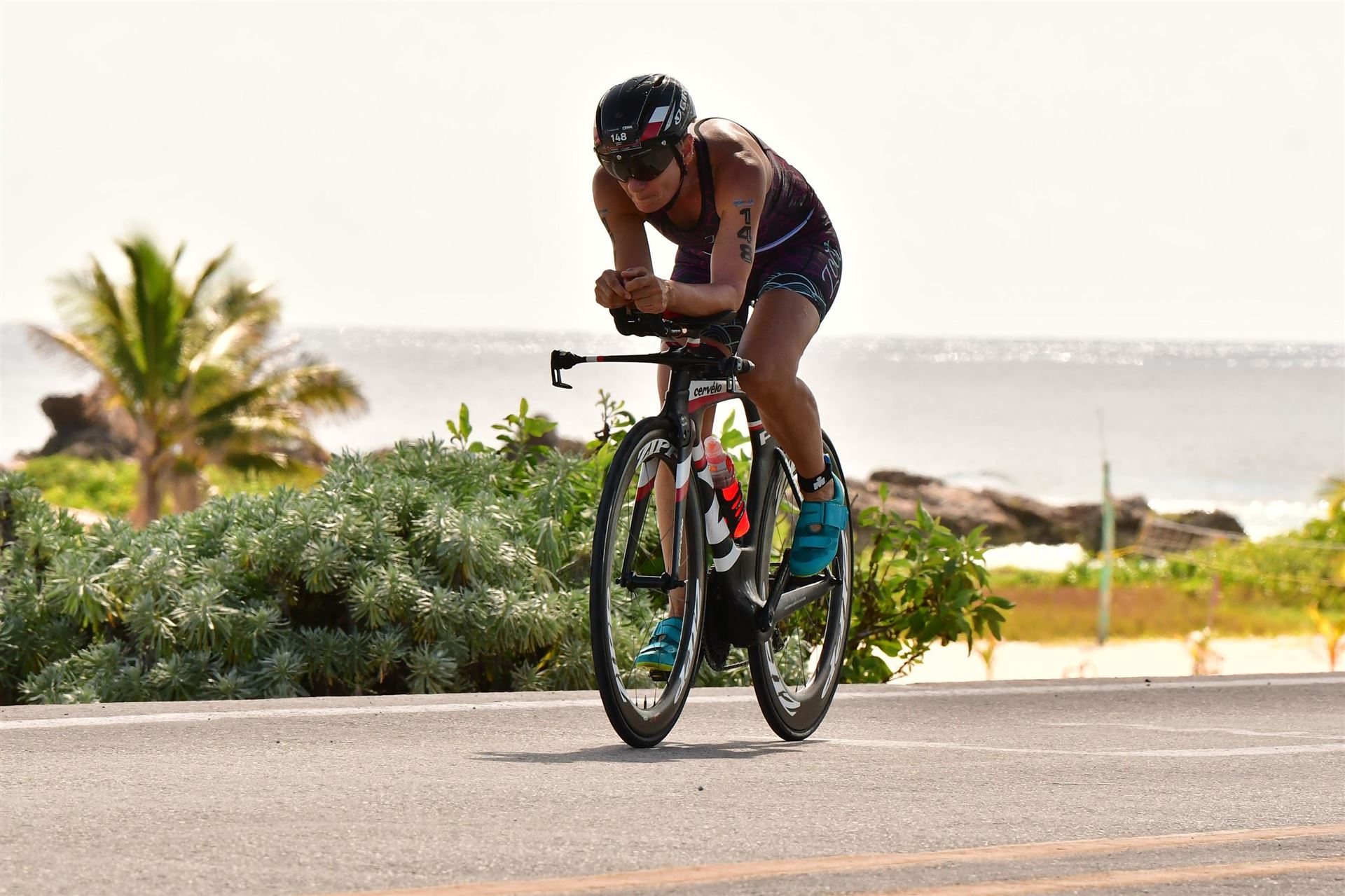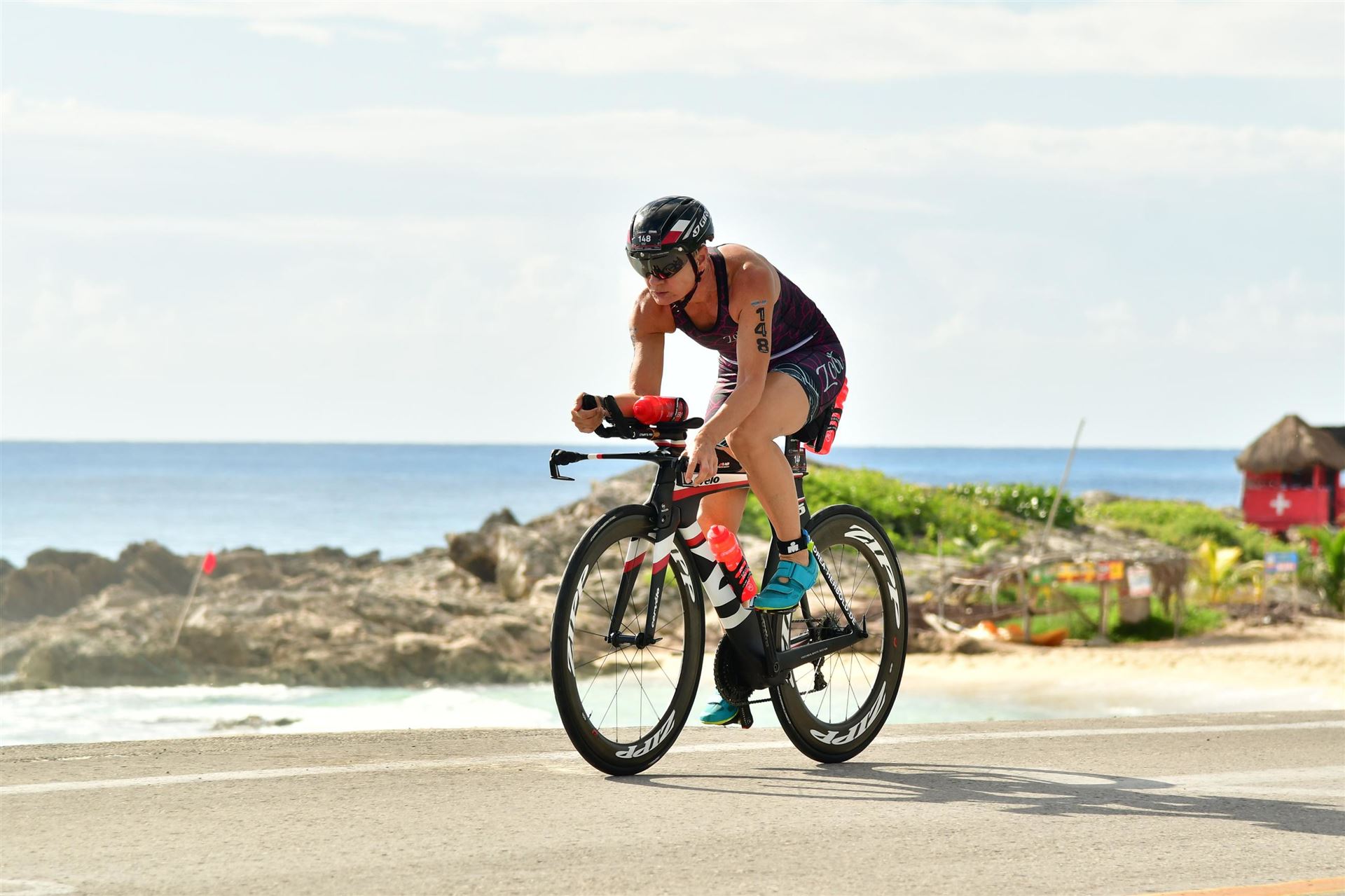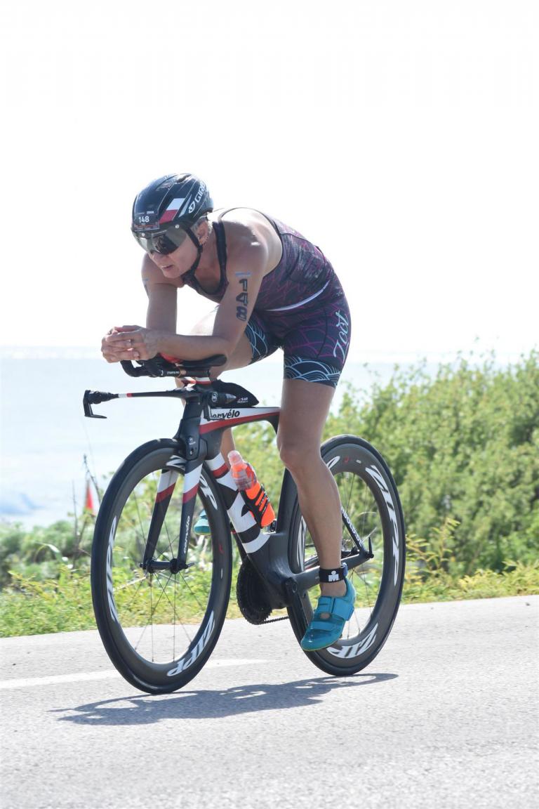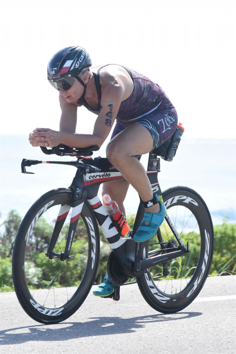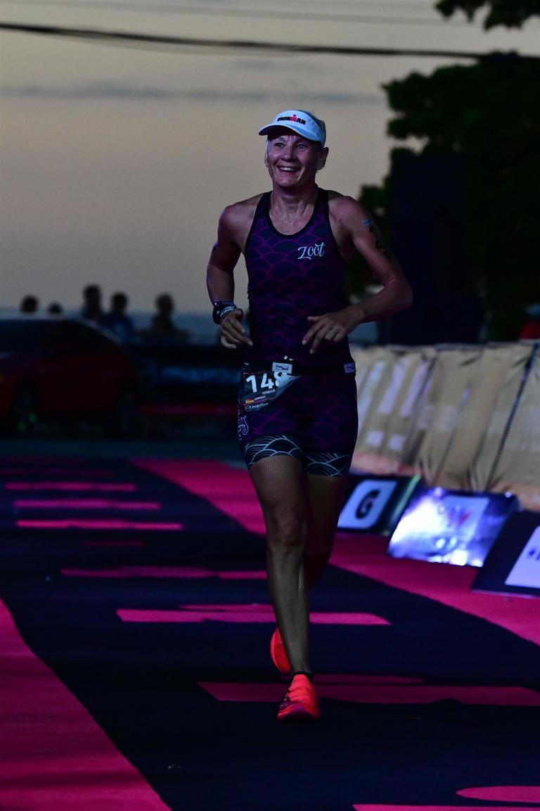 Zügig zum Rad und dann ab auf die erste Runde. Da mein Magen noch immer rebelliert verzichte ich die erste Zeit auf jegliche Nahrungs- bzw. Flüssigkeitsaufnahme. Das erste Stück geht an diversen Hotels und Restaurants vorbei. Die Strecke ist überwiegend geradeaus. Nichts spektakuläres. Ein großes Teilstück verläuft parallel zum Meer, der Ausblick ist einfach toll. Schön, wenn man während einem Rennen noch solch ein Panorama genießen kann. Am Anfang ist die Radstrecke noch etwas voll, das wird jedoch von Kilometer zu Kilometer besser. Ich fühle mich sehr gut und kann mein Tempo fahren. Ich freue mich, wenn ich den ein- oder anderen Athleten überholen kann, das bringt zusätzliche Motivation. Ich versuche die meiste Zeit abgelegt zu fahren, das minimiert den Windwiderstand. Die Verpflegungsstellen sind sehr dicht beieinander, man kann seine Flaschen auffüllen und sich mit Wasser kühlen. Ist perfekt organisiert. Insgesamt muss man 3 Runden fahren. 2 x 63 Kilometer und die letzte Runde noch 54 Kilometer. Ich versuche möglichst konstant mein Tempo zu fahren und fühle mich ausgezeichnet. Es steht ja im Anschluss noch ein Marathon an. Das Gefühl ist toll, als ich nach 3 Runden in Richtung Wechselzone abbiegen kann und bin erstaunt, wie viele erst jetzt auf die 3. Runde gehen. Schnell das TT Bike an einen Helfer abgeben und dann mit dem Laufbeutel ins Wechselzelt. Meine Radzeit von 5:30:34 ist eine tolle Zeit für mich.