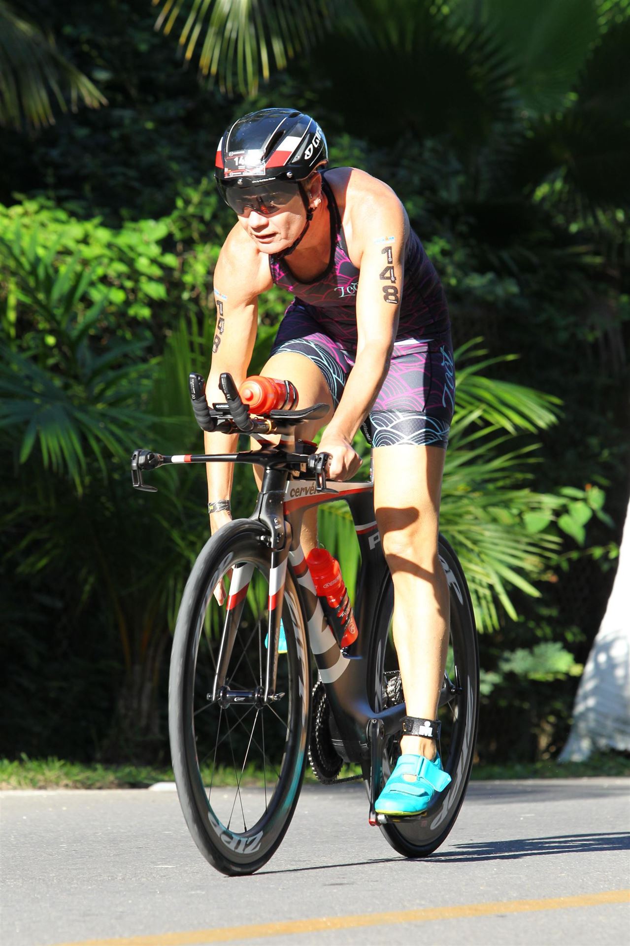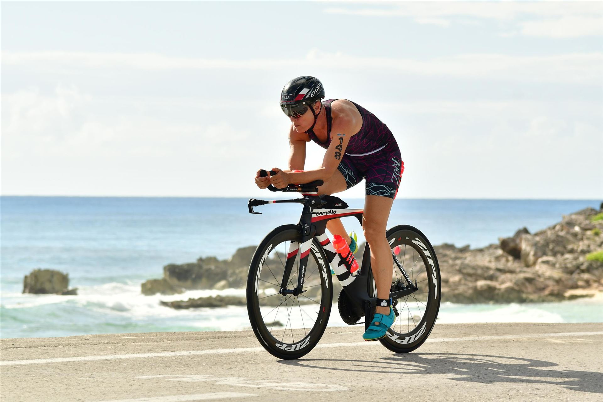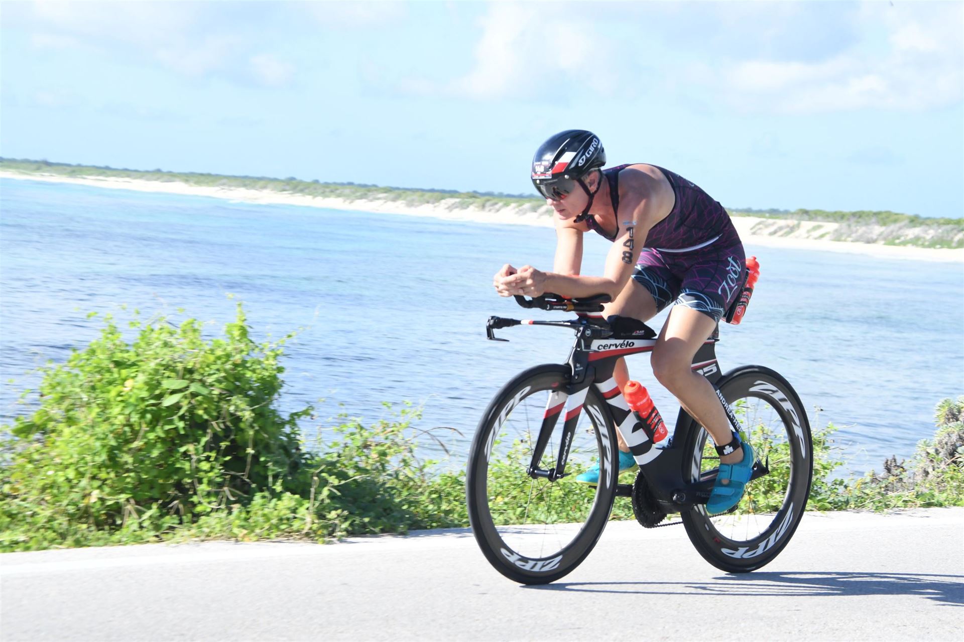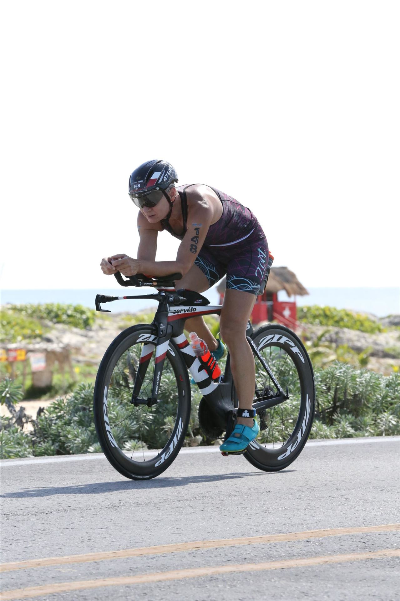Zügig zum Rad und dann ab auf die erste Runde. Da mein Magen noch immer rebelliert verzichte ich die erste Zeit auf jegliche Nahrungs- bzw. Flüssigkeitsaufnahme. Das erste Stück geht an diversen Hotels und Restaurants vorbei. Die Strecke ist überwiegend geradeaus. Nichts spektakuläres. Ein großes Teilstück verläuft parallel zum Meer, der Ausblick ist einfach toll. Schön, wenn man während einem Rennen noch solch ein Panorama genießen kann. Am Anfang ist die Radstrecke noch etwas voll, das wird jedoch von Kilometer zu Kilometer besser. Ich fühle mich sehr gut und kann mein Tempo fahren. Ich freue mich, wenn ich den ein- oder anderen Athleten überholen kann, das bringt zusätzliche Motivation. Ich versuche die meiste Zeit abgelegt zu fahren, das minimiert den Windwiderstand. Die Verpflegungsstellen sind sehr dicht beieinander, man kann seine Flaschen auffüllen und sich mit Wasser kühlen. Ist perfekt organisiert. Insgesamt muss man 3 Runden fahren. 2 x 63 Kilometer und die letzte Runde noch 54 Kilometer. Ich versuche möglichst konstant mein Tempo zu fahren und fühle mich ausgezeichnet. Es steht ja im Anschluss noch ein Marathon an. Das Gefühl ist toll, als ich nach 3 Runden in Richtung Wechselzone abbiegen kann und bin erstaunt, wie viele erst jetzt auf die 3. Runde gehen. Schnell das TT Bike an einen Helfer abgeben und dann mit dem Laufbeutel ins Wechselzelt. Meine Radzeit von 5:30:34 ist eine tolle Zeit für mich.