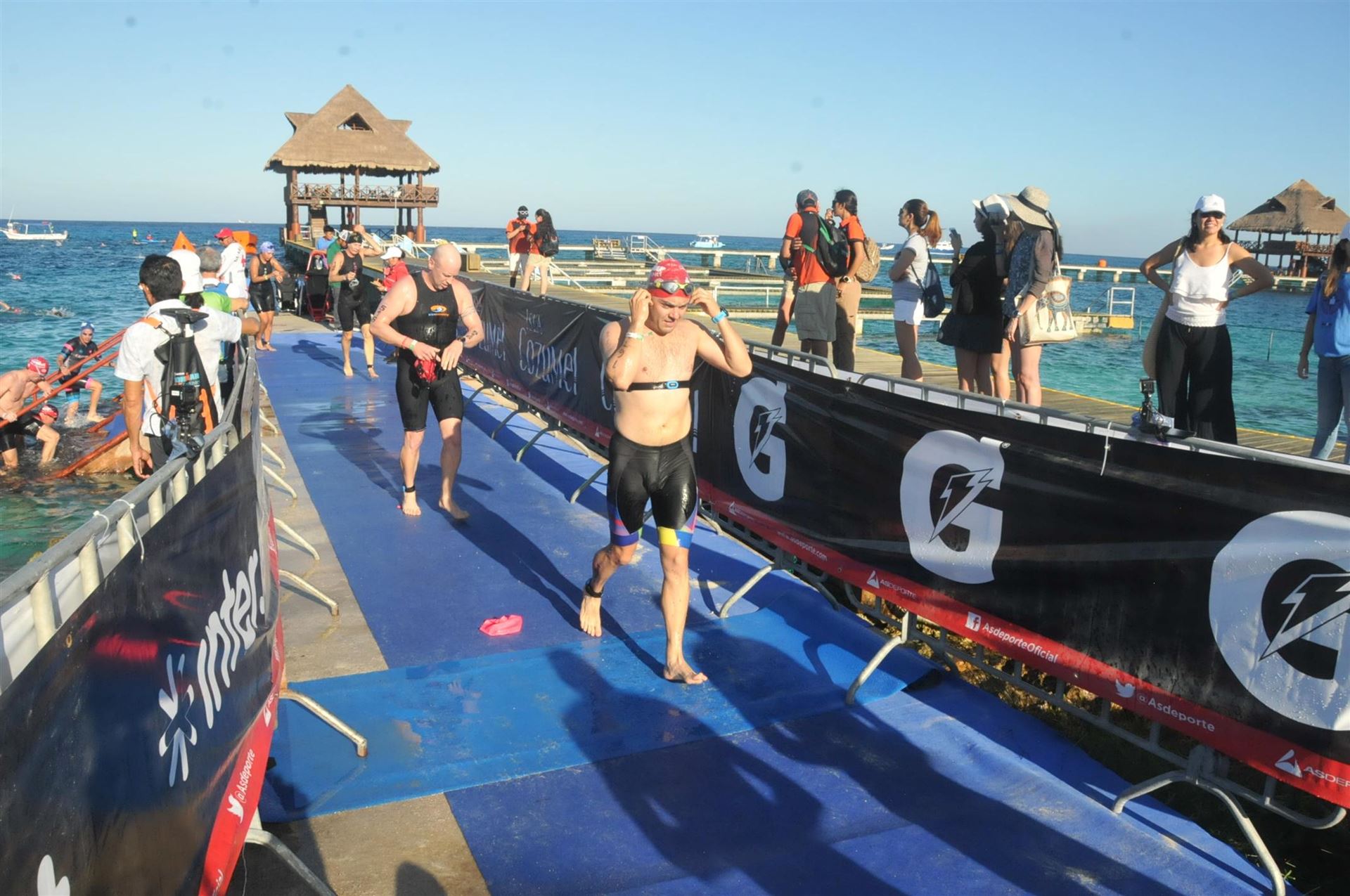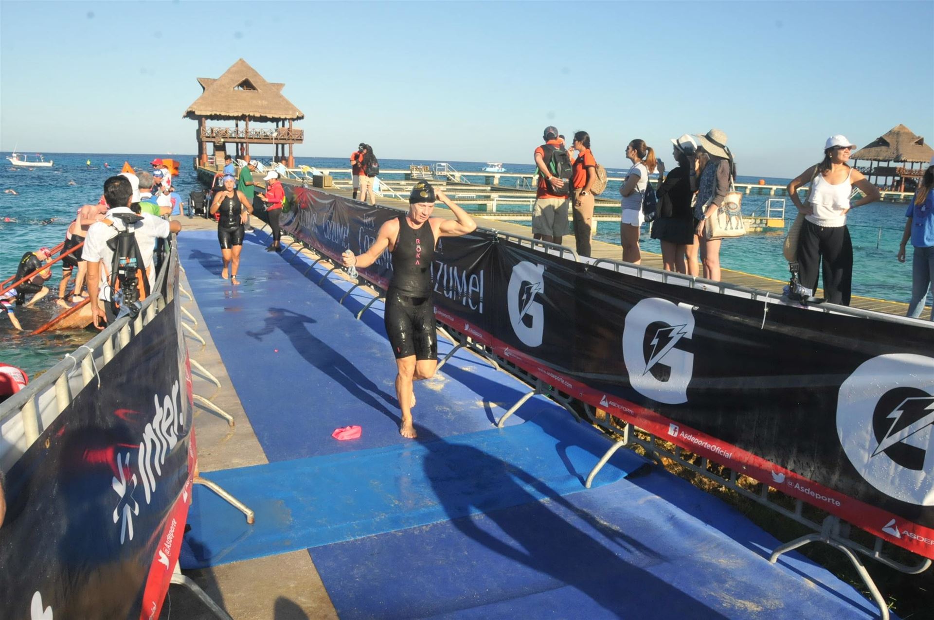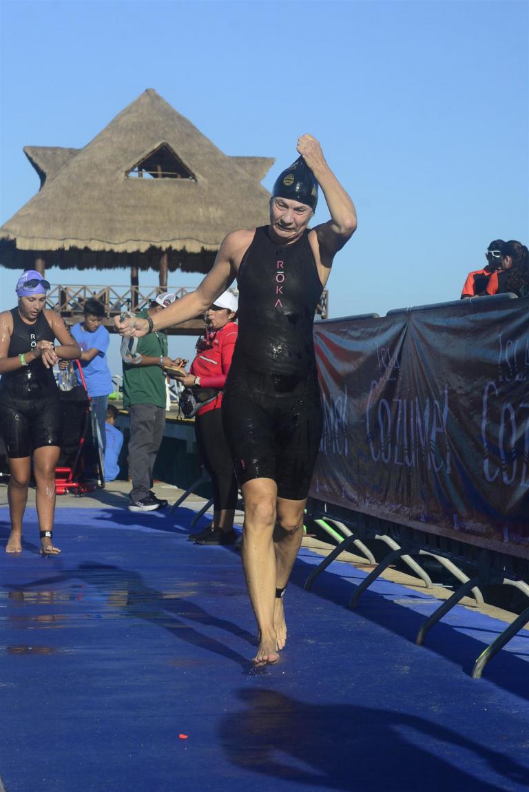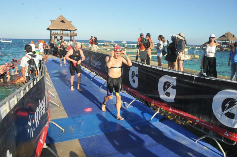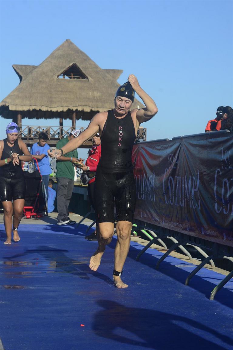 Ab 7:30 Uhr gehen die Agegrouper ins Wasser. Durch den Rollingstart gibt es kein Gedränge. Ich gehe circa um 7:42 Uhr ins Wasser. Es liegen 3,8 km im Meer schwimmen vor mir. Die Wellen meinen es an diesem Morgen gut mit mir. Der Seegang ist verhalten, meine Übelkeit erträglich. Man hat das Gefühl, man schwimmt in einem Aquarium. Man hat eine tolle Sicht. Ab und an sieht man einen Taucher am Meeresboden. Sicherheit wird groß geschrieben. Zumal aufgrund der Wassertemperatur ohne Neo geschwommen wird. Es gibt eine leichte Strömung, was die Schwimmzeit um einiges verkürzt. Die Strecke ist gut markiert, es geht 3.800 Meter in eine Richtung. Nach 1:06:04 steige ich aus dem Wasser.