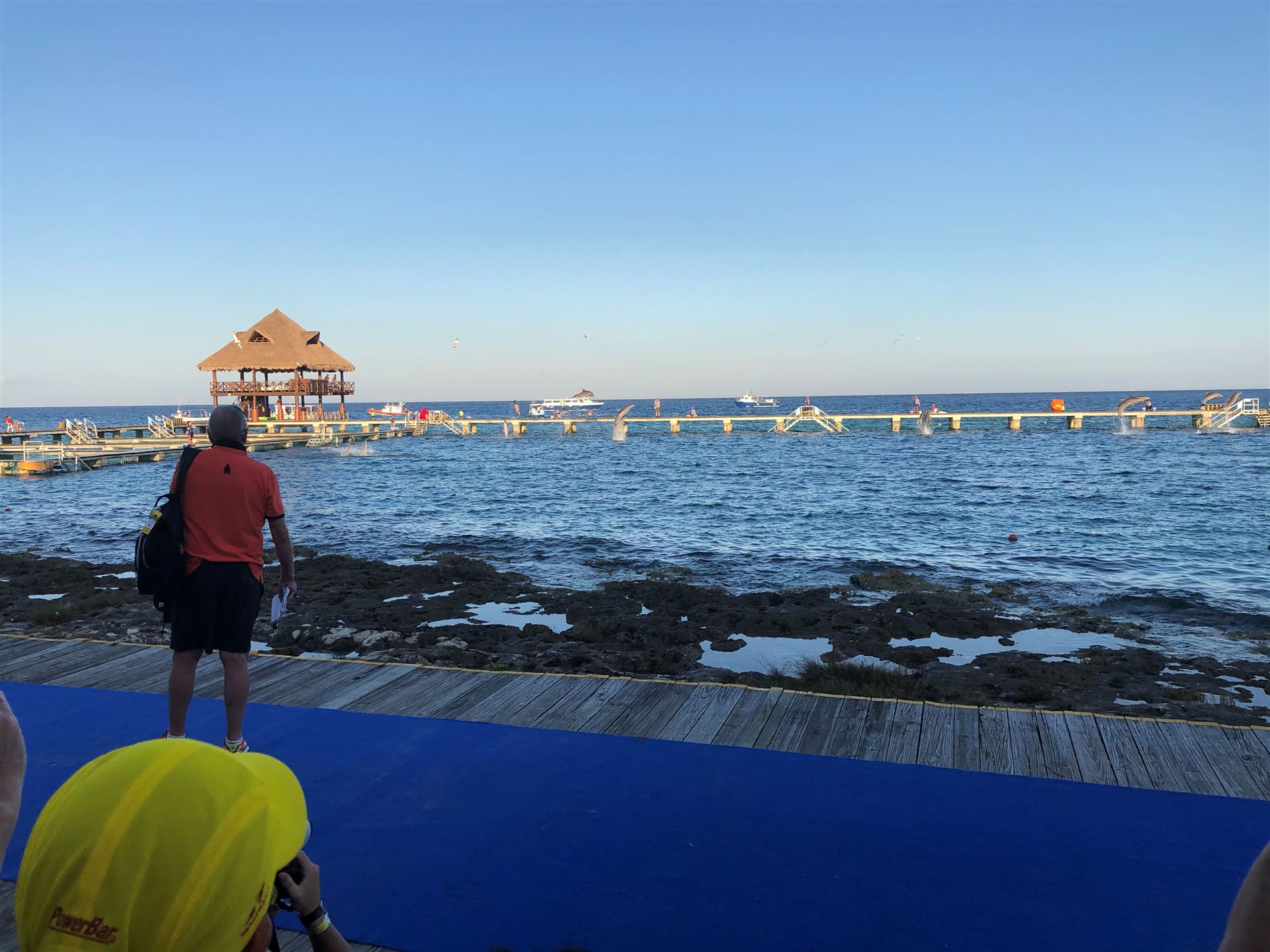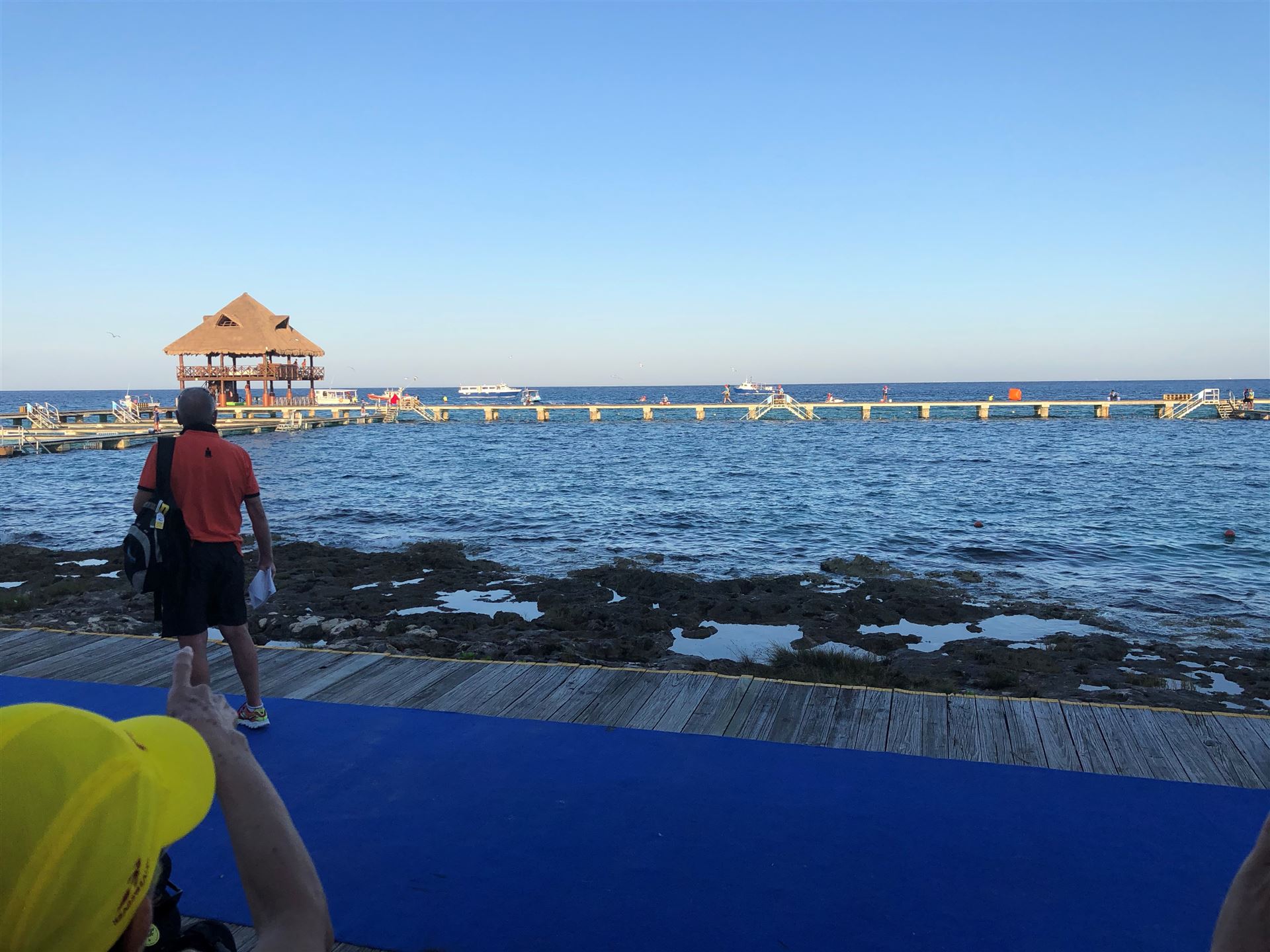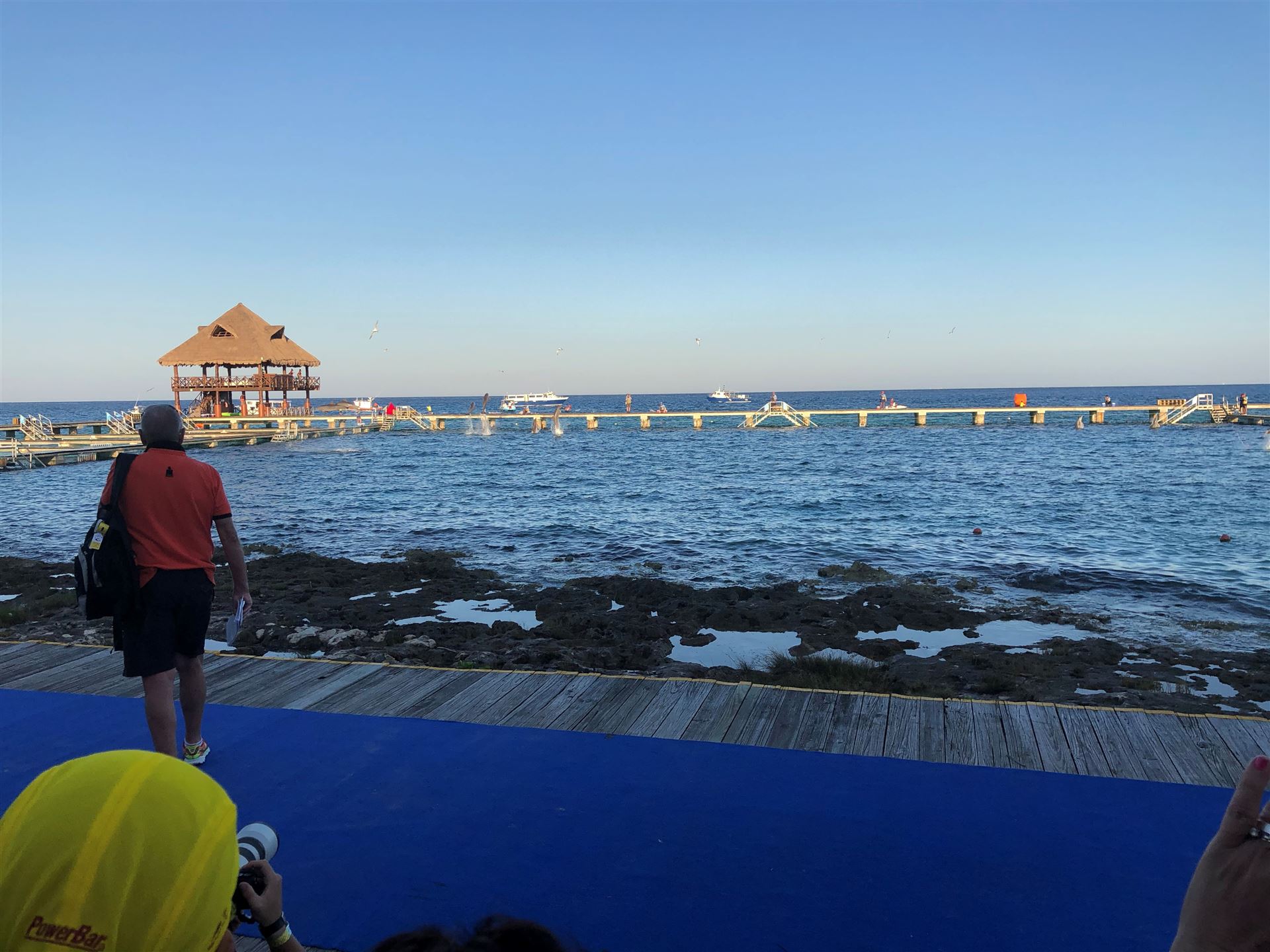 Ab 7:30 Uhr gehen die Agegrouper ins Wasser. Durch den Rollingstart gibt es kein Gedränge. Ich gehe circa um 7:42 Uhr ins Wasser. Es liegen 3,8 km im Meer schwimmen vor mir. Die Wellen meinen es an diesem Morgen gut mit mir. Der Seegang ist verhalten, meine Übelkeit erträglich. Man hat das Gefühl, man schwimmt in einem Aquarium. Man hat eine tolle Sicht. Ab und an sieht man einen Taucher am Meeresboden. Sicherheit wird groß geschrieben. Zumal aufgrund der Wassertemperatur ohne Neo geschwommen wird. Es gibt eine leichte Strömung, was die Schwimmzeit um einiges verkürzt. Die Strecke ist gut markiert, es geht 3.800 Meter in eine Richtung. Nach 1:06:04 steige ich aus dem Wasser.