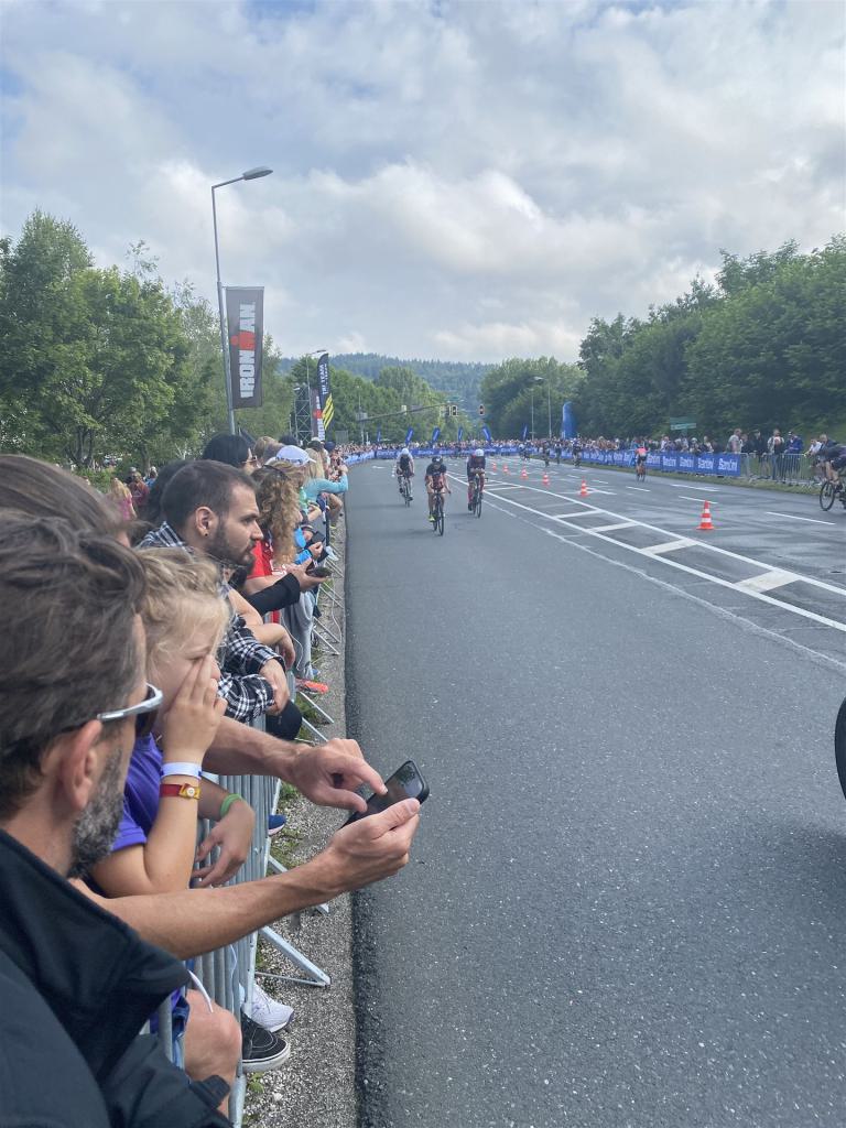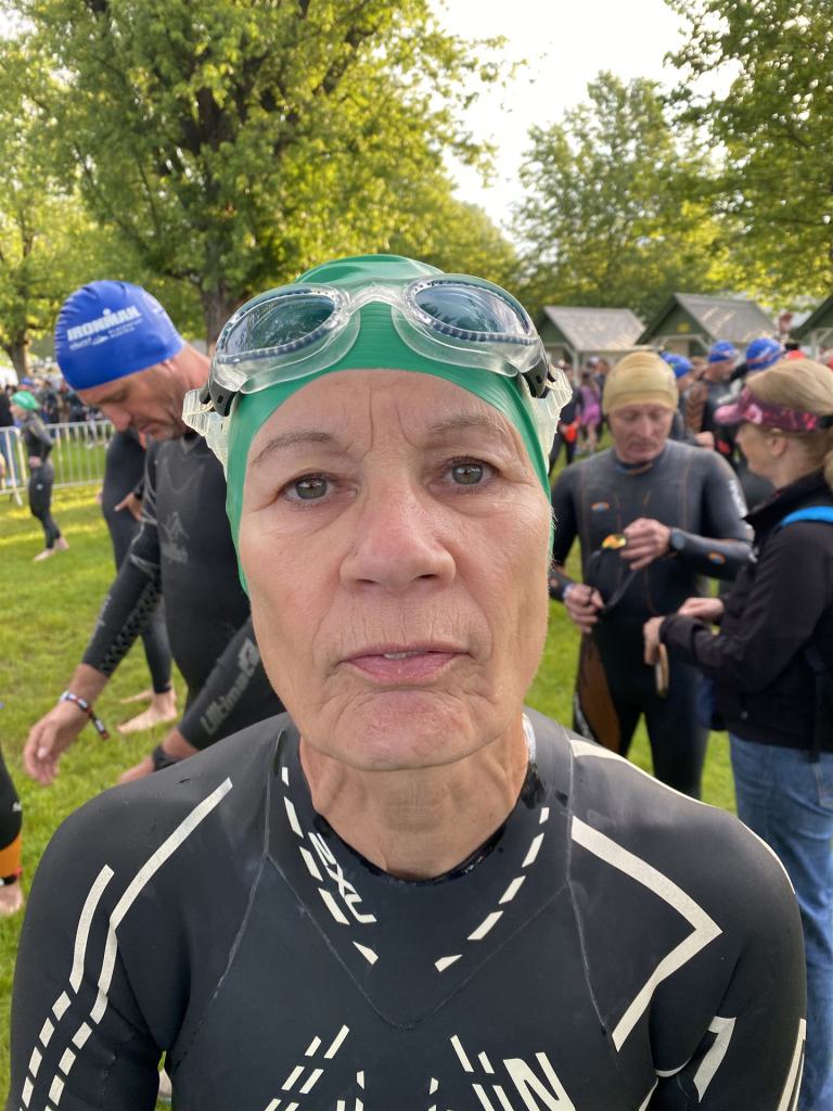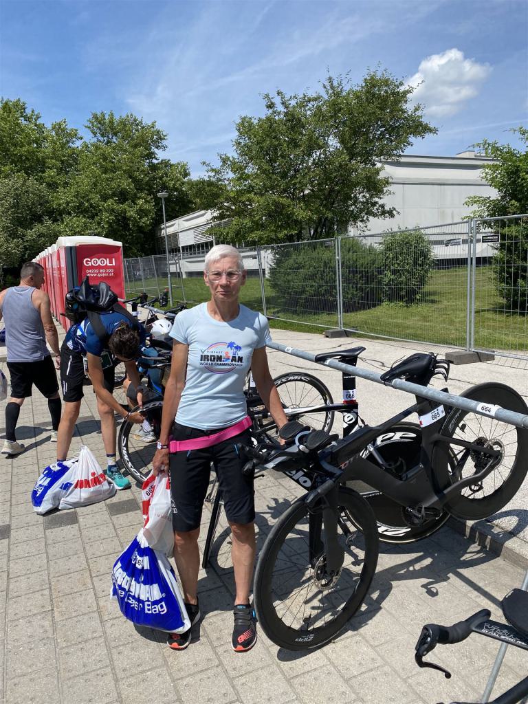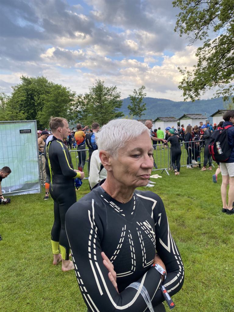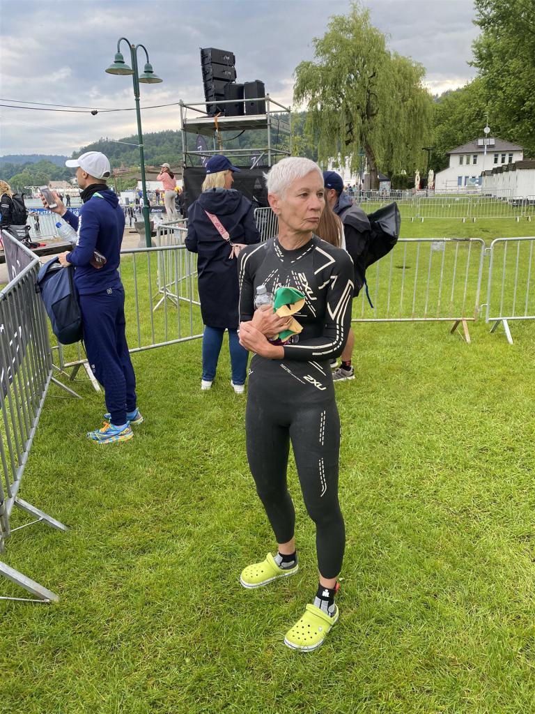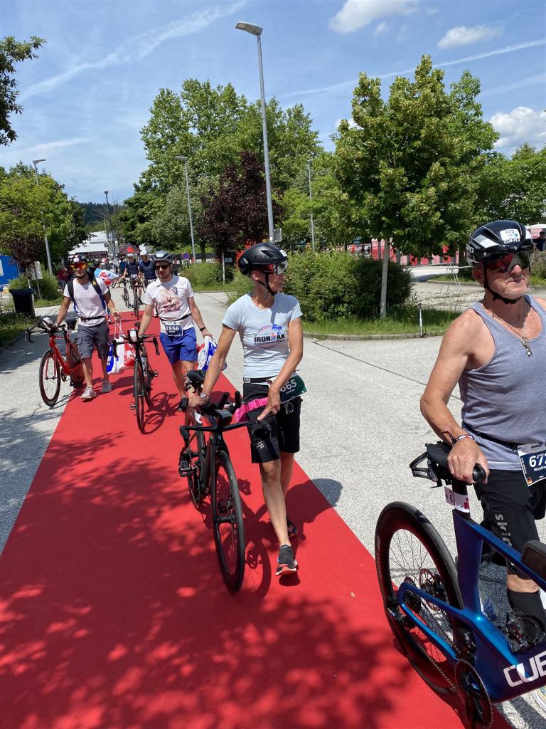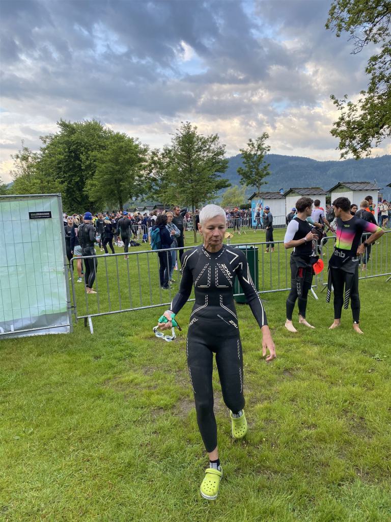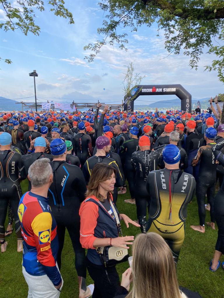 Geschwommen werden die 3,8 Kilometer im Wörthersee. Der See hat Trinkwasserqualität und ist relativ klar. Gestartet wird in Gruppen, man ordnet sich entsprechend der voraussichtlichen Schwimmzeit in eine Gruppe ein. Die Profimänner starteten um 6:30 Uhr, es gab keine Profifrauen. Ab 6:40 Uhr gingen die Agegrouper ins Wasser. Da ich keine Uhr beim Wettkampf trage konnte ich nicht einschätzen, wie lange es gedauert hat, bis ich ins Wasser konnte. Alle 5 Sekunden gingen 4 Athleten ins Wasser. Das Schwimmen war relativ entspannt, ich wurde nicht oft überholt und habe auch wenige Athleten überholt. Ich denke, die meisten Athleten haben sich korrekt eingeordnet. Der erste Streckenabschnitt klappt super, ich kann die Bojen sehr gut erkennen. Beim Rückweg in Richtung Lendkanal hatte ich leichte Schwierigkeiten mit den Bojen. War aber nicht schlimm für mich, ich habe mich an den anderen Athleten orientiert. Den Eingang zum Lendkanal konnte ich nicht erkennen, ohne Brille und dann noch direkt die Sonne, da habe mich absolut auf die anderen verlassen. Erstaunlicherweise hielt sich das Gedränge im Lendkanal auch in Grenzen, ich hatte mich Mental auf dichtes Gedränge und evtl. auch Schläge eingestellt. Nichts davon ist passiert. Das Schöne an diesem Kanal sind die Zuschauer auf beiden Seiten, die Stimmung ist super. Der Schwimmausstieg ist am Parkhotel, die Strecke bis in die Wechselzone ist relativ lang. Ich komme als 2. Frau in meiner AK aus dem Wasser. Mit meiner Schwimmzeit von 1:19:50 bin ich zufrieden.