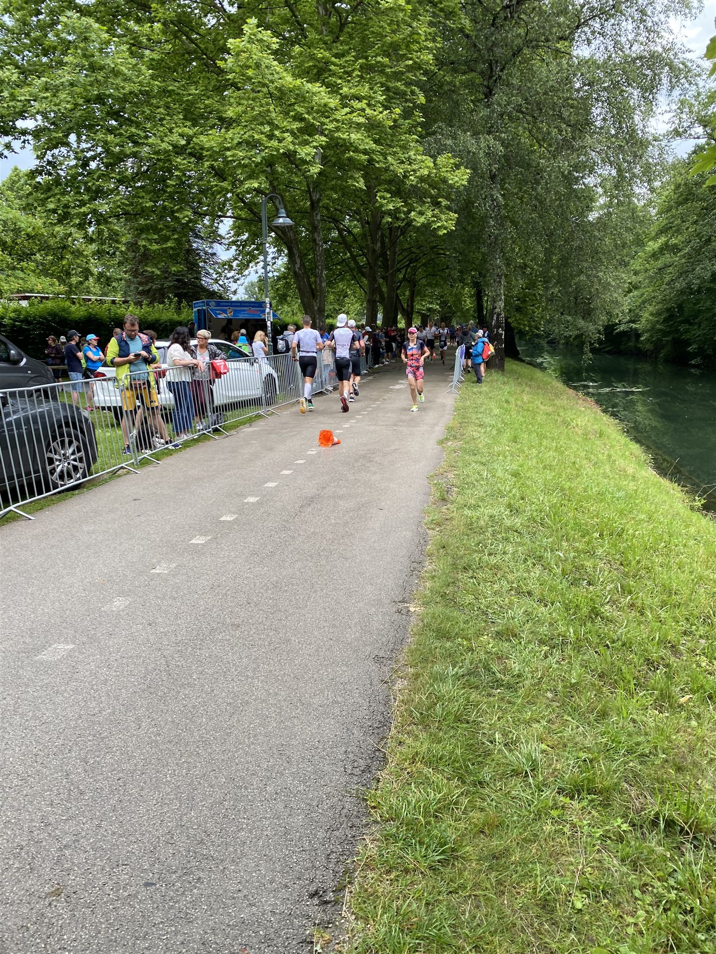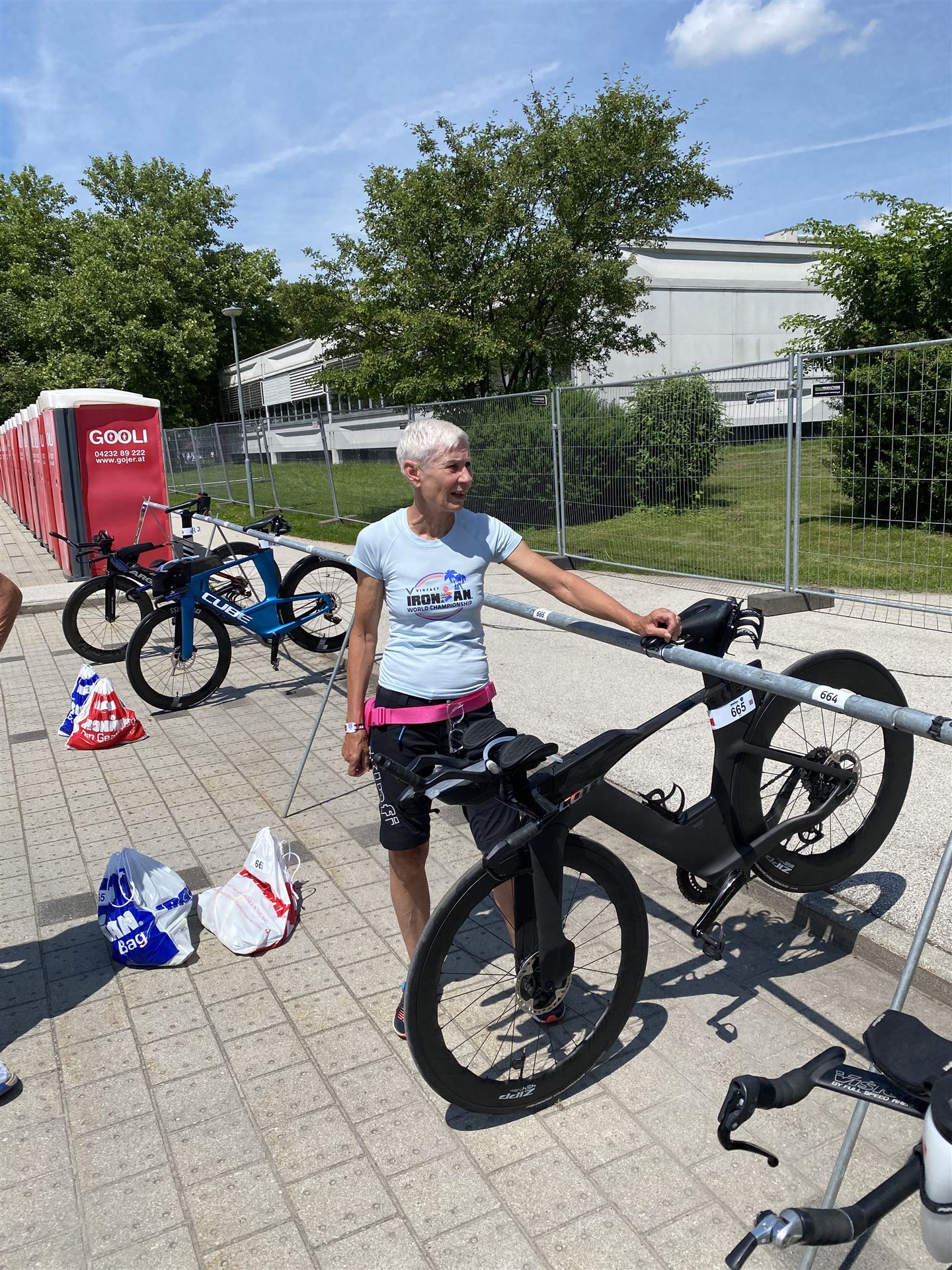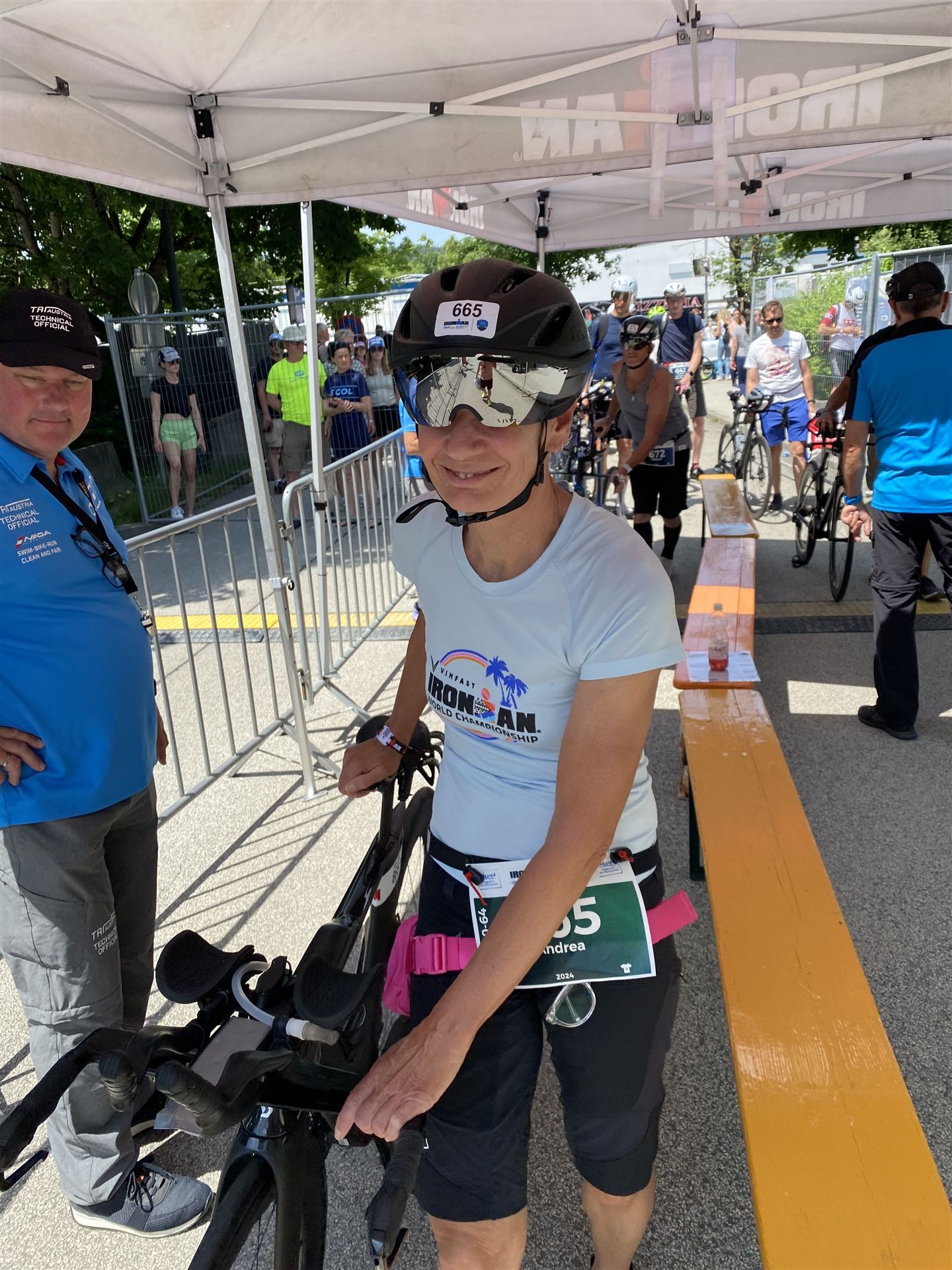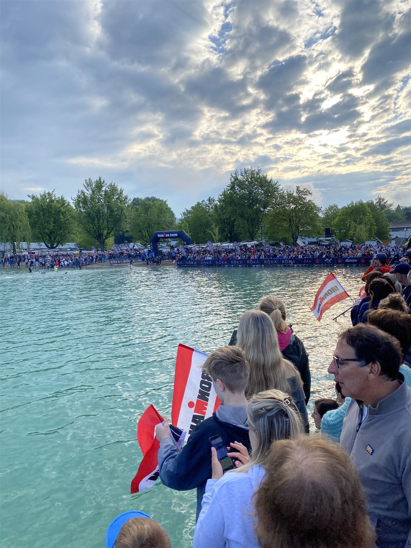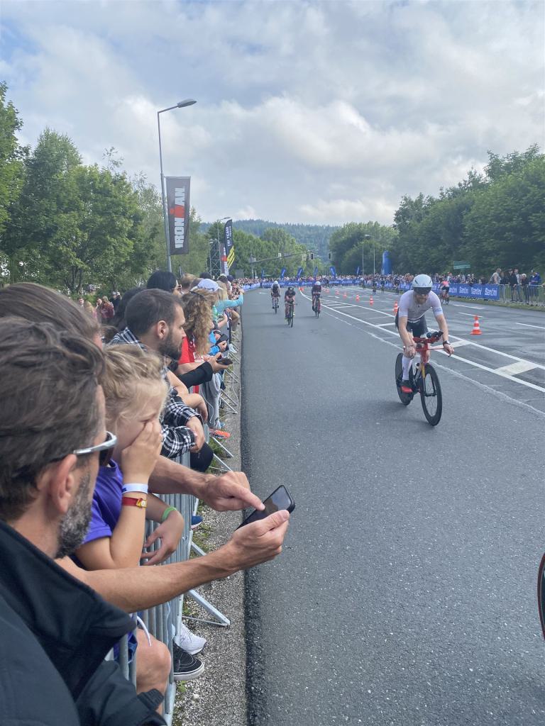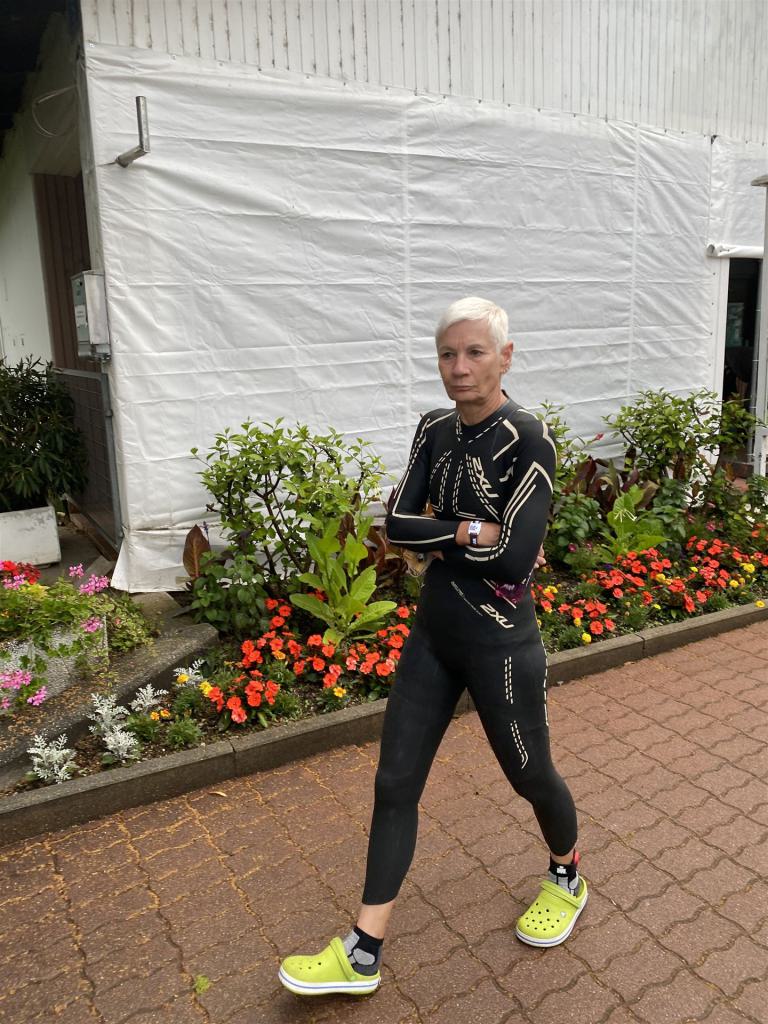 Geschwommen werden die 3,8 Kilometer im Wörthersee. Der See hat Trinkwasserqualität und ist relativ klar. Gestartet wird in Gruppen, man ordnet sich entsprechend der voraussichtlichen Schwimmzeit in eine Gruppe ein. Die Profimänner starteten um 6:30 Uhr, es gab keine Profifrauen. Ab 6:40 Uhr gingen die Agegrouper ins Wasser. Da ich keine Uhr beim Wettkampf trage konnte ich nicht einschätzen, wie lange es gedauert hat, bis ich ins Wasser konnte. Alle 5 Sekunden gingen 4 Athleten ins Wasser. Das Schwimmen war relativ entspannt, ich wurde nicht oft überholt und habe auch wenige Athleten überholt. Ich denke, die meisten Athleten haben sich korrekt eingeordnet. Der erste Streckenabschnitt klappt super, ich kann die Bojen sehr gut erkennen. Beim Rückweg in Richtung Lendkanal hatte ich leichte Schwierigkeiten mit den Bojen. War aber nicht schlimm für mich, ich habe mich an den anderen Athleten orientiert. Den Eingang zum Lendkanal konnte ich nicht erkennen, ohne Brille und dann noch direkt die Sonne, da habe mich absolut auf die anderen verlassen. Erstaunlicherweise hielt sich das Gedränge im Lendkanal auch in Grenzen, ich hatte mich Mental auf dichtes Gedränge und evtl. auch Schläge eingestellt. Nichts davon ist passiert. Das Schöne an diesem Kanal sind die Zuschauer auf beiden Seiten, die Stimmung ist super. Der Schwimmausstieg ist am Parkhotel, die Strecke bis in die Wechselzone ist relativ lang. Ich komme als 2. Frau in meiner AK aus dem Wasser. Mit meiner Schwimmzeit von 1:19:50 bin ich zufrieden.