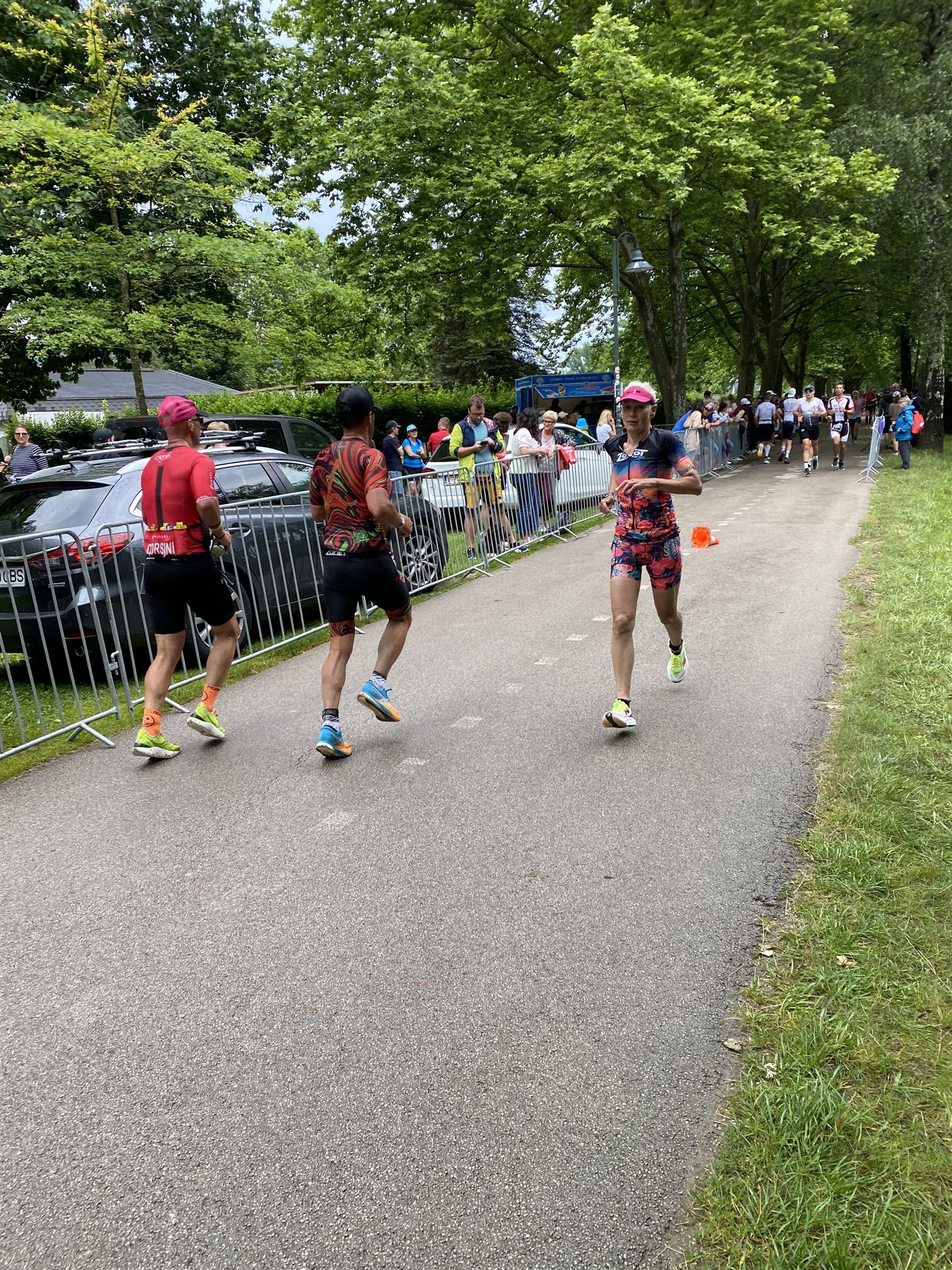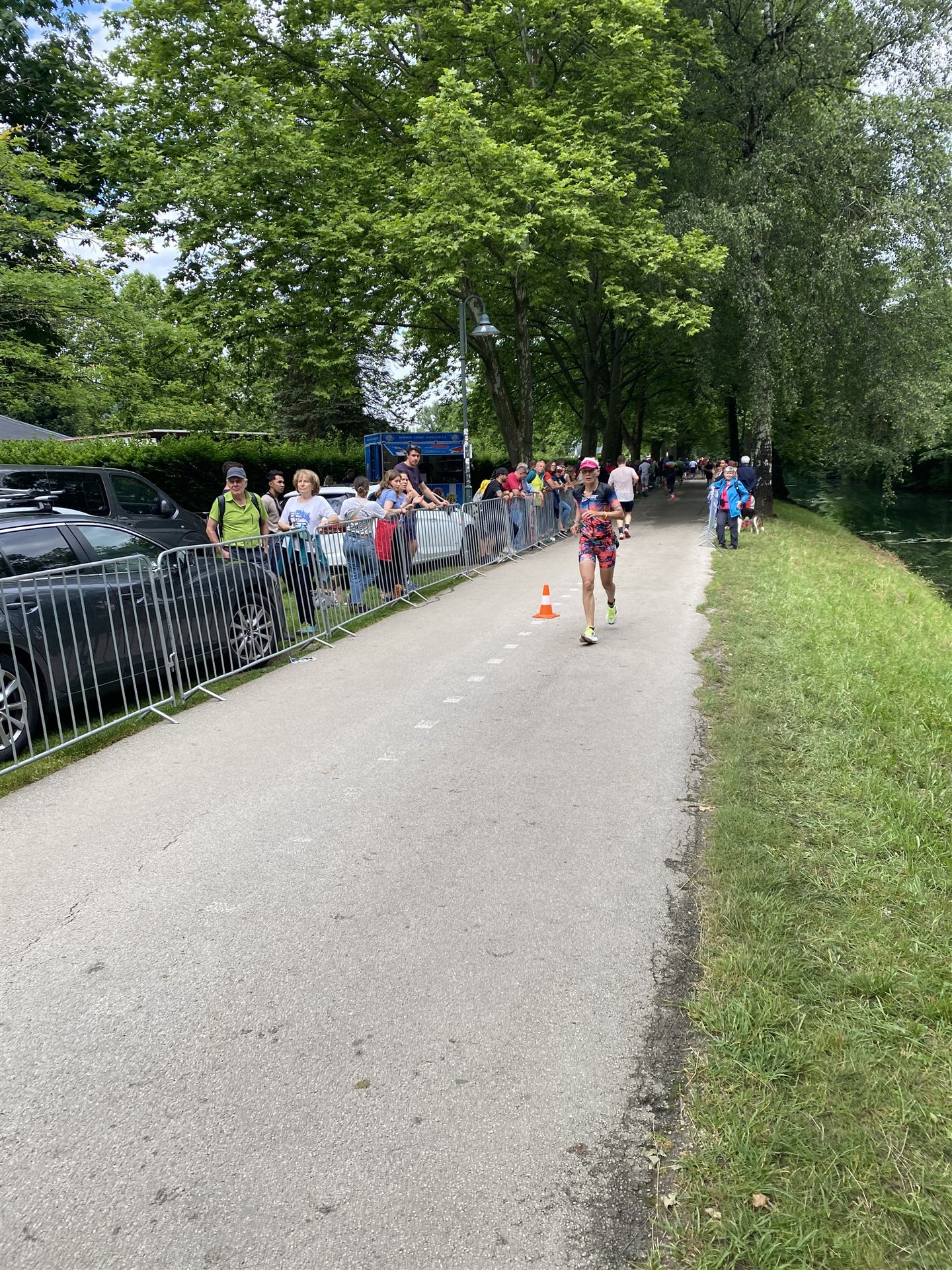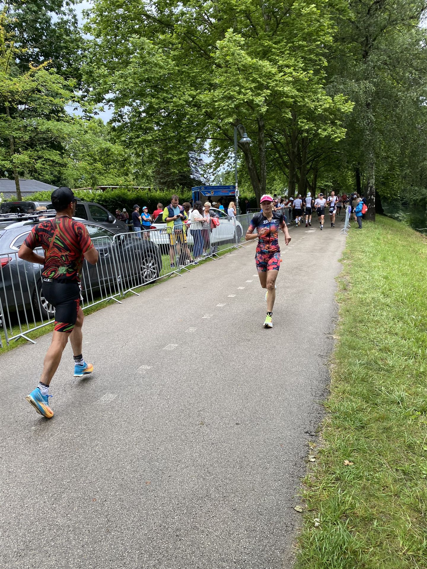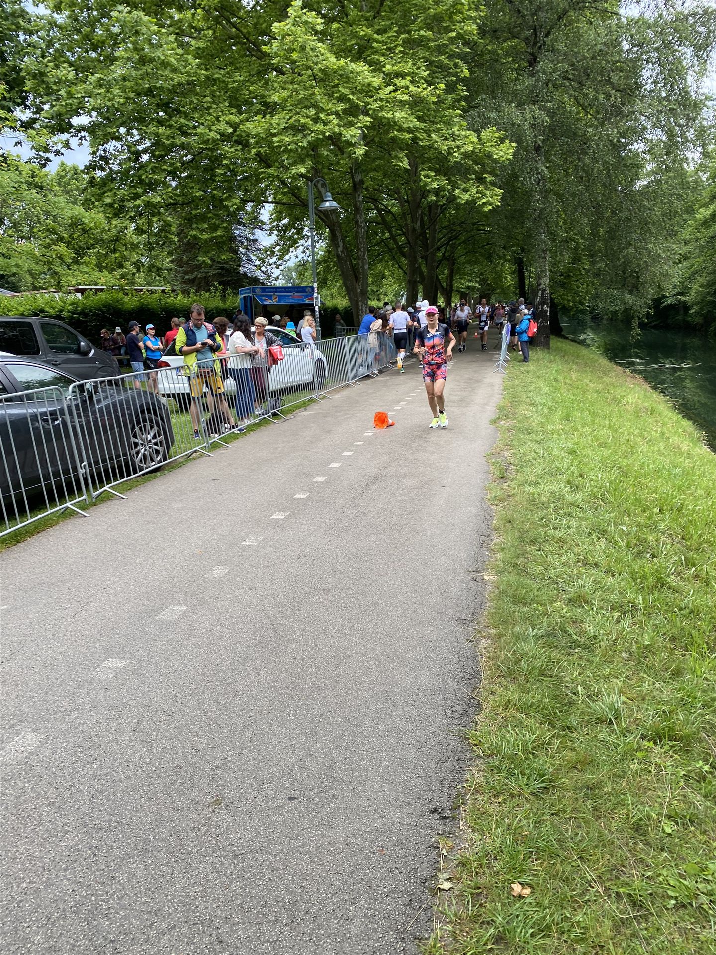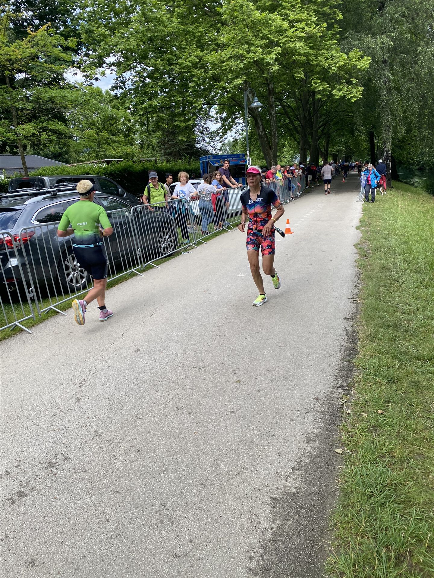Geschwommen werden die 3,8 Kilometer im Wörthersee. Der See hat Trinkwasserqualität und ist relativ klar. Gestartet wird in Gruppen, man ordnet sich entsprechend der voraussichtlichen Schwimmzeit in eine Gruppe ein. Die Profimänner starteten um 6:30 Uhr, es gab keine Profifrauen. Ab 6:40 Uhr gingen die Agegrouper ins Wasser. Da ich keine Uhr beim Wettkampf trage konnte ich nicht einschätzen, wie lange es gedauert hat, bis ich ins Wasser konnte. Alle 5 Sekunden gingen 4 Athleten ins Wasser. Das Schwimmen war relativ entspannt, ich wurde nicht oft überholt und habe auch wenige Athleten überholt. Ich denke, die meisten Athleten haben sich korrekt eingeordnet. Der erste Streckenabschnitt klappt super, ich kann die Bojen sehr gut erkennen. Beim Rückweg in Richtung Lendkanal hatte ich leichte Schwierigkeiten mit den Bojen. War aber nicht schlimm für mich, ich habe mich an den anderen Athleten orientiert. Den Eingang zum Lendkanal konnte ich nicht erkennen, ohne Brille und dann noch direkt die Sonne, da habe mich absolut auf die anderen verlassen. Erstaunlicherweise hielt sich das Gedränge im Lendkanal auch in Grenzen, ich hatte mich Mental auf dichtes Gedränge und evtl. auch Schläge eingestellt. Nichts davon ist passiert. Das Schöne an diesem Kanal sind die Zuschauer auf beiden Seiten, die Stimmung ist super. Der Schwimmausstieg ist am Parkhotel, die Strecke bis in die Wechselzone ist relativ lang. Ich komme als 2. Frau in meiner AK aus dem Wasser. Mit meiner Schwimmzeit von 1:19:50 bin ich zufrieden.