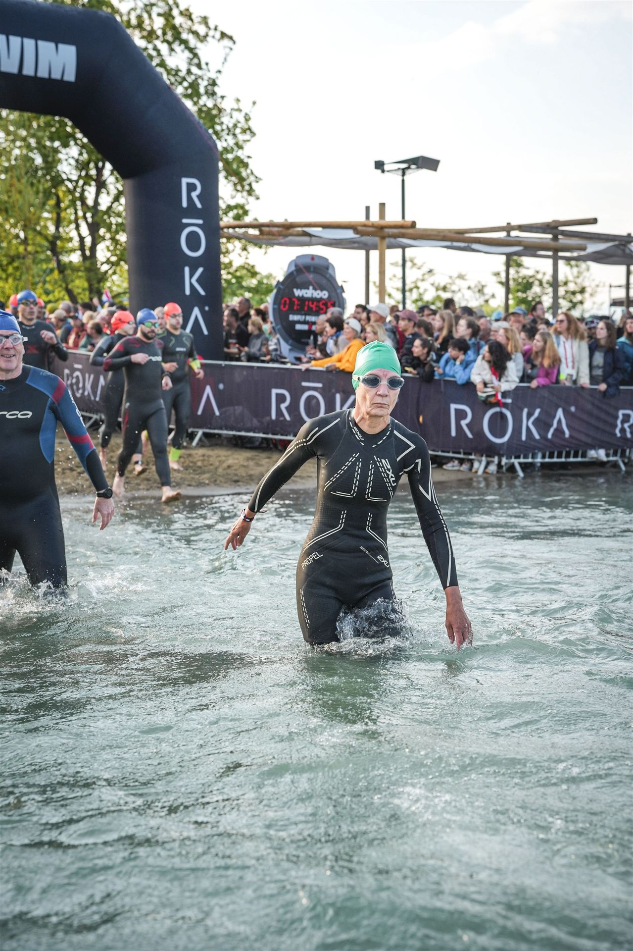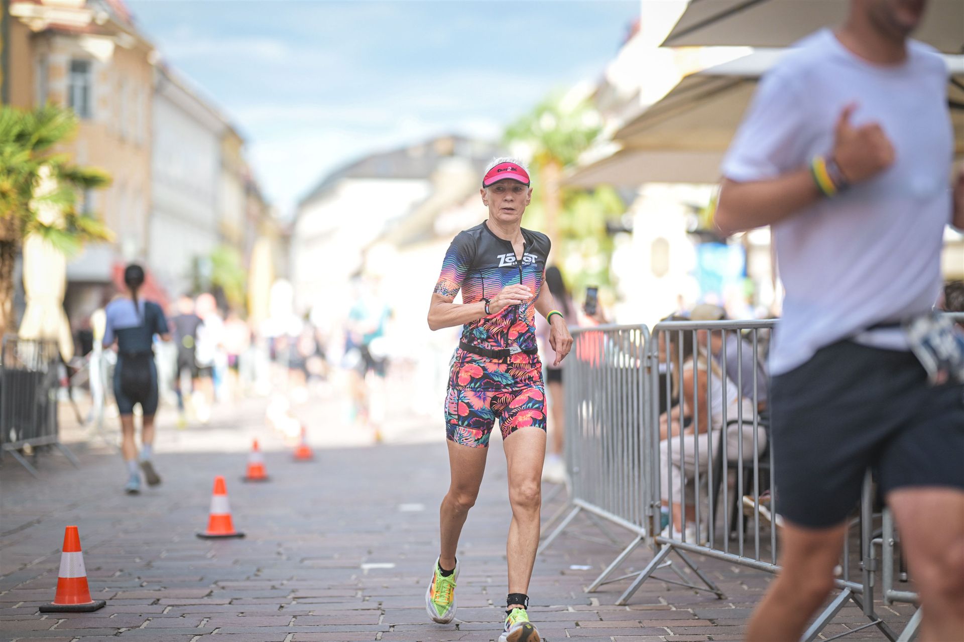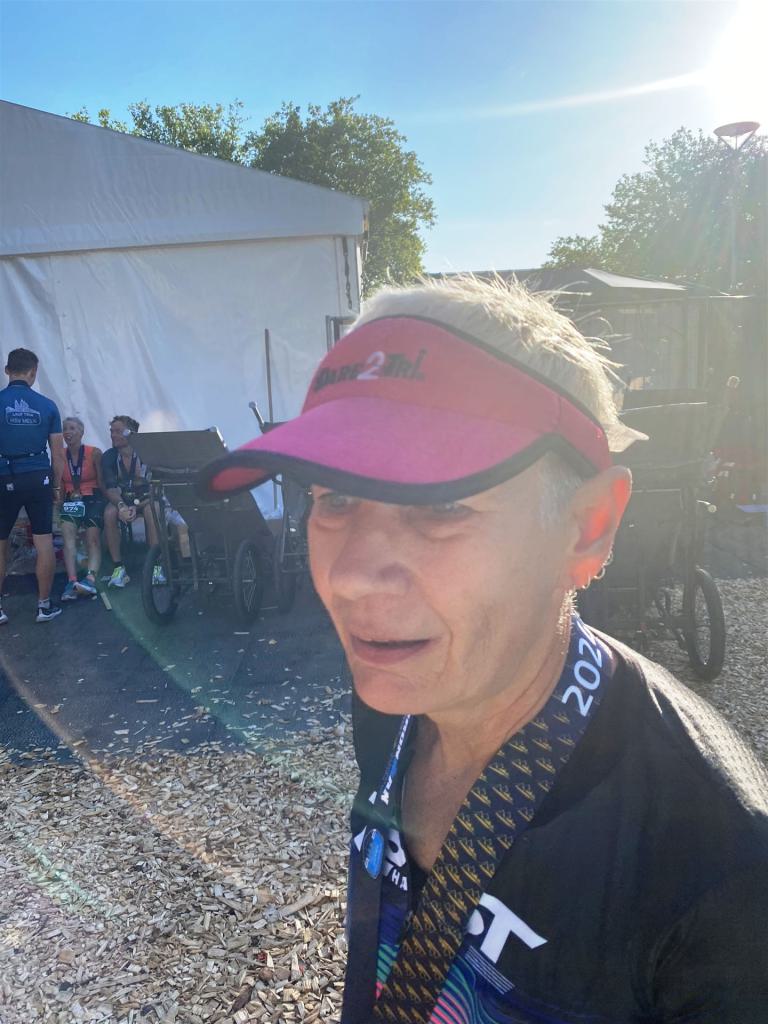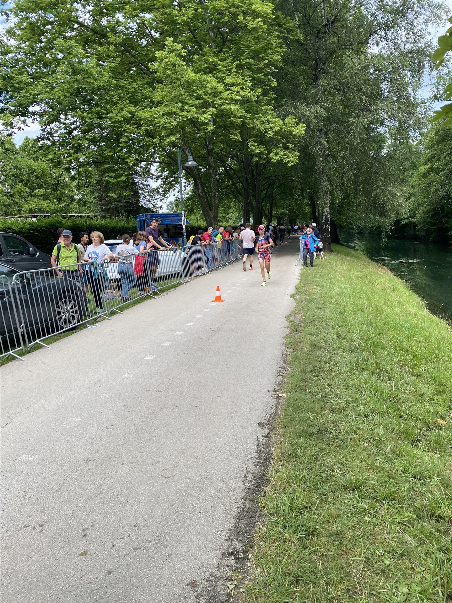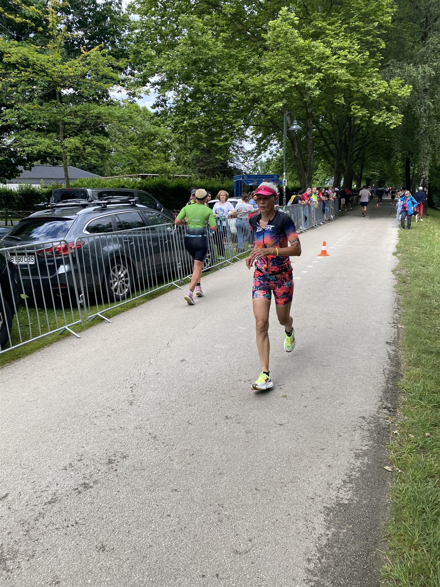 Geschwommen werden die 3,8 Kilometer im Wörthersee. Der See hat Trinkwasserqualität und ist relativ klar. Gestartet wird in Gruppen, man ordnet sich entsprechend der voraussichtlichen Schwimmzeit in eine Gruppe ein. Die Profimänner starteten um 6:30 Uhr, es gab keine Profifrauen. Ab 6:40 Uhr gingen die Agegrouper ins Wasser. Da ich keine Uhr beim Wettkampf trage konnte ich nicht einschätzen, wie lange es gedauert hat, bis ich ins Wasser konnte. Alle 5 Sekunden gingen 4 Athleten ins Wasser. Das Schwimmen war relativ entspannt, ich wurde nicht oft überholt und habe auch wenige Athleten überholt. Ich denke, die meisten Athleten haben sich korrekt eingeordnet. Der erste Streckenabschnitt klappt super, ich kann die Bojen sehr gut erkennen. Beim Rückweg in Richtung Lendkanal hatte ich leichte Schwierigkeiten mit den Bojen. War aber nicht schlimm für mich, ich habe mich an den anderen Athleten orientiert. Den Eingang zum Lendkanal konnte ich nicht erkennen, ohne Brille und dann noch direkt die Sonne, da habe mich absolut auf die anderen verlassen. Erstaunlicherweise hielt sich das Gedränge im Lendkanal auch in Grenzen, ich hatte mich Mental auf dichtes Gedränge und evtl. auch Schläge eingestellt. Nichts davon ist passiert. Das Schöne an diesem Kanal sind die Zuschauer auf beiden Seiten, die Stimmung ist super. Der Schwimmausstieg ist am Parkhotel, die Strecke bis in die Wechselzone ist relativ lang. Ich komme als 2. Frau in meiner AK aus dem Wasser. Mit meiner Schwimmzeit von 1:19:50 bin ich zufrieden.