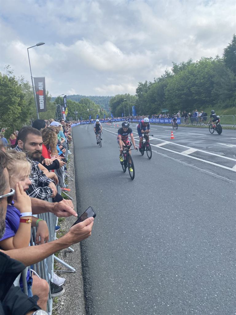 Aufgrund der für meine Verhältnisse niedrigen Temperaturen ziehe ich Socken mit klassischen Rennradschuhen sowie ein Trikot über. Das war die beste Entscheidung. Das erste Stück der Radstrecke führt am Wörthersee entlang. Die Straßen sind noch nass vom Regen, dafür ist die Aussicht traumhaft. Es lässt sich relativ gut fahren, durch den Rolling-Start ist das Feld nicht so dicht. Selbstverständlich muss man schauen, dass man keinen Windschatten fährt, es klappt aber ganz gut. Der erste längere Anstieg ist der Faaker See. Aufgrund der Wetterverhältnisse sind nicht viele Zuschauer am Anstieg. Ich kurble den Anstieg im kleinen Gang hoch, ist kein Problem für mich. Danach kommt ein flaches Stück, da gibt es immer relativ viel Gegenwind. Ich fühle mich sehr gut auf dem Rad, habe Druck auf den Pedalen und kann den Wettkampf genießen. Die Wettervorhersage passt leider nicht ganz zum tatsächlichen Wetter. Es gibt Strecken mit Starkregen, die Straßen sind sehr nass, bei den Abfahrten muss man aufpassen. Den zweiten längeren Anstieg (Ruperti Berg) fahre ich auch ohne Probleme, bei den Abfahrten muss man aufpassen. Der 180 Kilometerkurs besteht aus 2 Runden. Die Anstiege müssen zweimal gefahren werden. Auf der zweiten Runde sind die Steigungen dann doch etwas schwerer. Insgesamt bin ich mit meiner Radzeit von 6:01:37 Stunden sehr zu frieden.