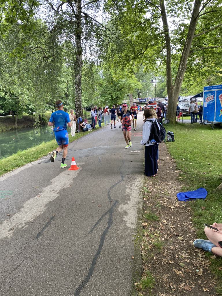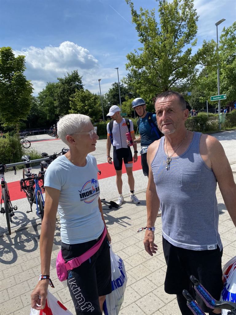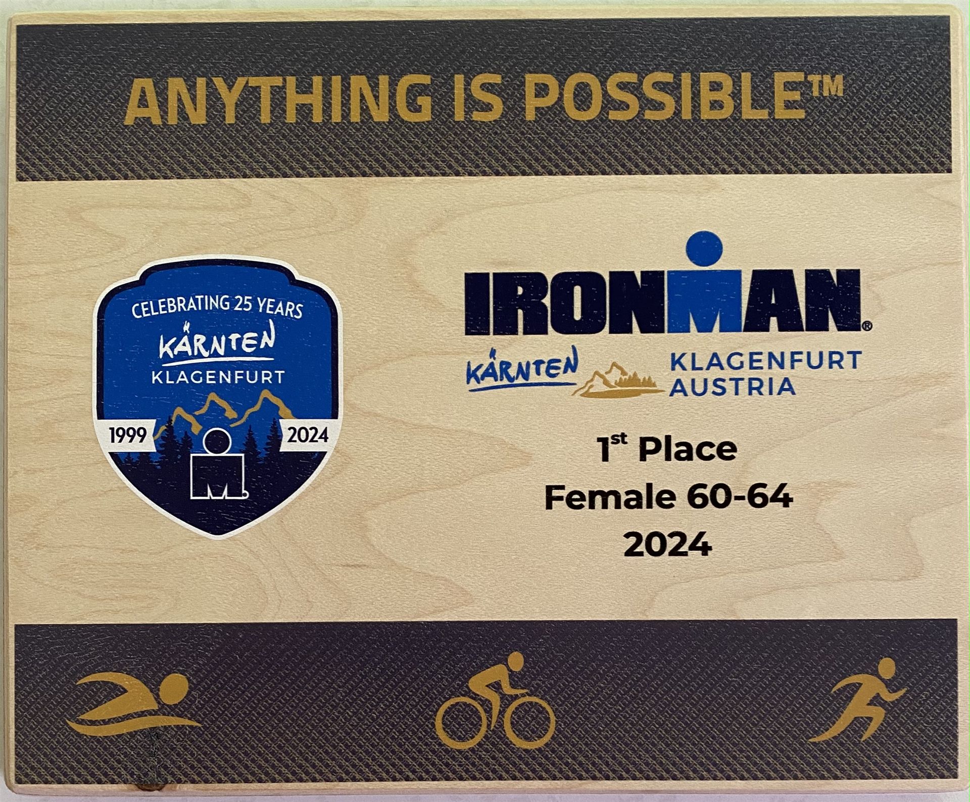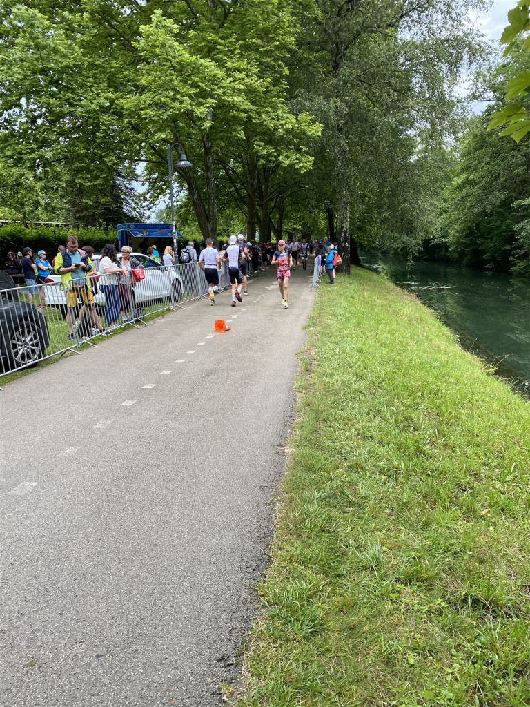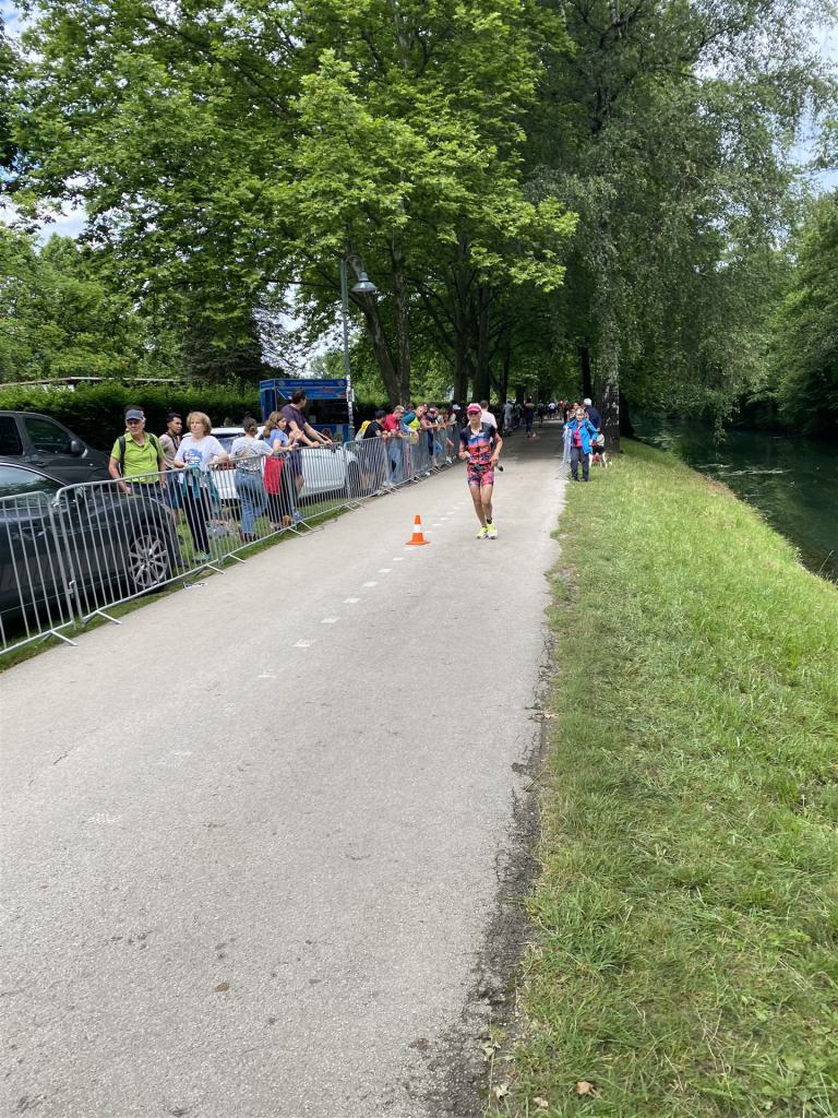 Ab in die Wechselzone und die Radschuhe mit den Laufschuhen tauschen. Aufgrund der Temperatur entscheide ich mich, mein Trikot anzulassen. Ich gehe als erste Frau in meiner AK mit einem Vorsprung von circa 18 Minuten auf die Laufstrecke. Nach dem ersten Kilometer geht es mir nicht so gut, ich fühle mich schlapp. Das kenne ich überhaupt nicht von mir. Anscheinend habe ich auf dem Rad nicht ausreichend gegessen. Normalerweise kann ich nach dem Rad direkt ohne Probleme los laufen, dieses Mal habe ich Probleme. Ich entscheide mich bis zur ersten Verpflegungsstelle Gehpausen einzulegen. An der ersten Verpflegungsstelle bin ich vorbei gelaufen, keine Ahnung weshalb. Das ist Wettkampf, da passieren solche Dingen. Bei der 2. Verpflegungsstelle nehme ich mir etwas Zeit und esse und trinke ordentlich. Danach geht es mir viel besser. Nach den ersten 10 Kilometern konnte ich meinen Vorsprung auf die Zweite bereits etwas ausbauen. Ich halte bei jeder Verpflegungsstelle an und nehme Flüssigkeit bzw. Gel zu mir. Der Vorsprung wird immer größer. Werner hält mich auf dem Laufenden. Ab circa Kilometer 32 habe ich Probleme mit der Verpflegung. Ich kann nichts mehr aufnehmen, mein Magen rebelliert. Ich entscheide spontan, dass ich es mit Cola probiere. Die Strategie geht auf, mein Magen rebelliert nicht mehr. Da ich bereits einen Vorsprung von über 45 Minuten auf den letzten 10 Kilometern habe gehe ich auf Nummer sicher. Ich nehme nur noch Cola zu mir und lege die ein- oder andere Gehpause ein. Ich bin zuversichtlich als Erste ins Ziel zu kommen. Bei Kilometer 39 bin ich schon leicht euphorisch, laufe jedoch weiter verhalten. Kein unnötiges Risiko eingehen. Bei Kilometer 41 fange ich an innerlich zu jubeln. Auf dem letzten Kilometer sind alle Probleme vergessen, es geht in Richtung Ziel. Der Zieleinlauf ist für jeden Athleten etwas Besonderes. Direkt im Ziel wartet bereits Werner auf mich und überreicht mir die Finisher Medaille. Das ist ein toller Moment. Natürlich habe ich, wie immer, vergessen auf meine Endzeit zu schauen. Wichtig für mich ist, ins Ziel zu kommen. Natürlich freut man sich, wenn dann noch eine gute Zeit bzw. Platzierung raus komm. Den Marathon bin ich in einer Zeit von 4:13:33 gelaufen. Meine Gesamtzeit beträgt 11:51:30 Stunden. Wahnsinn, ich bin total begeistert mit dieser Zeit gefinisht zu haben. Die Zweite in meiner AK kommt erst 1:17 Stunden nach mir ins Ziel. Es ist toll wieviel Zeit ich noch rauslaufen konnte. Es war wieder ein tolles Erlebnis in Klagenfurt und ich bin dankbar bei diesem Jubiläum dabei sein zu können. Nach dem Wettkampf gibt es noch eine Woche Urlaub und Erholung, danach geht der Focus auf die Weltmeisterschaft in Nizza.