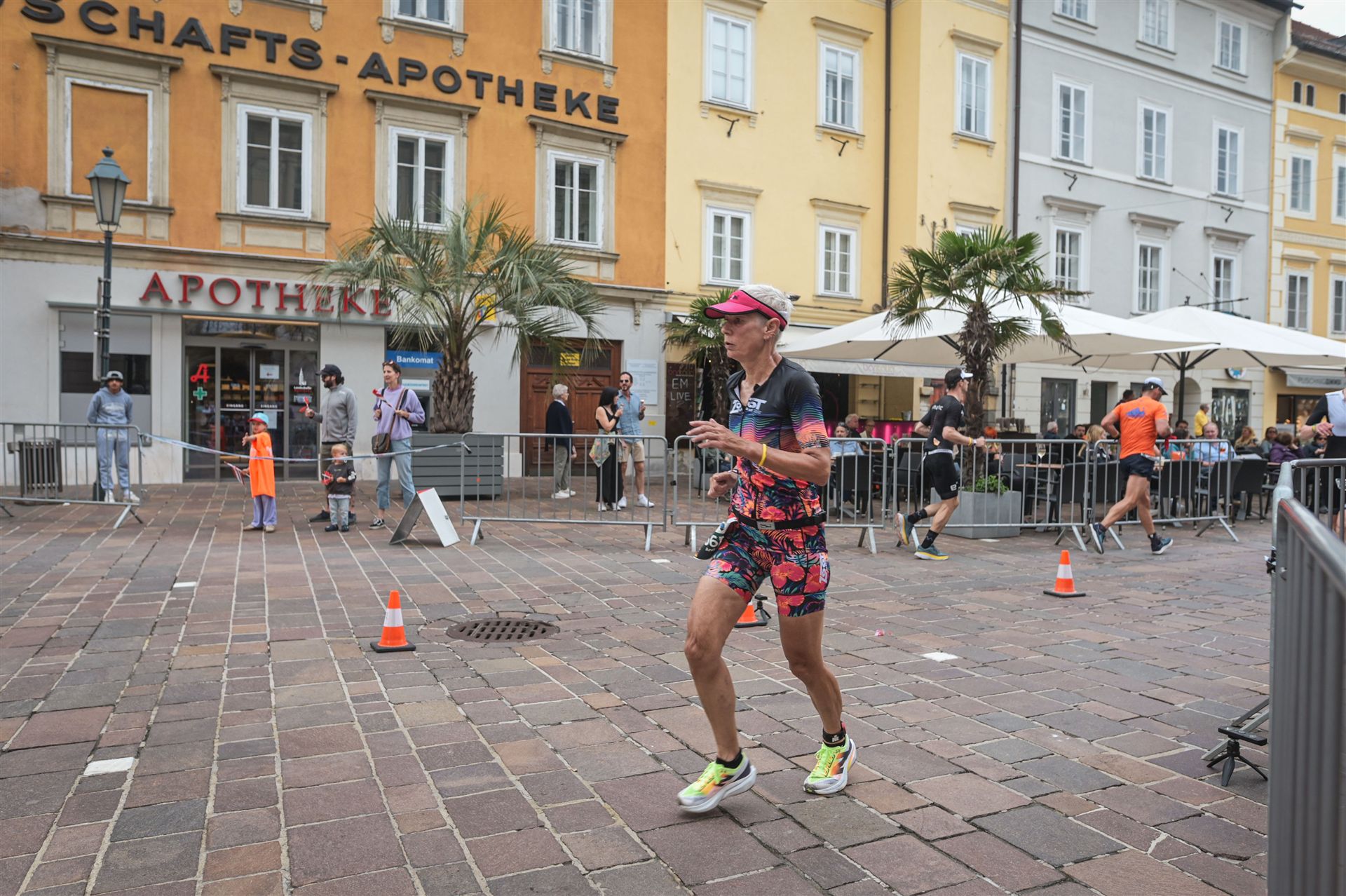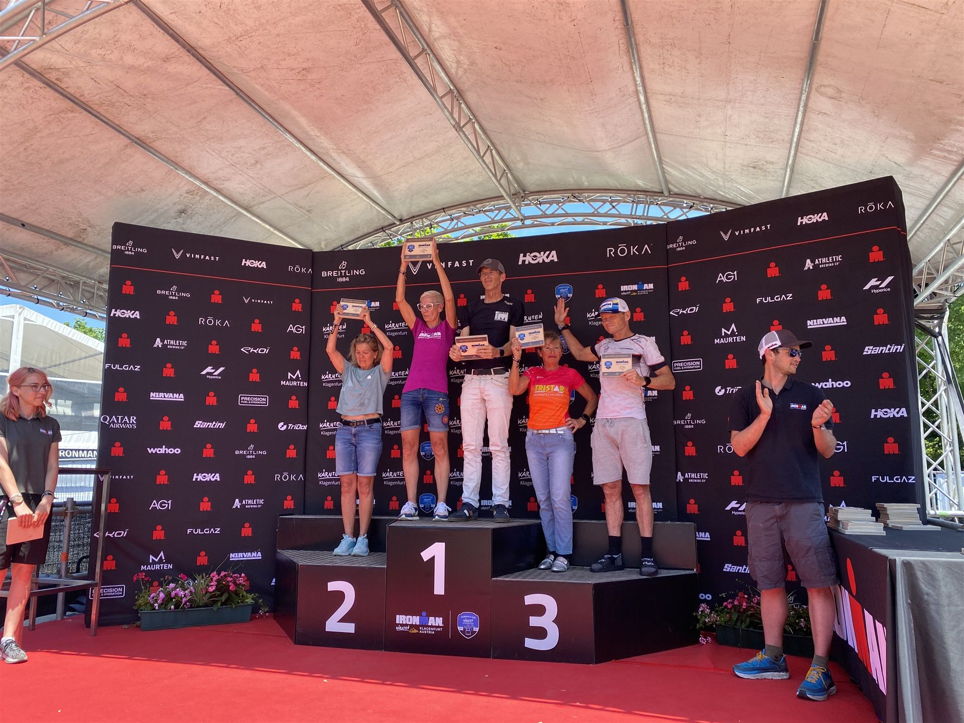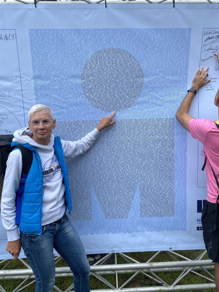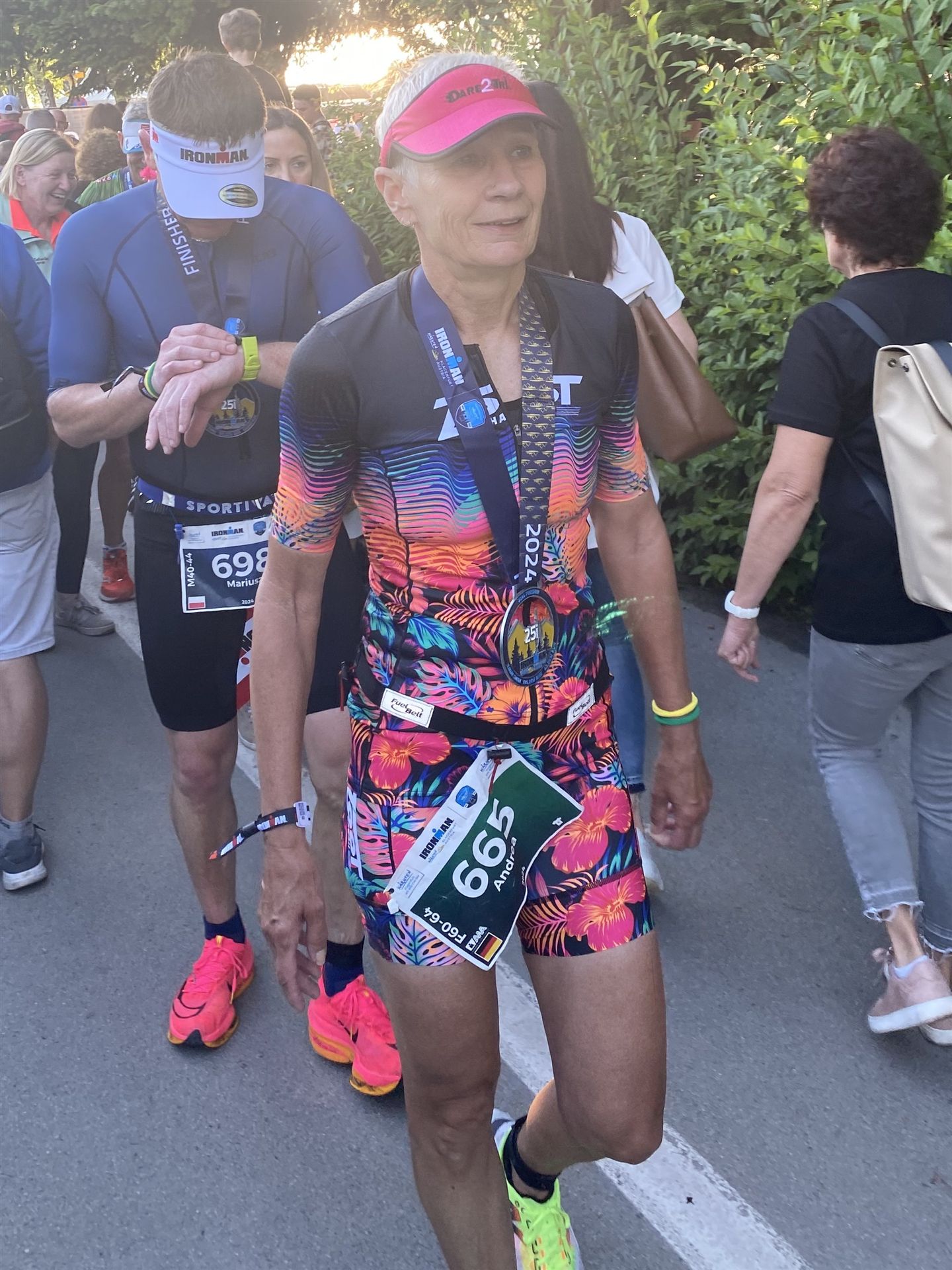 Ab in die Wechselzone und die Radschuhe mit den Laufschuhen tauschen. Aufgrund der Temperatur entscheide ich mich, mein Trikot anzulassen. Ich gehe als erste Frau in meiner AK mit einem Vorsprung von circa 18 Minuten auf die Laufstrecke. Nach dem ersten Kilometer geht es mir nicht so gut, ich fühle mich schlapp. Das kenne ich überhaupt nicht von mir. Anscheinend habe ich auf dem Rad nicht ausreichend gegessen. Normalerweise kann ich nach dem Rad direkt ohne Probleme los laufen, dieses Mal habe ich Probleme. Ich entscheide mich bis zur ersten Verpflegungsstelle Gehpausen einzulegen. An der ersten Verpflegungsstelle bin ich vorbei gelaufen, keine Ahnung weshalb. Das ist Wettkampf, da passieren solche Dingen. Bei der 2. Verpflegungsstelle nehme ich mir etwas Zeit und esse und trinke ordentlich. Danach geht es mir viel besser. Nach den ersten 10 Kilometern konnte ich meinen Vorsprung auf die Zweite bereits etwas ausbauen. Ich halte bei jeder Verpflegungsstelle an und nehme Flüssigkeit bzw. Gel zu mir. Der Vorsprung wird immer größer. Werner hält mich auf dem Laufenden. Ab circa Kilometer 32 habe ich Probleme mit der Verpflegung. Ich kann nichts mehr aufnehmen, mein Magen rebelliert. Ich entscheide spontan, dass ich es mit Cola probiere. Die Strategie geht auf, mein Magen rebelliert nicht mehr. Da ich bereits einen Vorsprung von über 45 Minuten auf den letzten 10 Kilometern habe gehe ich auf Nummer sicher. Ich nehme nur noch Cola zu mir und lege die ein- oder andere Gehpause ein. Ich bin zuversichtlich als Erste ins Ziel zu kommen. Bei Kilometer 39 bin ich schon leicht euphorisch, laufe jedoch weiter verhalten. Kein unnötiges Risiko eingehen. Bei Kilometer 41 fange ich an innerlich zu jubeln. Auf dem letzten Kilometer sind alle Probleme vergessen, es geht in Richtung Ziel. Der Zieleinlauf ist für jeden Athleten etwas Besonderes. Direkt im Ziel wartet bereits Werner auf mich und überreicht mir die Finisher Medaille. Das ist ein toller Moment. Natürlich habe ich, wie immer, vergessen auf meine Endzeit zu schauen. Wichtig für mich ist, ins Ziel zu kommen. Natürlich freut man sich, wenn dann noch eine gute Zeit bzw. Platzierung raus komm. Den Marathon bin ich in einer Zeit von 4:13:33 gelaufen. Meine Gesamtzeit beträgt 11:51:30 Stunden. Wahnsinn, ich bin total begeistert mit dieser Zeit gefinisht zu haben. Die Zweite in meiner AK kommt erst 1:17 Stunden nach mir ins Ziel. Es ist toll wieviel Zeit ich noch rauslaufen konnte. Es war wieder ein tolles Erlebnis in Klagenfurt und ich bin dankbar bei diesem Jubiläum dabei sein zu können. Nach dem Wettkampf gibt es noch eine Woche Urlaub und Erholung, danach geht der Focus auf die Weltmeisterschaft in Nizza.