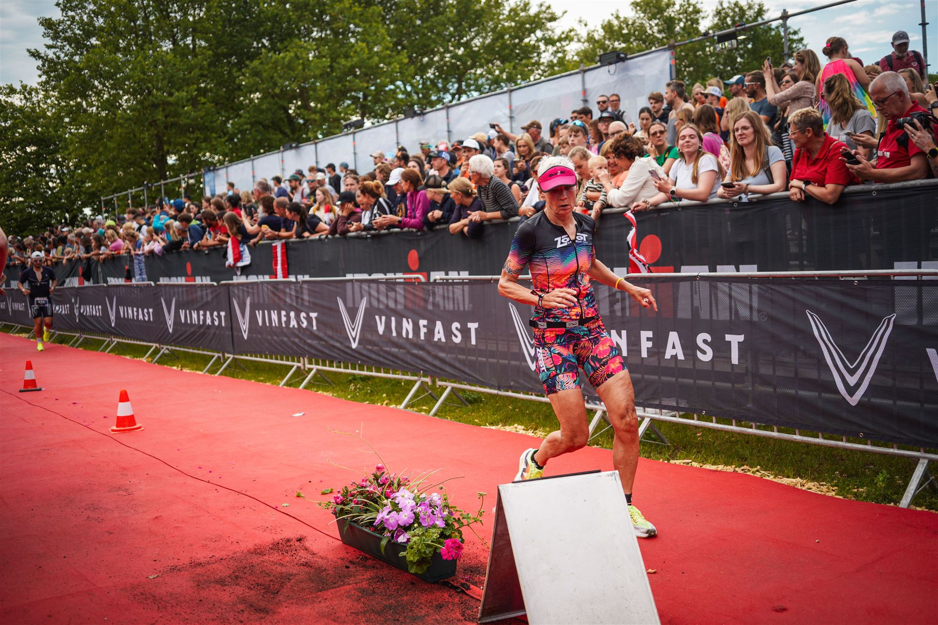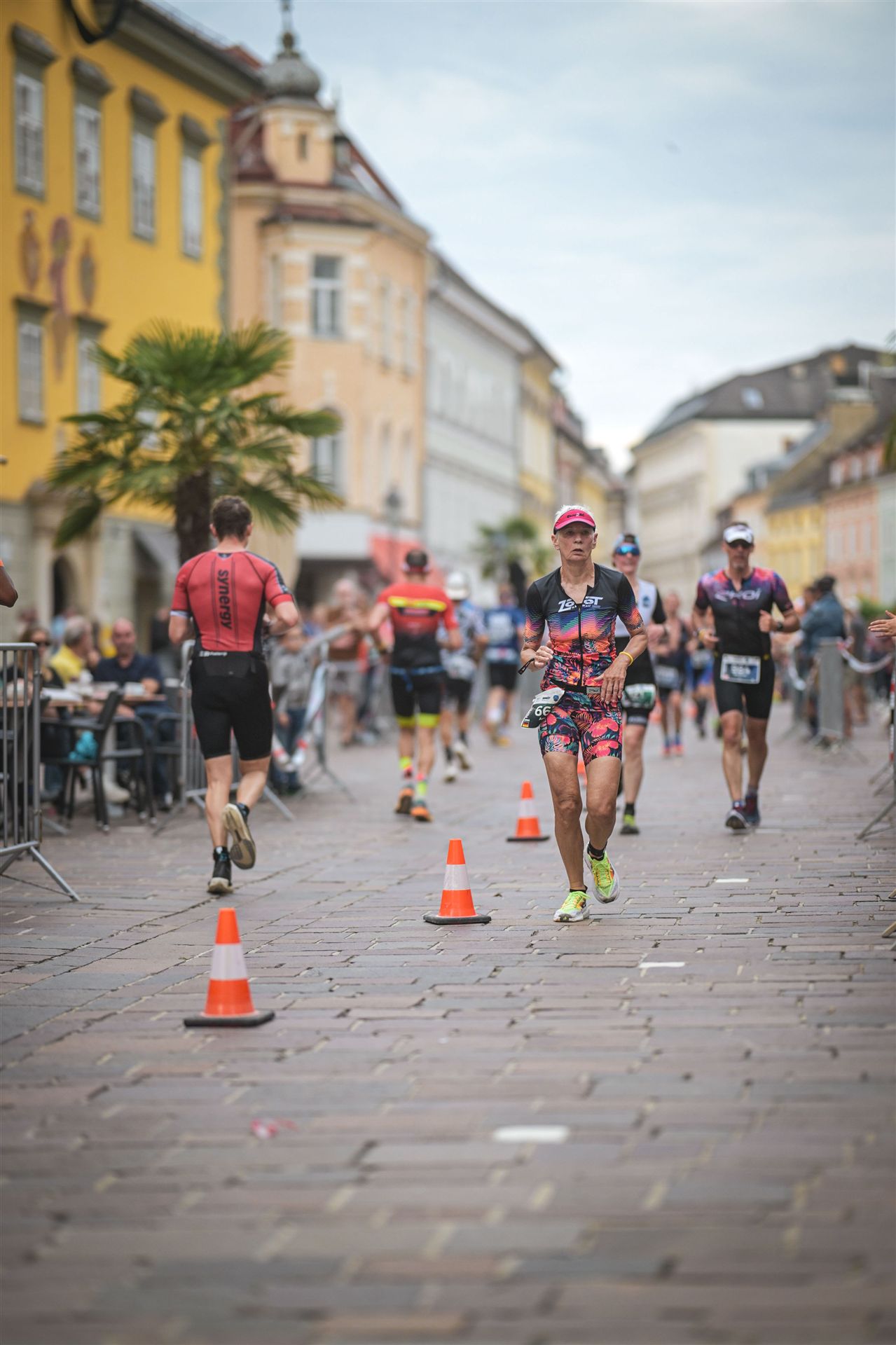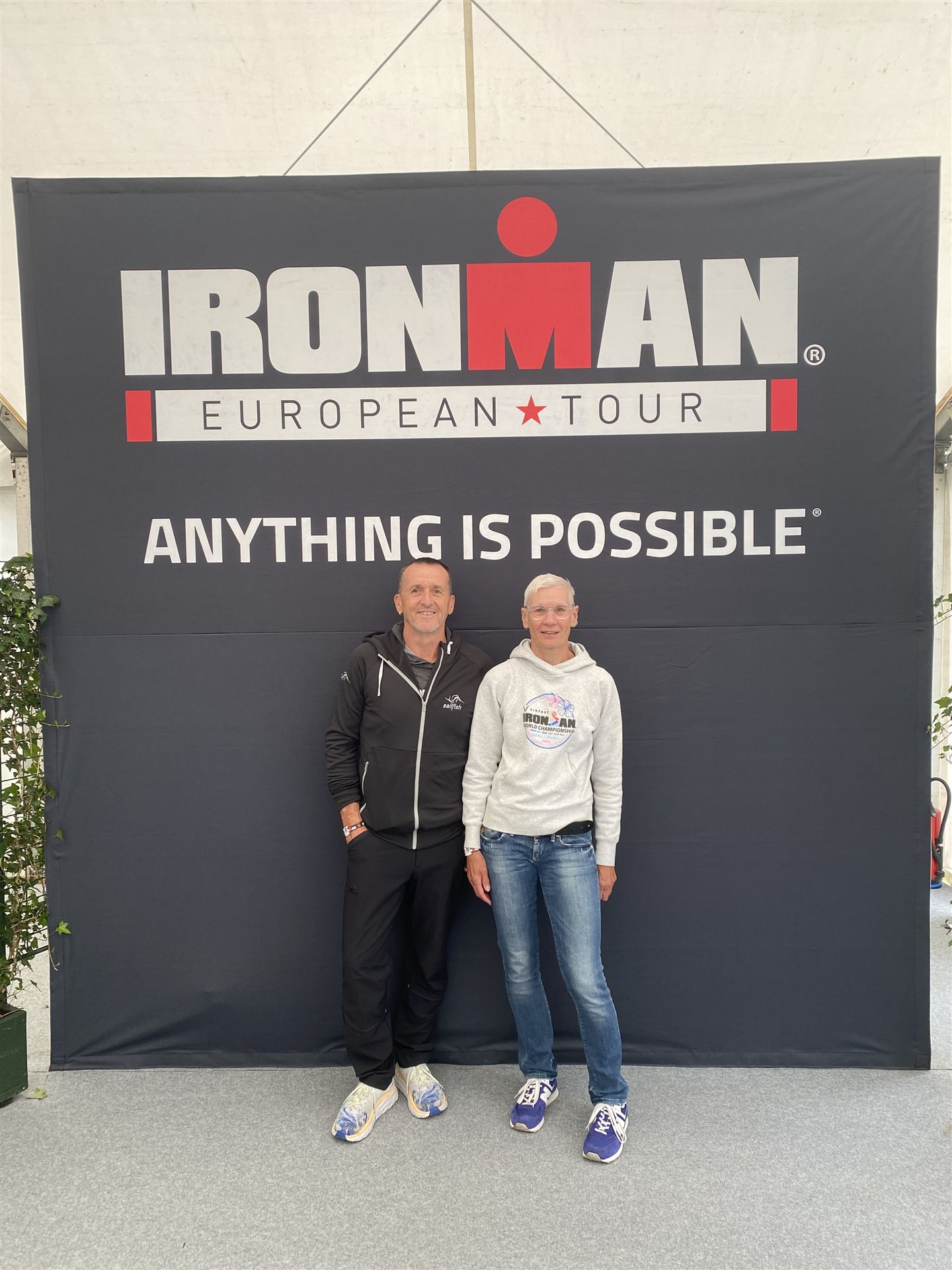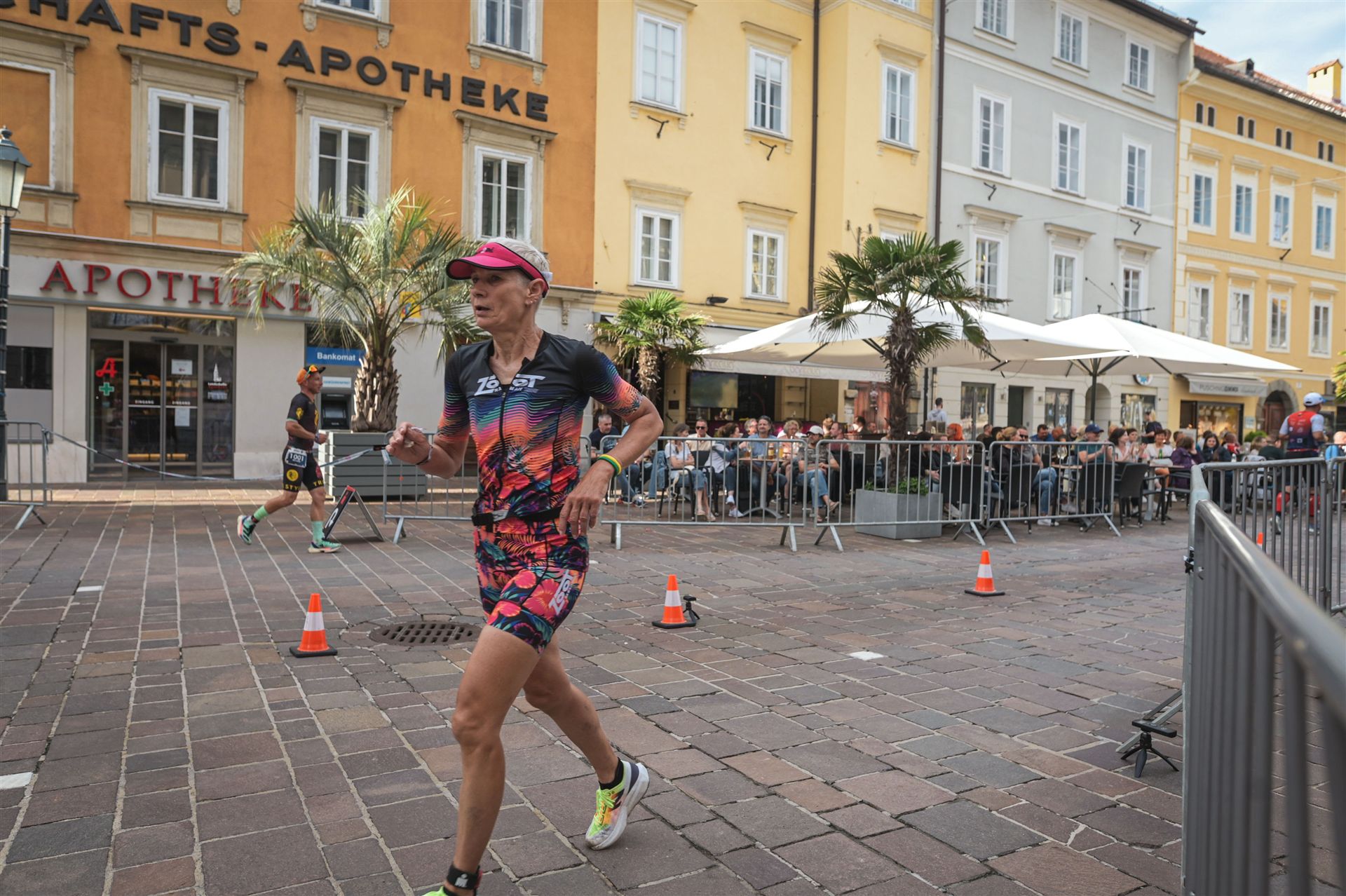 Ab in die Wechselzone und die Radschuhe mit den Laufschuhen tauschen. Aufgrund der Temperatur entscheide ich mich, mein Trikot anzulassen. Ich gehe als erste Frau in meiner AK mit einem Vorsprung von circa 18 Minuten auf die Laufstrecke. Nach dem ersten Kilometer geht es mir nicht so gut, ich fühle mich schlapp. Das kenne ich überhaupt nicht von mir. Anscheinend habe ich auf dem Rad nicht ausreichend gegessen. Normalerweise kann ich nach dem Rad direkt ohne Probleme los laufen, dieses Mal habe ich Probleme. Ich entscheide mich bis zur ersten Verpflegungsstelle Gehpausen einzulegen. An der ersten Verpflegungsstelle bin ich vorbei gelaufen, keine Ahnung weshalb. Das ist Wettkampf, da passieren solche Dingen. Bei der 2. Verpflegungsstelle nehme ich mir etwas Zeit und esse und trinke ordentlich. Danach geht es mir viel besser. Nach den ersten 10 Kilometern konnte ich meinen Vorsprung auf die Zweite bereits etwas ausbauen. Ich halte bei jeder Verpflegungsstelle an und nehme Flüssigkeit bzw. Gel zu mir. Der Vorsprung wird immer größer. Werner hält mich auf dem Laufenden. Ab circa Kilometer 32 habe ich Probleme mit der Verpflegung. Ich kann nichts mehr aufnehmen, mein Magen rebelliert. Ich entscheide spontan, dass ich es mit Cola probiere. Die Strategie geht auf, mein Magen rebelliert nicht mehr. Da ich bereits einen Vorsprung von über 45 Minuten auf den letzten 10 Kilometern habe gehe ich auf Nummer sicher. Ich nehme nur noch Cola zu mir und lege die ein- oder andere Gehpause ein. Ich bin zuversichtlich als Erste ins Ziel zu kommen. Bei Kilometer 39 bin ich schon leicht euphorisch, laufe jedoch weiter verhalten. Kein unnötiges Risiko eingehen. Bei Kilometer 41 fange ich an innerlich zu jubeln. Auf dem letzten Kilometer sind alle Probleme vergessen, es geht in Richtung Ziel. Der Zieleinlauf ist für jeden Athleten etwas Besonderes. Direkt im Ziel wartet bereits Werner auf mich und überreicht mir die Finisher Medaille. Das ist ein toller Moment. Natürlich habe ich, wie immer, vergessen auf meine Endzeit zu schauen. Wichtig für mich ist, ins Ziel zu kommen. Natürlich freut man sich, wenn dann noch eine gute Zeit bzw. Platzierung raus komm. Den Marathon bin ich in einer Zeit von 4:13:33 gelaufen. Meine Gesamtzeit beträgt 11:51:30 Stunden. Wahnsinn, ich bin total begeistert mit dieser Zeit gefinisht zu haben. Die Zweite in meiner AK kommt erst 1:17 Stunden nach mir ins Ziel. Es ist toll wieviel Zeit ich noch rauslaufen konnte. Es war wieder ein tolles Erlebnis in Klagenfurt und ich bin dankbar bei diesem Jubiläum dabei sein zu können. Nach dem Wettkampf gibt es noch eine Woche Urlaub und Erholung, danach geht der Focus auf die Weltmeisterschaft in Nizza.